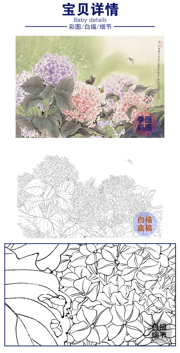 横幅工笔花鸟白描底稿-张克齐-绣球花-A514