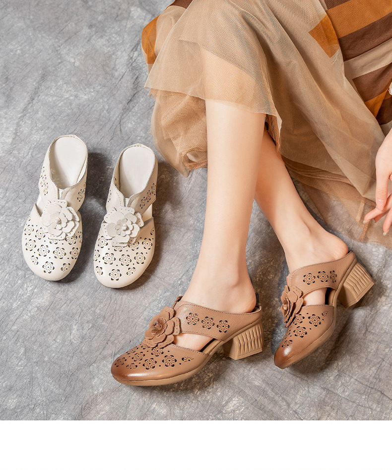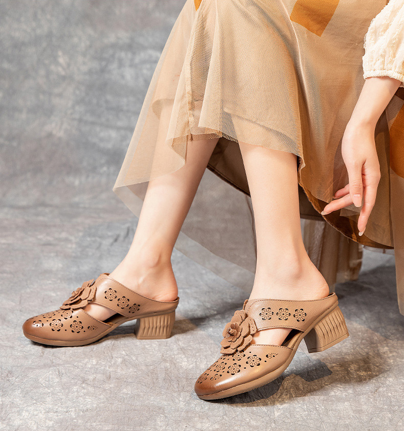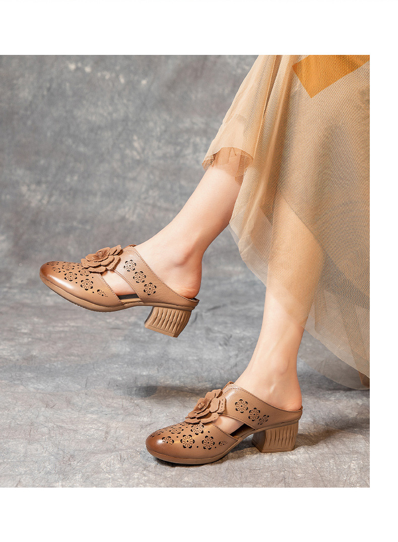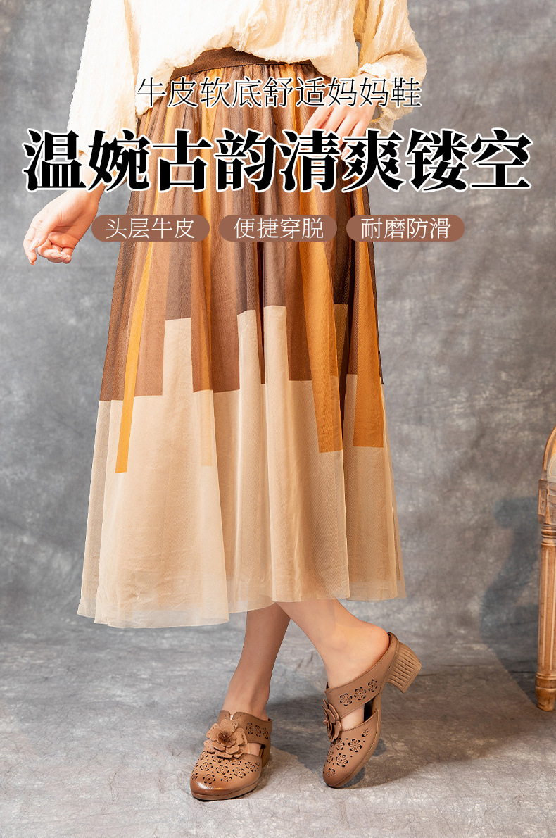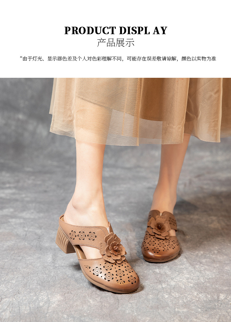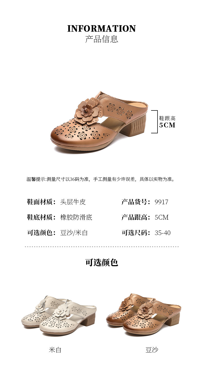 MLD-9917民族风粗高跟包头凉拖女夏牛皮镂空中年凉鞋舒适花朵拖鞋