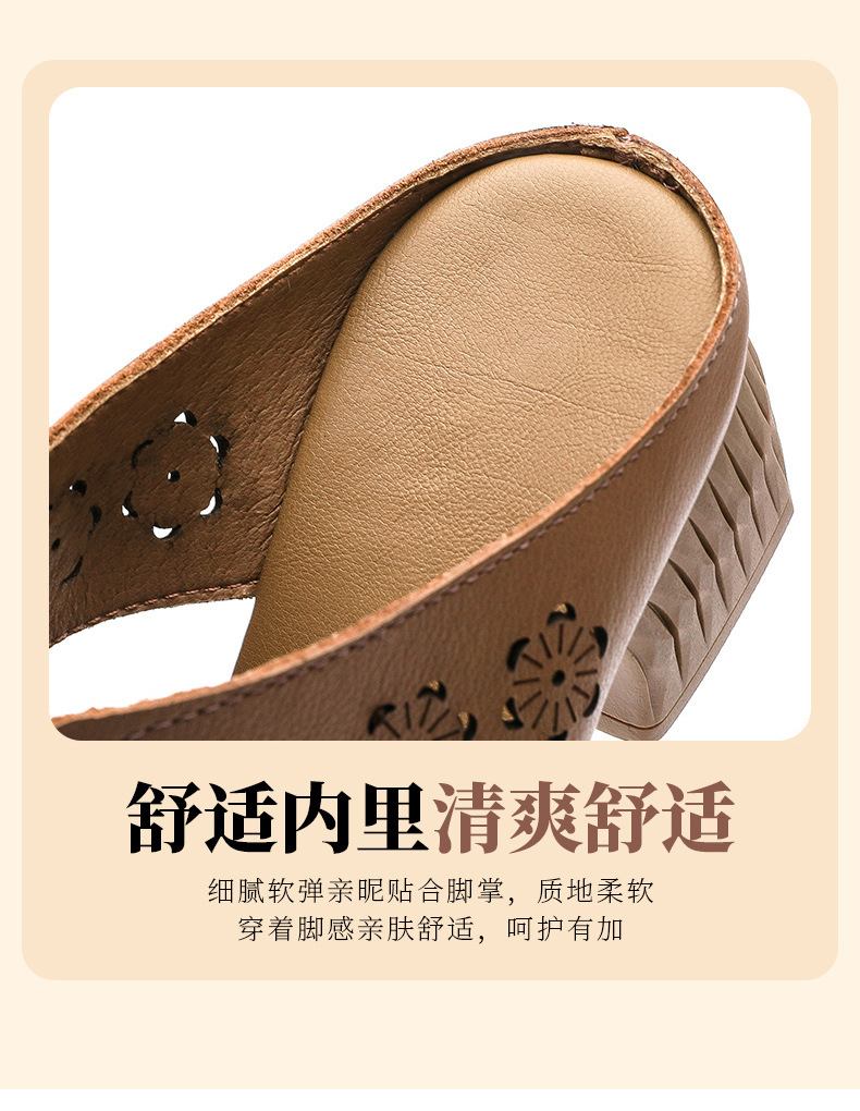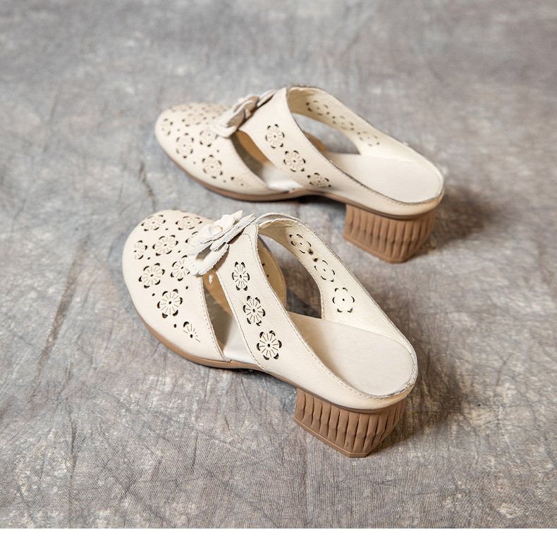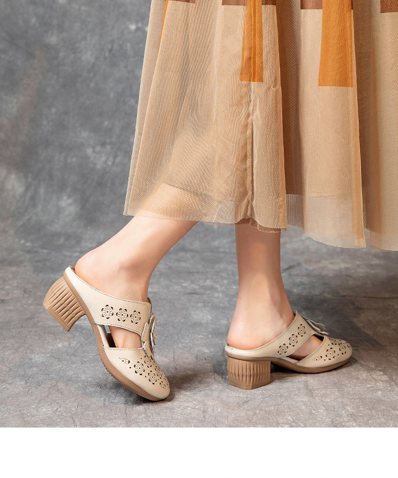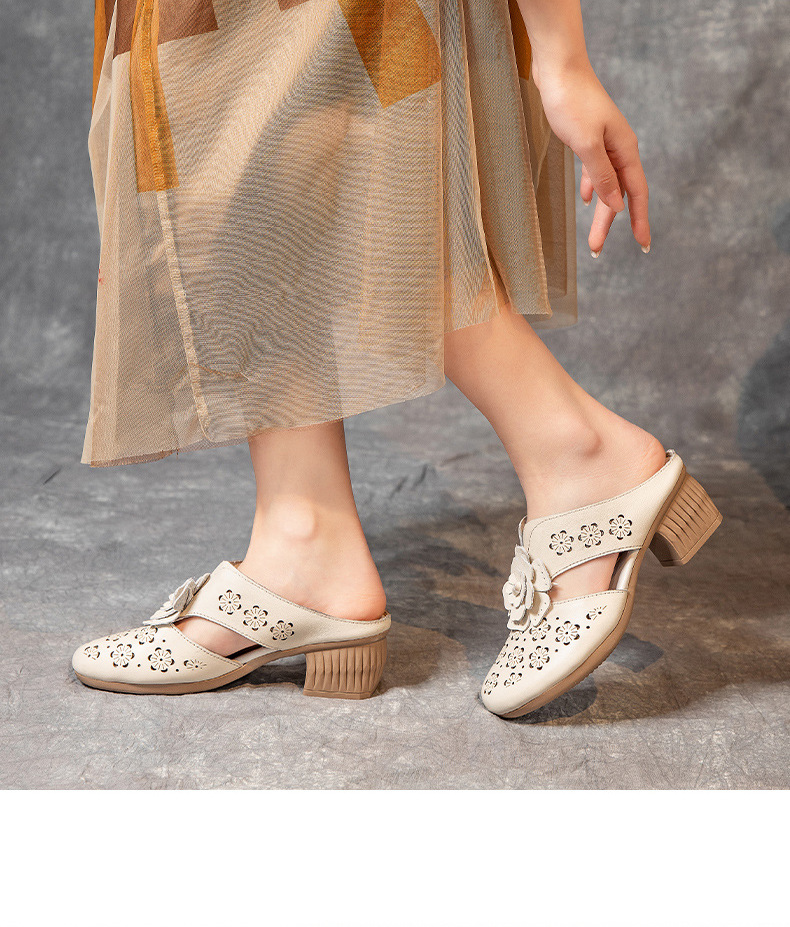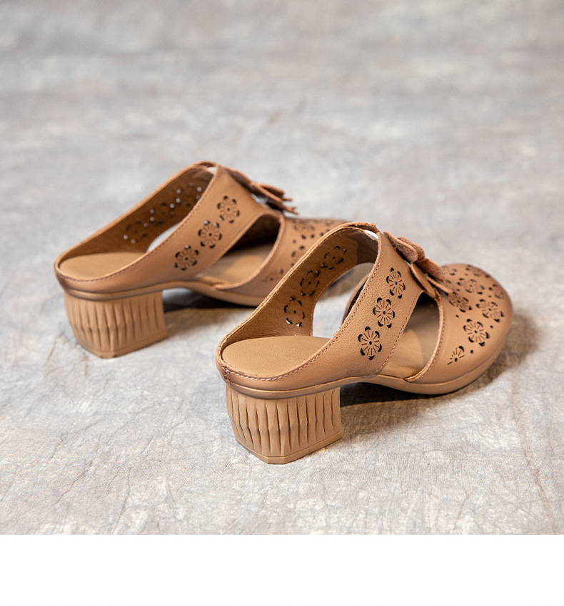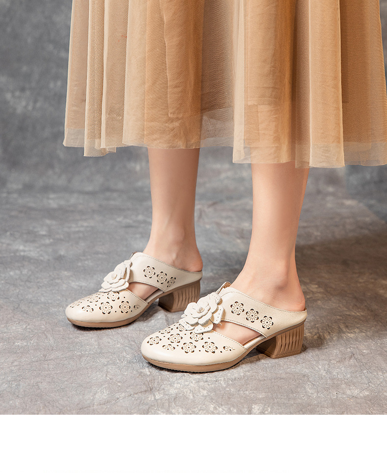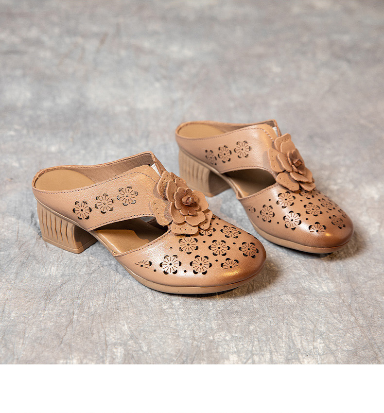 MLD-9917民族风粗高跟包头凉拖女夏牛皮镂空中年凉鞋舒适花朵拖鞋