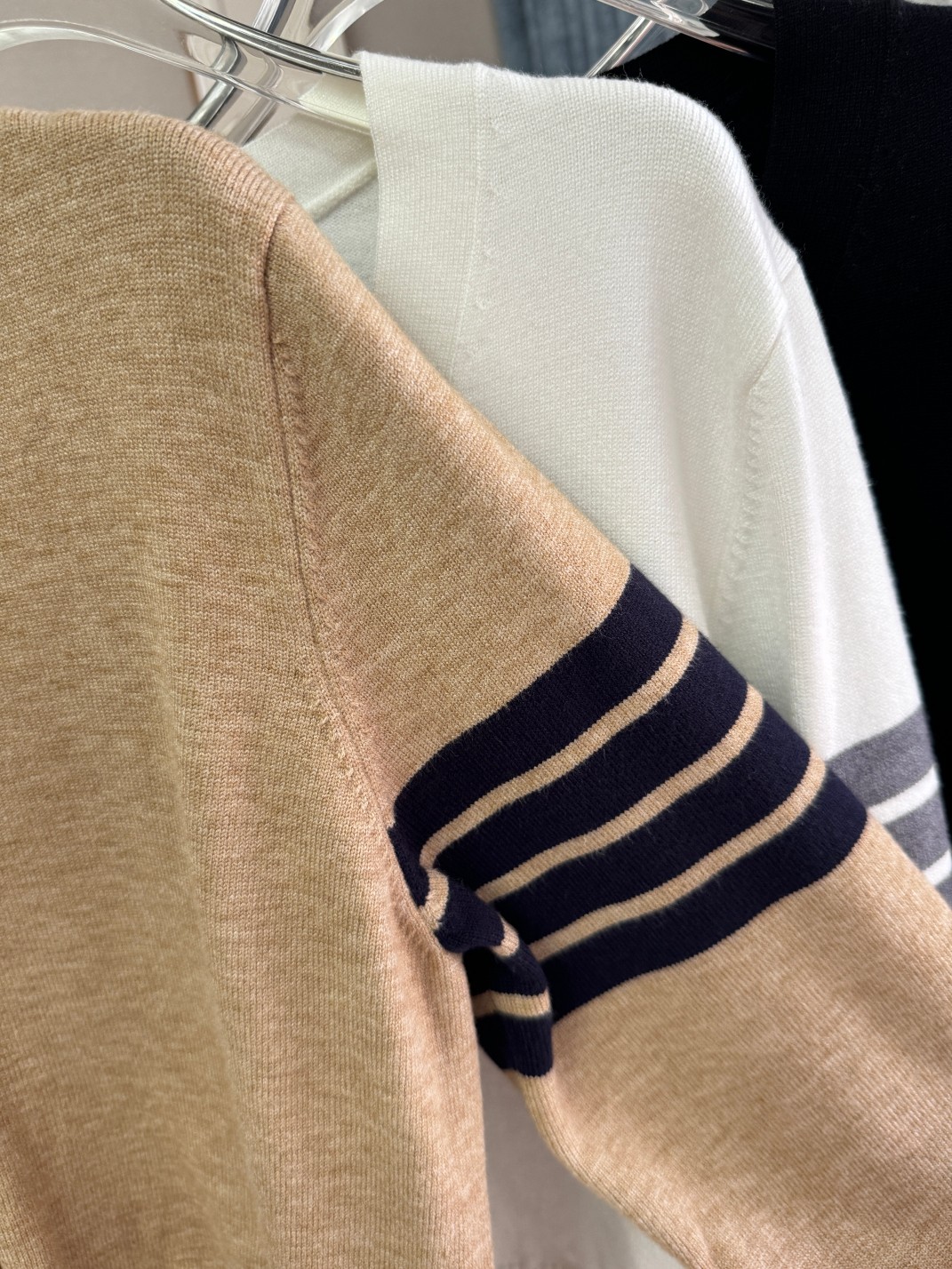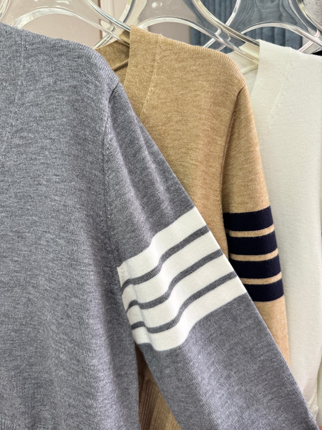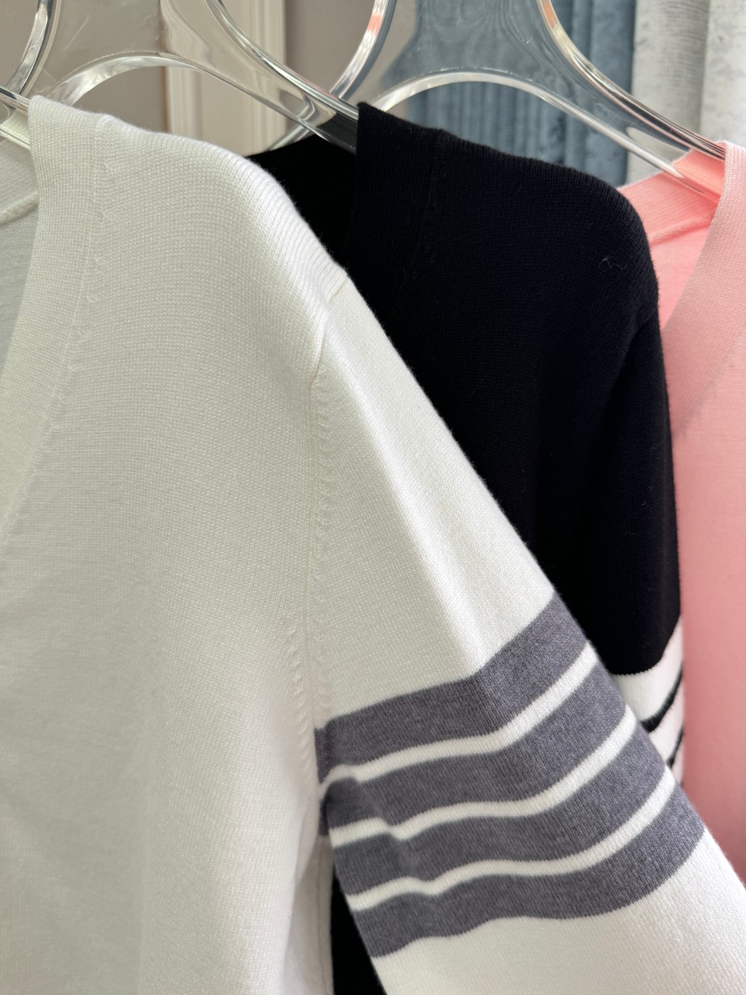 点此购买 TB春秋季女士经典学院风净版袖条V领针织毛衣开衫 mp 342361