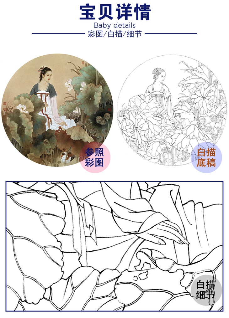 王美芳工笔传统仕女人物白描底稿《圆光之二》-圆面小品-多种白描尺寸可选-B160