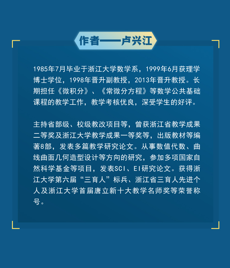 1985年7月毕业于浙江大学数学系,1999年6月获理学博士学位,1998年晋升副教授,2013年晋升教授。长期担任《微积分》、《常微分方程》等数学公共基础课程的教学工作,教学考核优良,深受学生的好评。主持省部级、校级教改项目等,曾获浙江省教学成果二等奖及浙江大学教学成果一等奖等,出版教材等编著8部,发表多篇教学研究论文。从事数值代数、曲线曲面几何造型设计等方向的研究,参加多项国家自然科学基金等项目,发表SCI、EI研究论文。获得浙江大学第六届“三育人”标兵、浙江省三育人先进个人及浙江大学首届唐立新十大教学名师奖等荣誉称号。