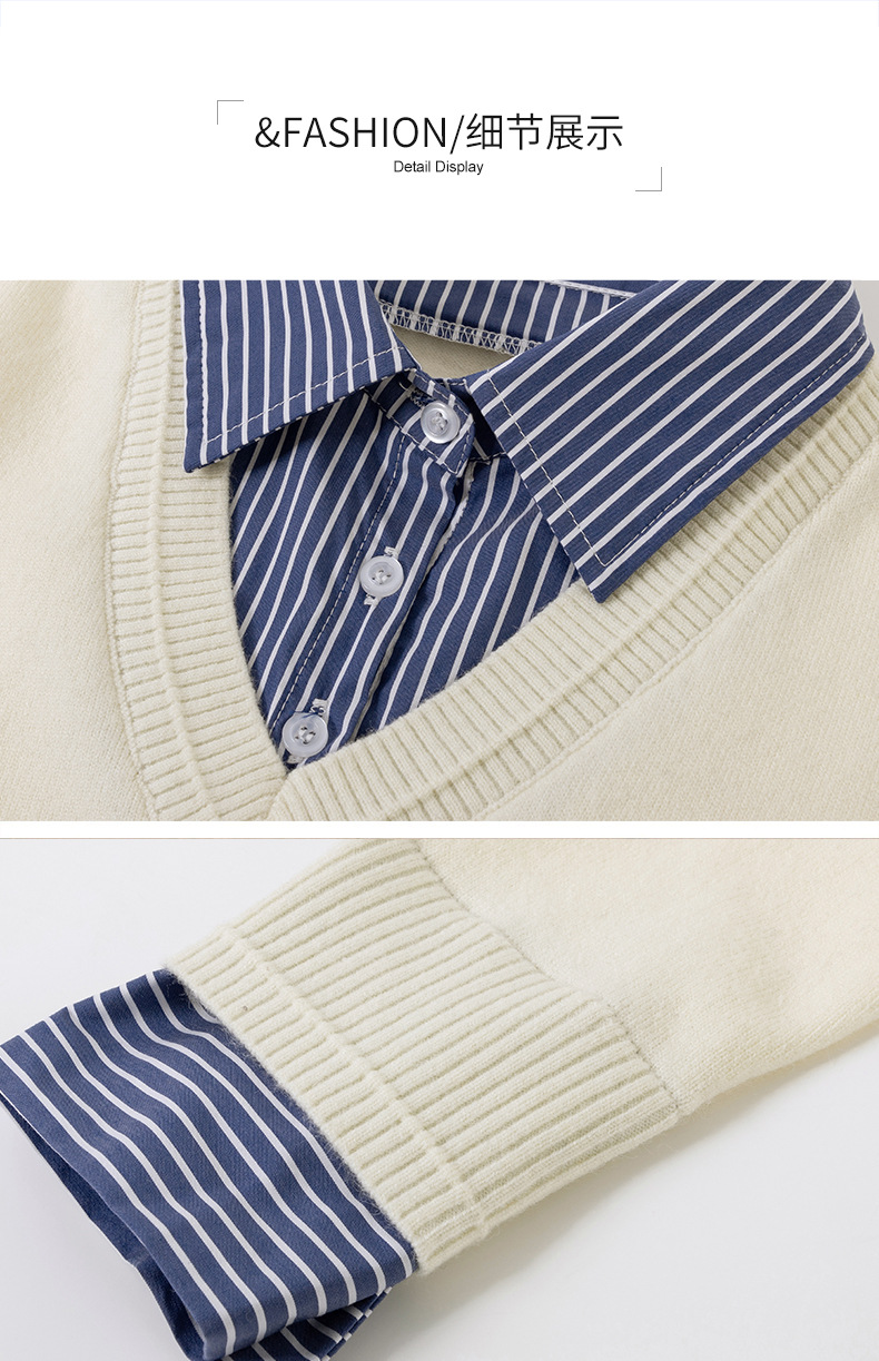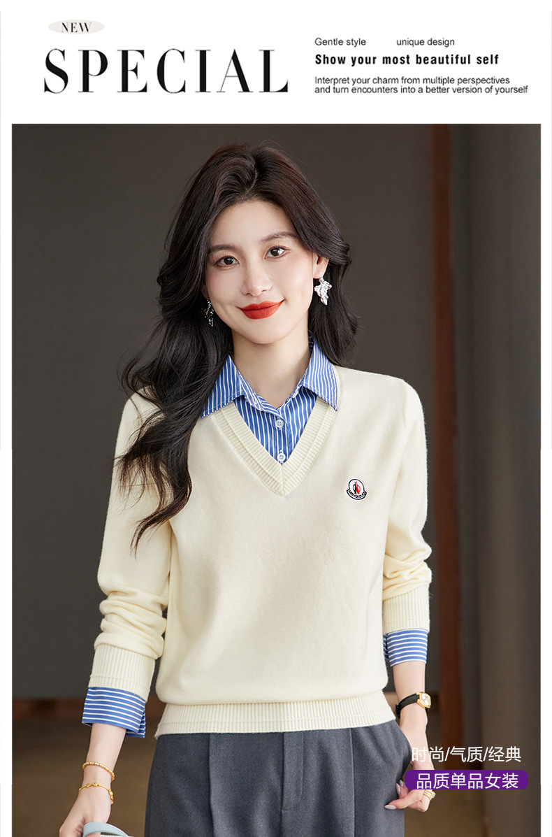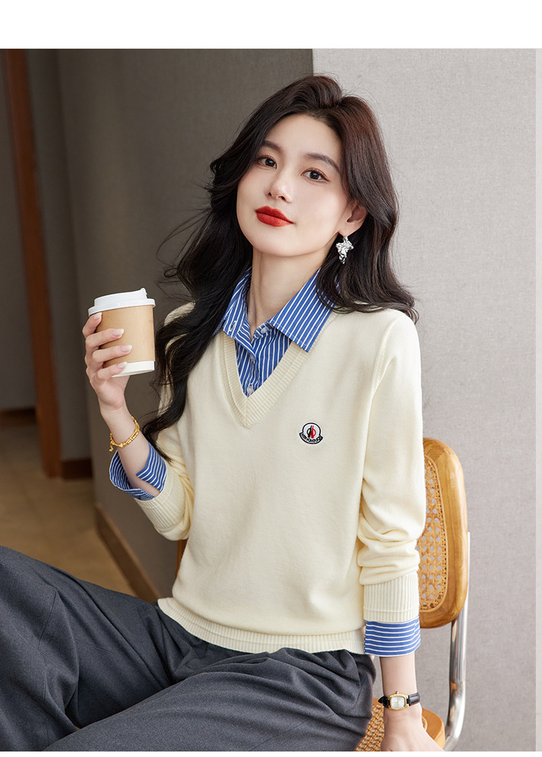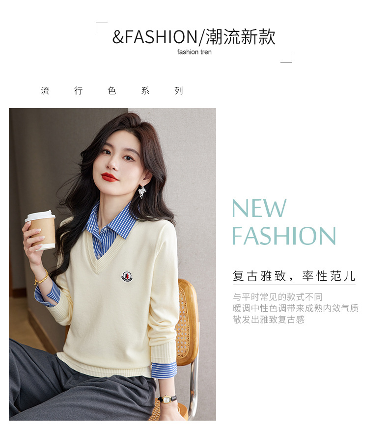 CC时尚洋气衬衣领假两件毛衣女2025年春秋新款针织设计感撞色打底衫