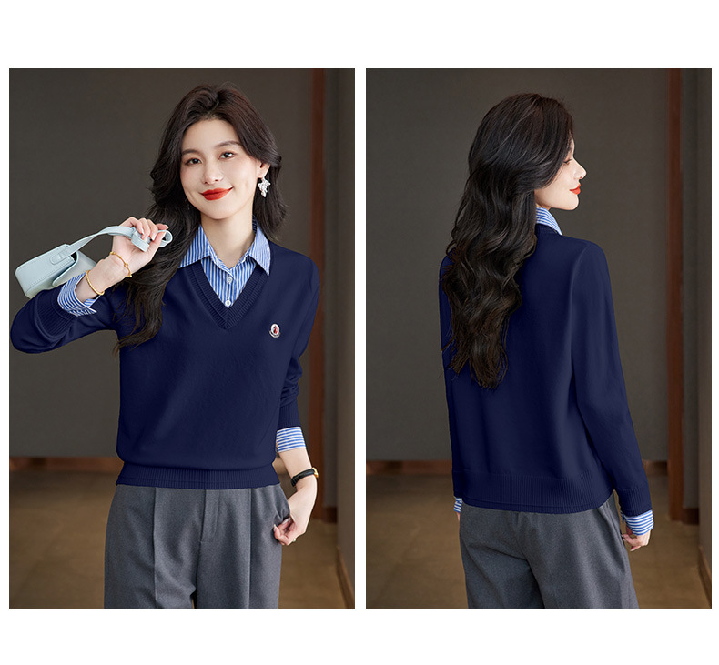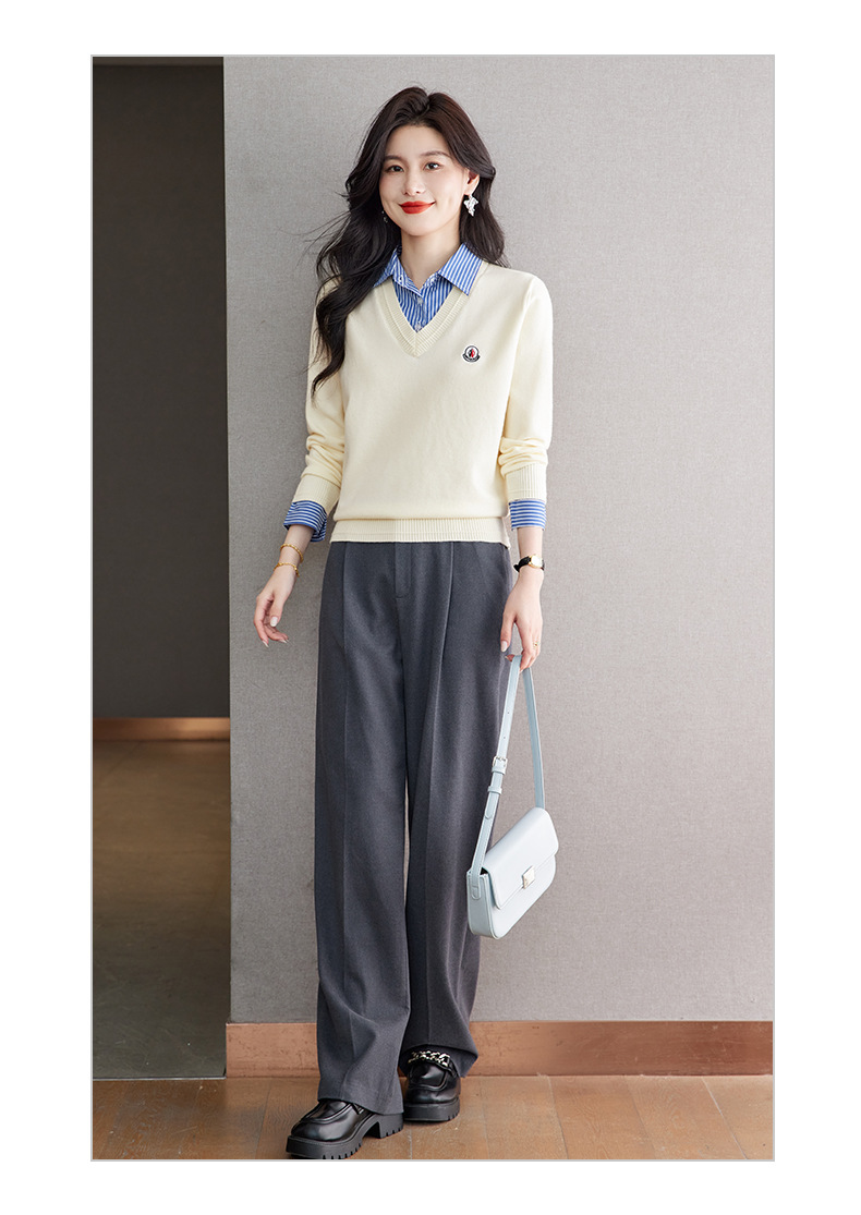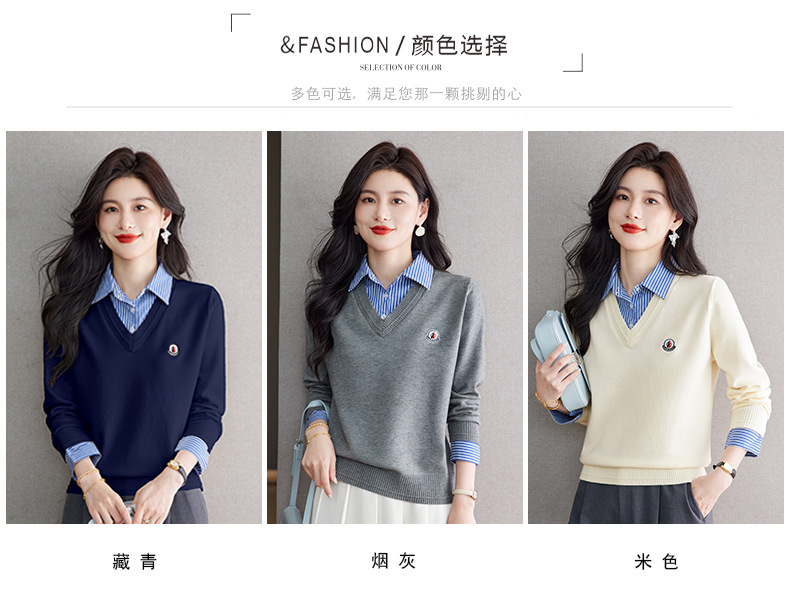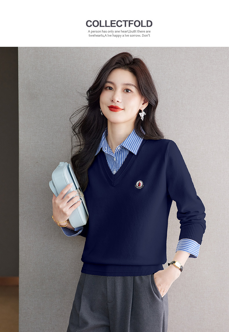 CC时尚洋气衬衣领假两件毛衣女2025年春秋新款针织设计感撞色打底衫