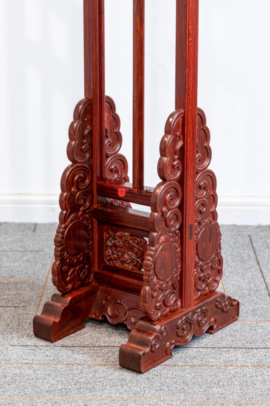 底部采用座屏风的造型,左右雕卷草纹墩木上植立柱,前后用锼刻卷云纹伴日站牙抵夹,柱间施横枨二道,嵌装透雕云纹绦环板,其下安卷草纹披水牙子。