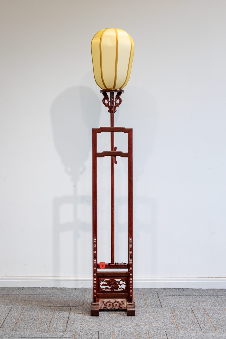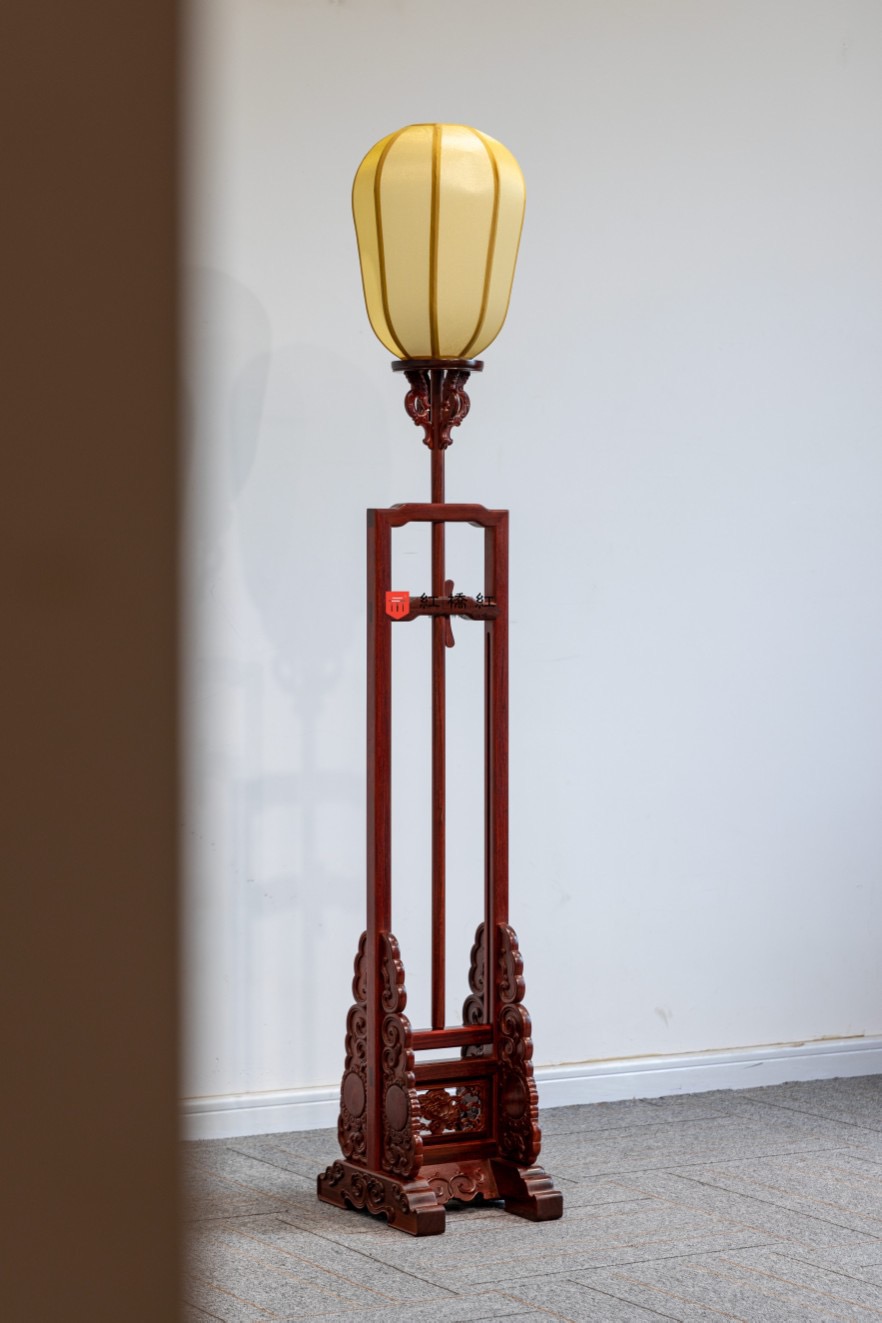灯台上端安圆盘,上承灯笼,盘下有倒挂透雕螭龙纹牙四块;两根立柱顶端和罗锅形的横梁相连,其下还有同样是罗锅形横枨一道。横梁与横枨钧正中开圆孔,中插灯杆。灯杆下安横木,成倒T字形;横木两端纳入两根立柱内侧的长槽中。故灯杆可上提或下落,随意调整高度。原款横木设铜插销凿眼固定,今改为木楔挤塞式单手可调固定灯杆高度。