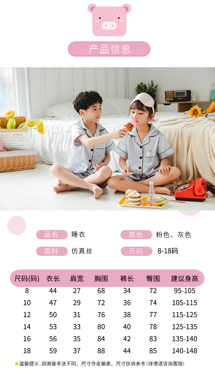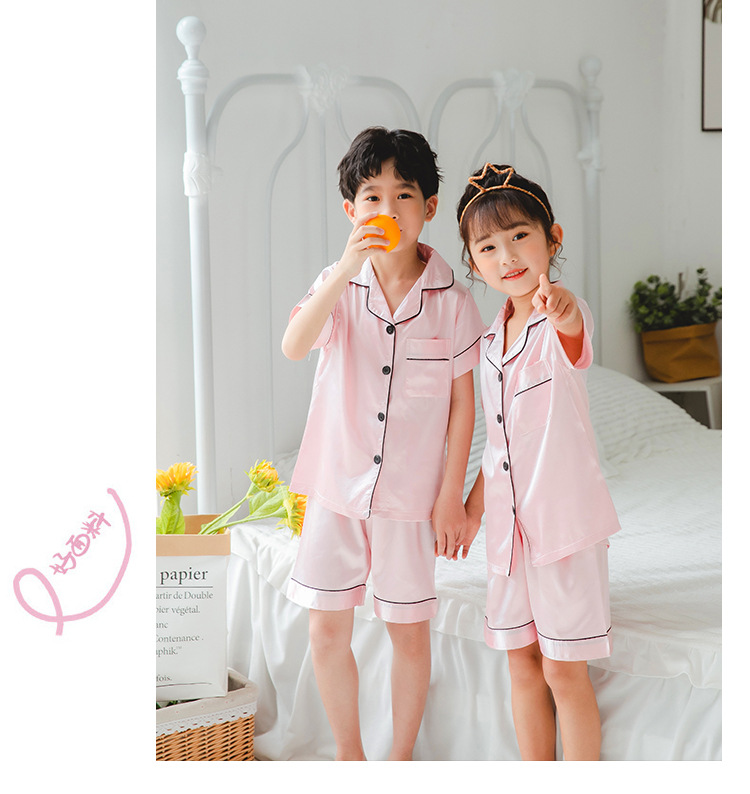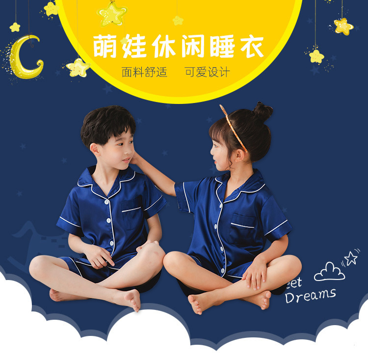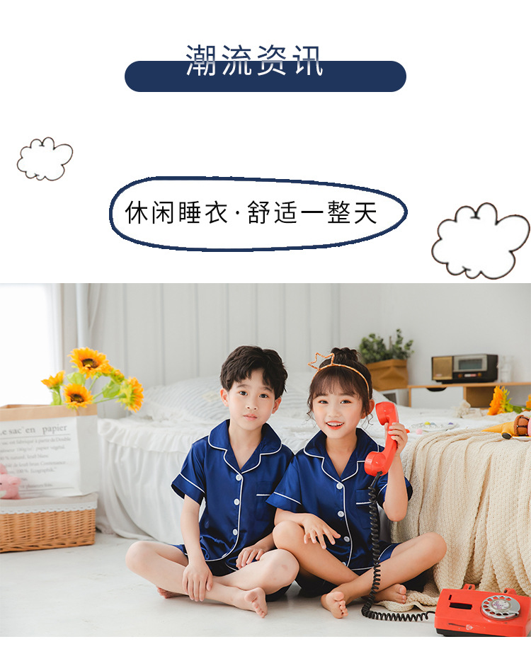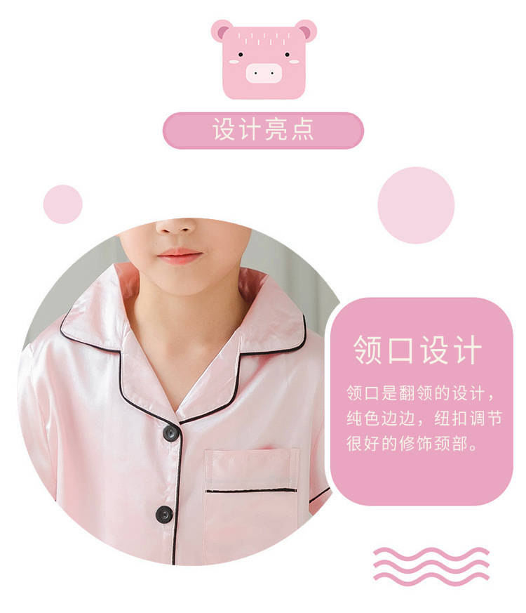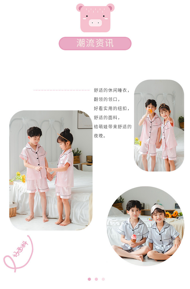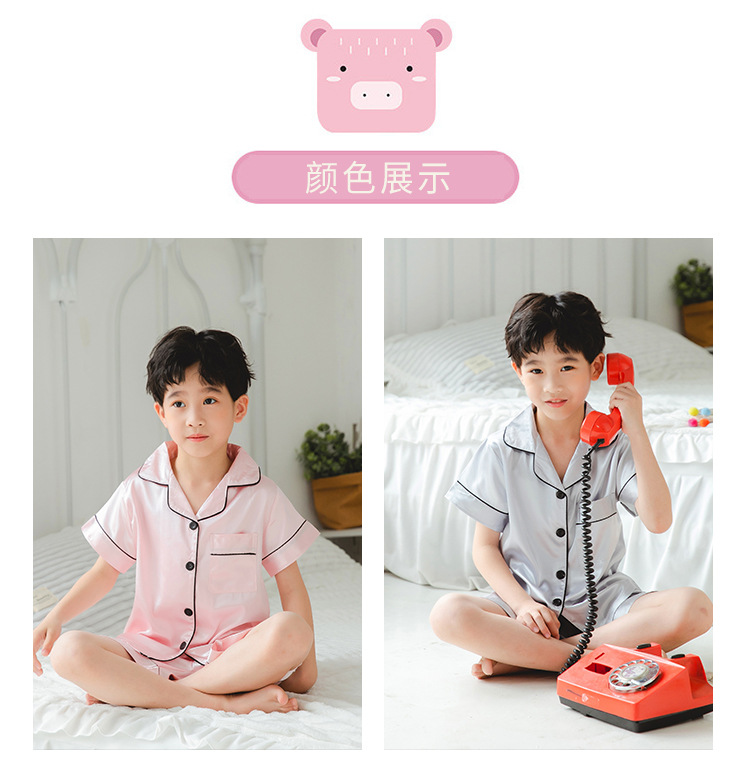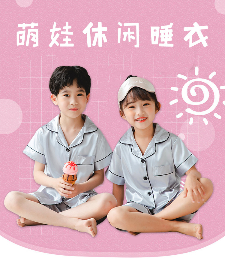 【萌娃休闲睡衣,面料舒适,可爱设计】高密仿真丝 秋季长袖长裤四季款 儿童夏季睡衣短袖短裤 小翻领纯色可爱 中小童家居服简约-QQ