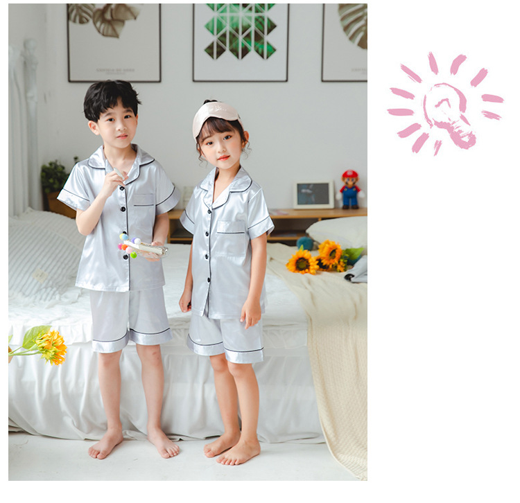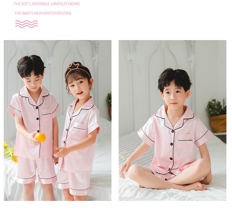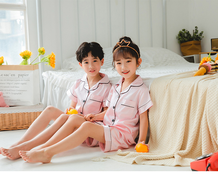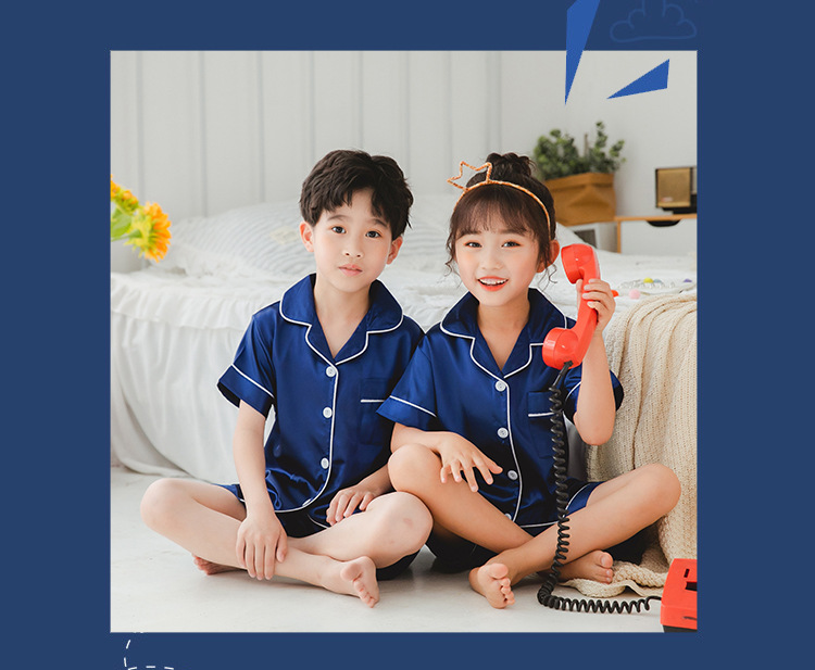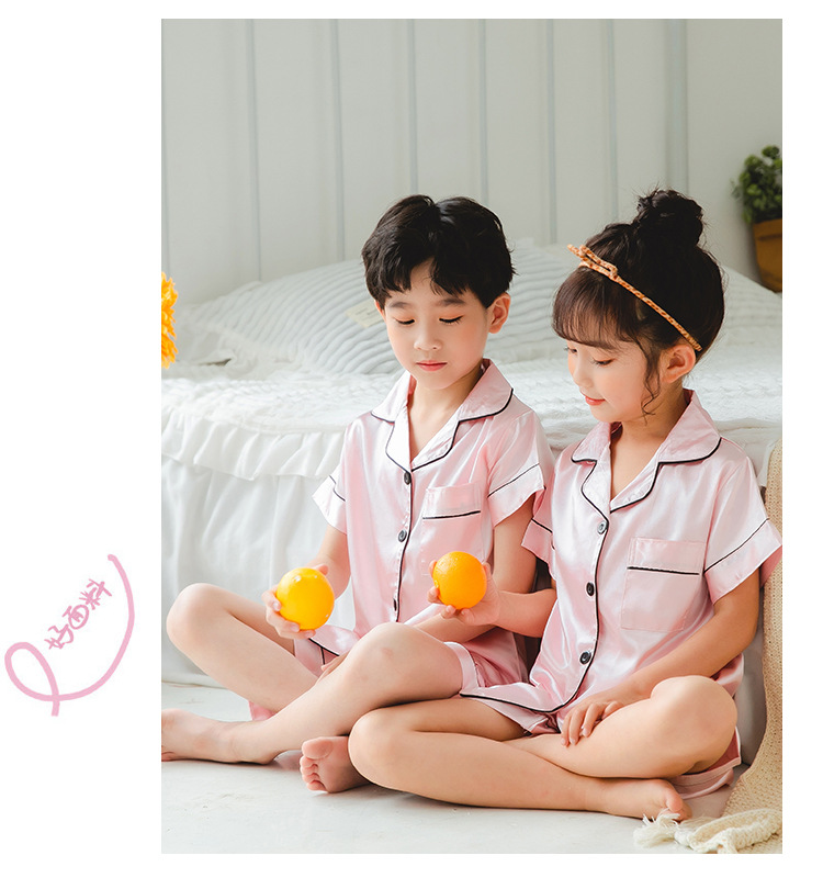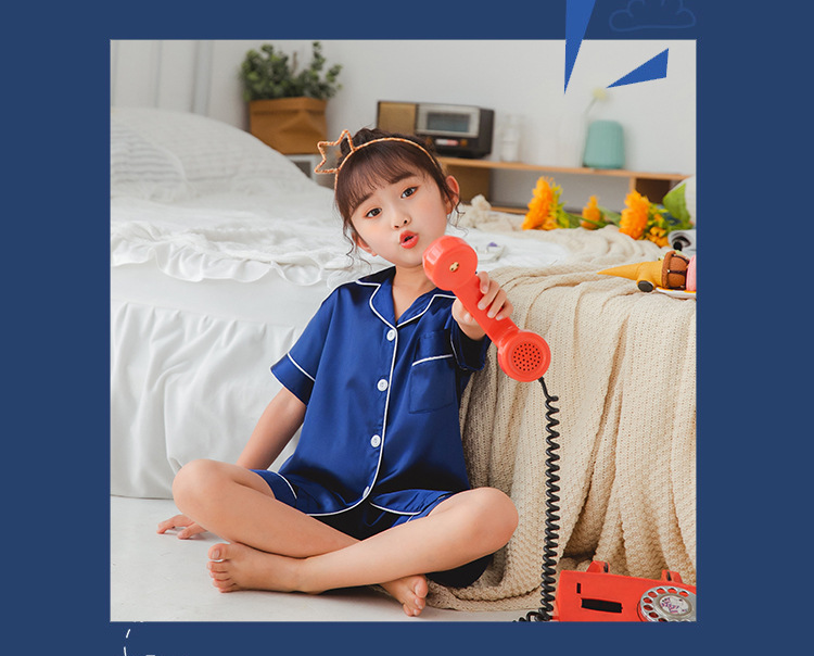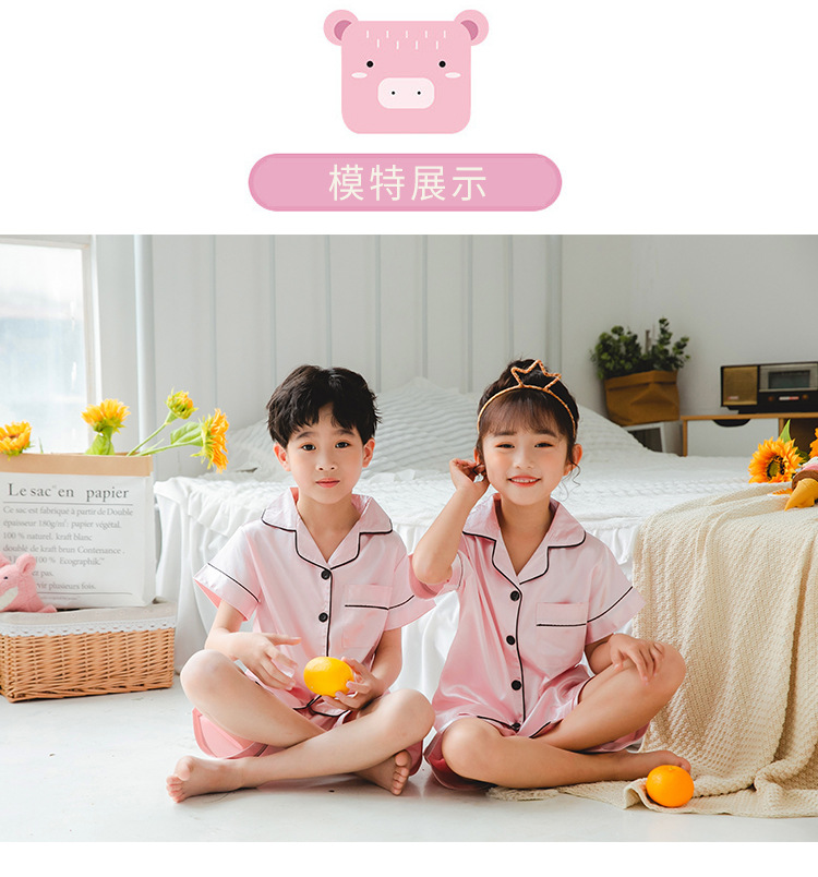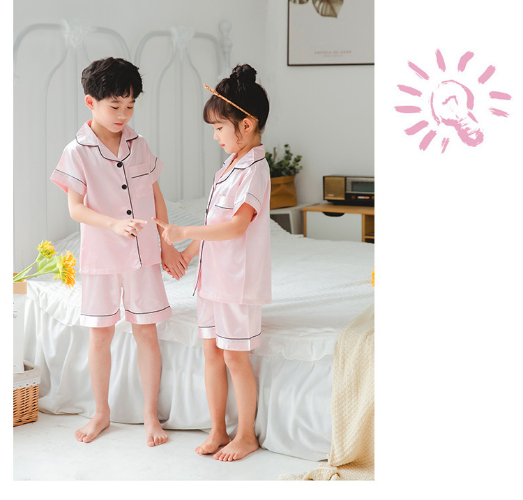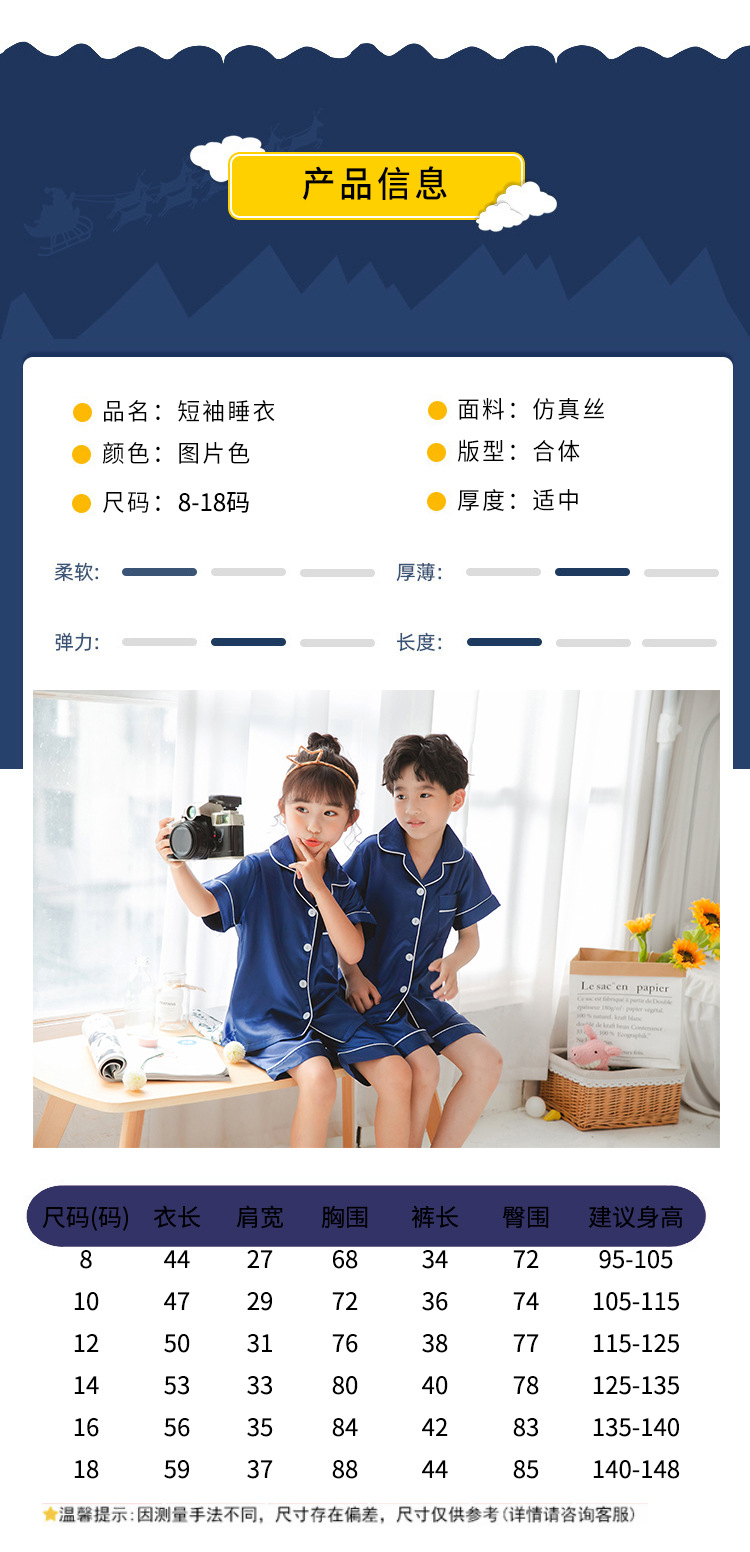 【萌娃休闲睡衣,面料舒适,可爱设计】高密仿真丝 秋季长袖长裤四季款 儿童夏季睡衣短袖短裤 小翻领纯色可爱 中小童家居服简约-QQ