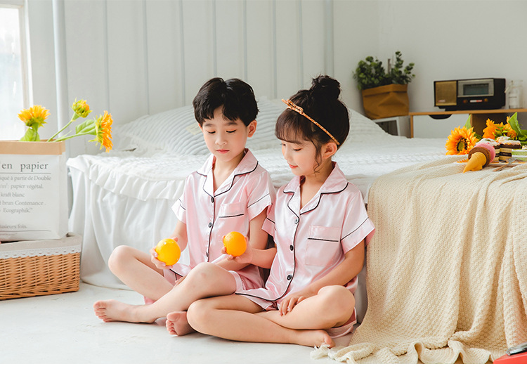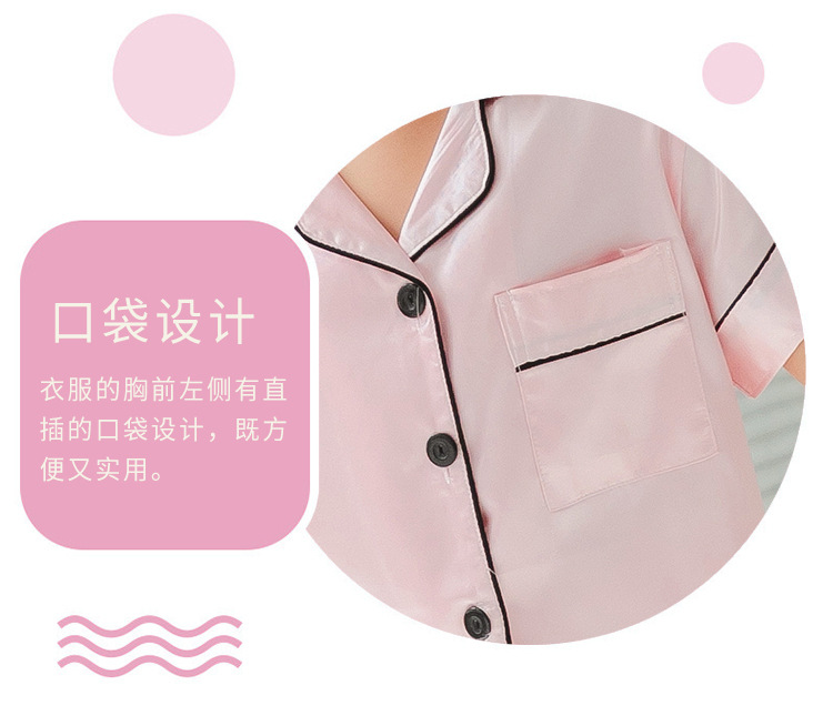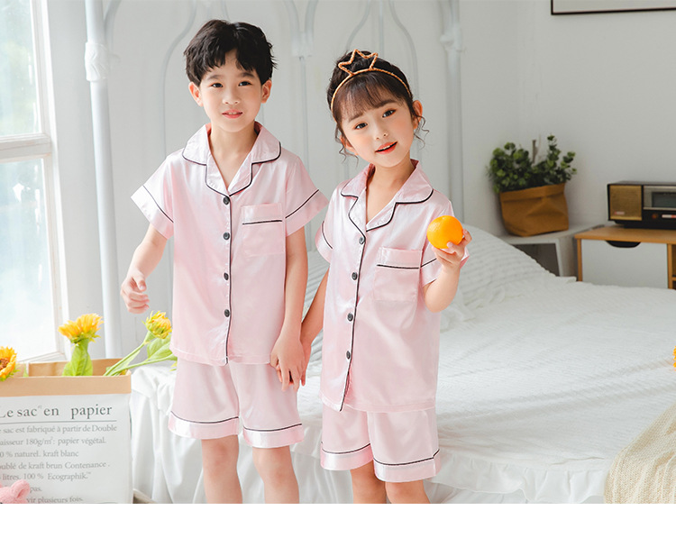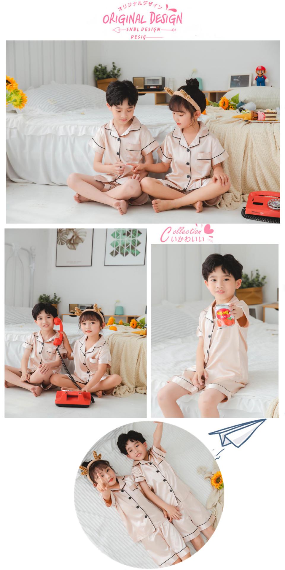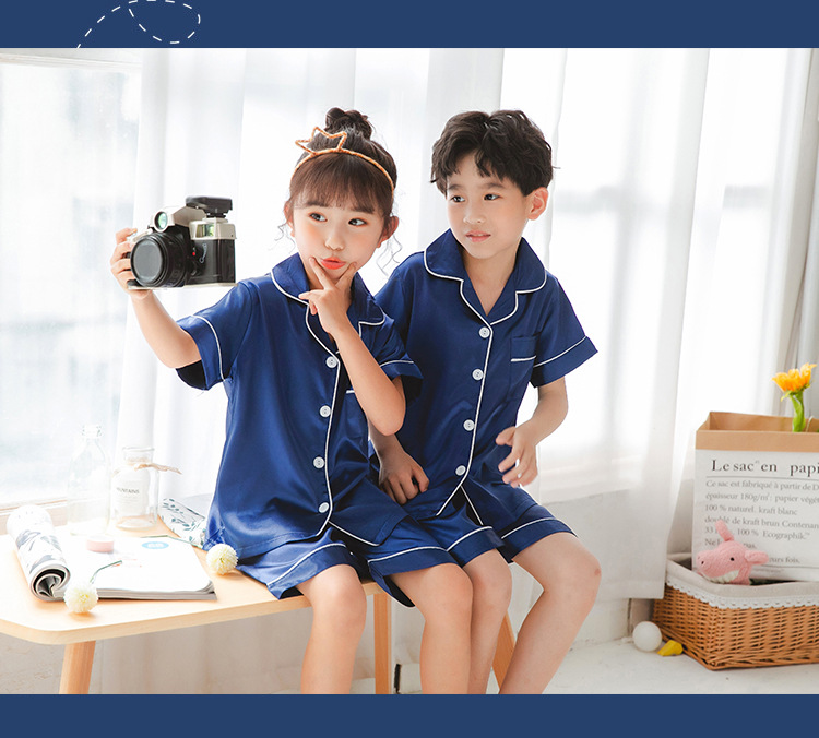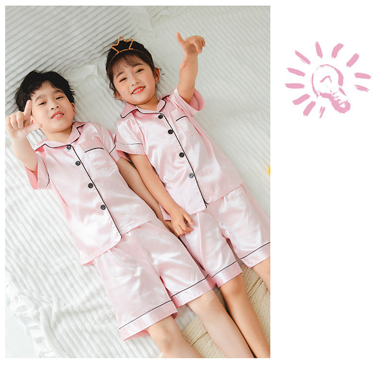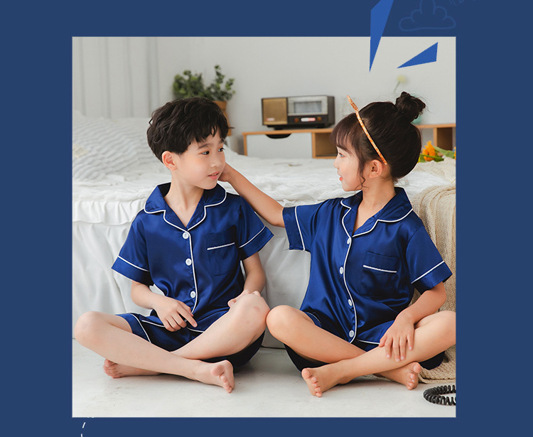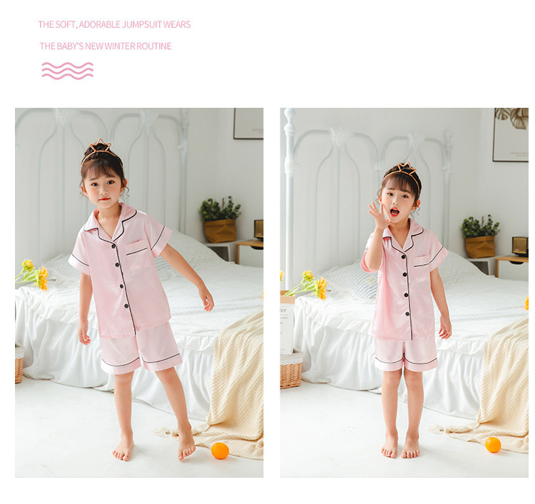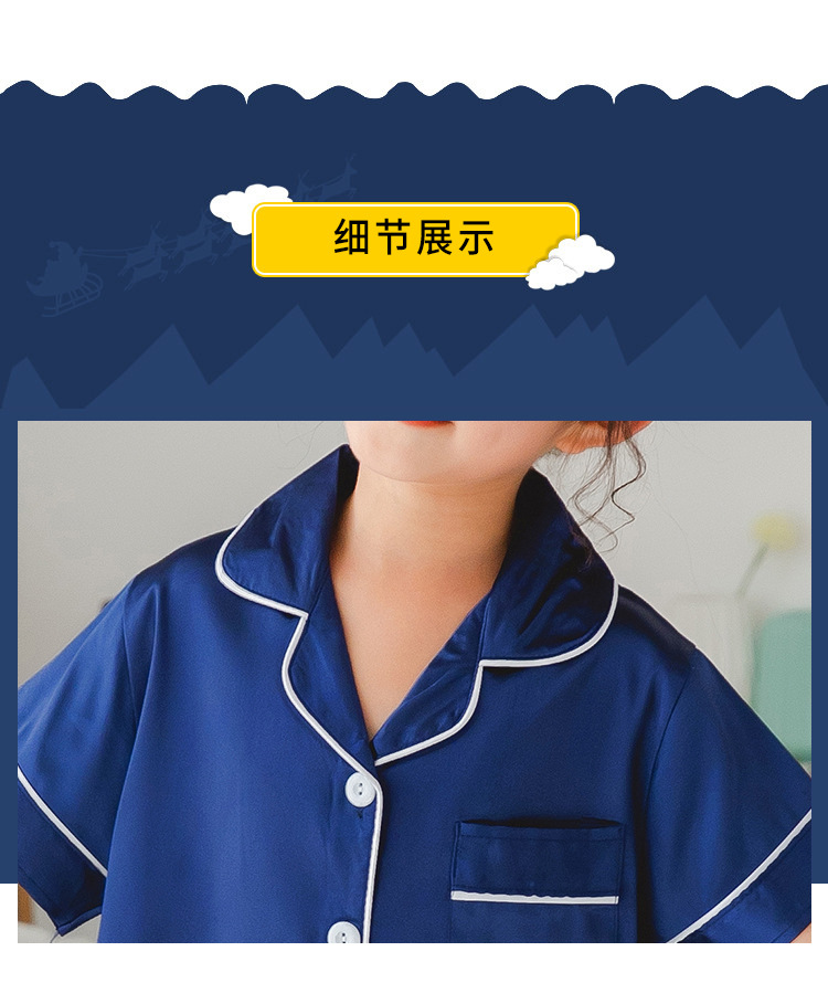 【萌娃休闲睡衣,面料舒适,可爱设计】高密仿真丝 秋季长袖长裤四季款 儿童夏季睡衣短袖短裤 小翻领纯色可爱 中小童家居服简约-QQ