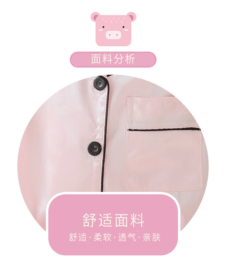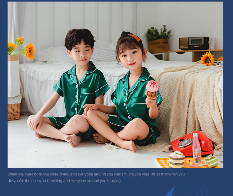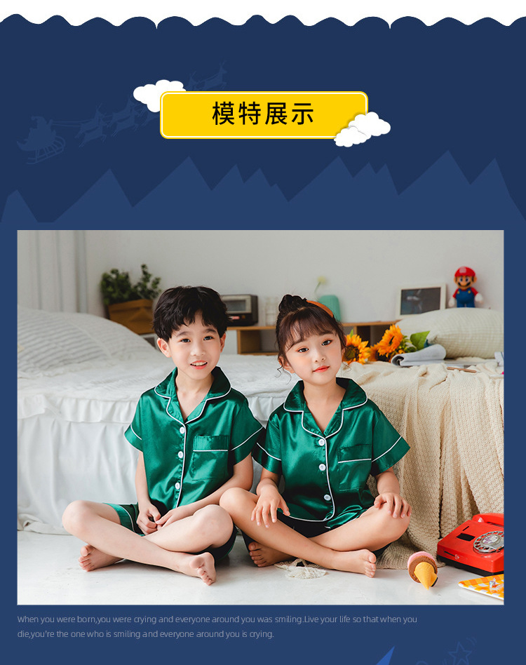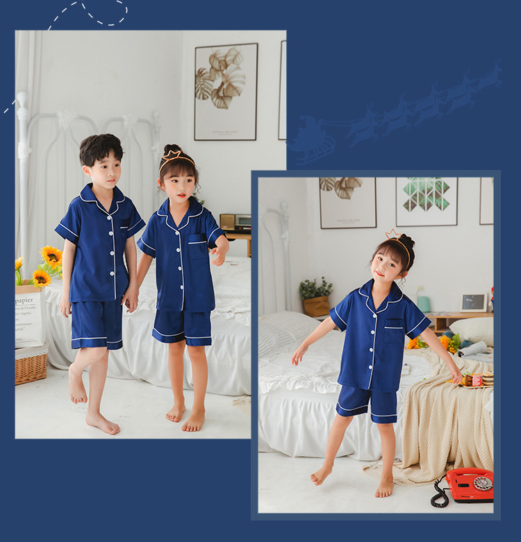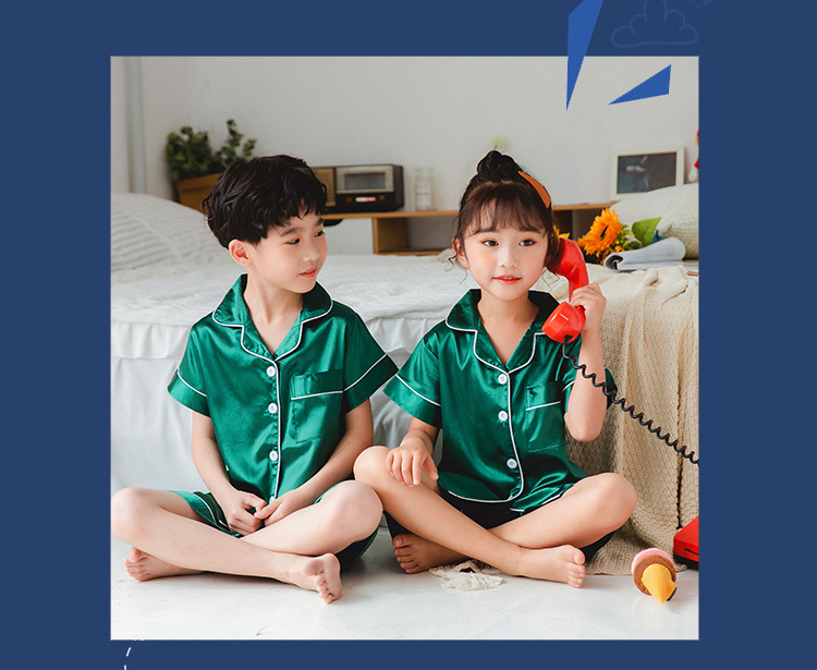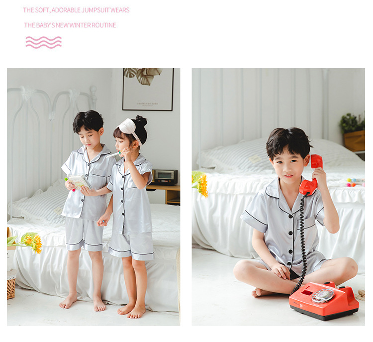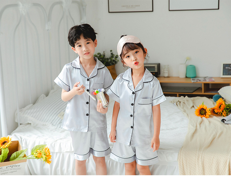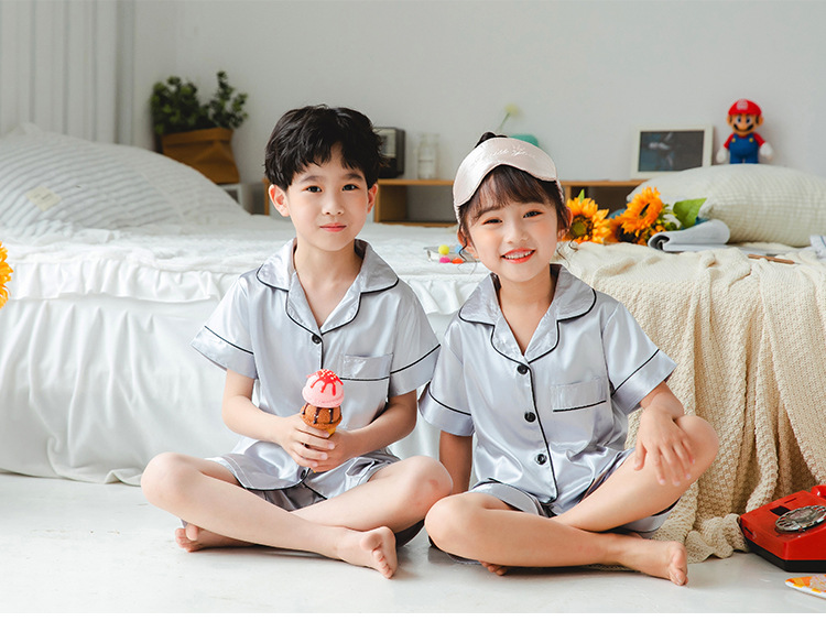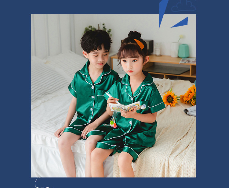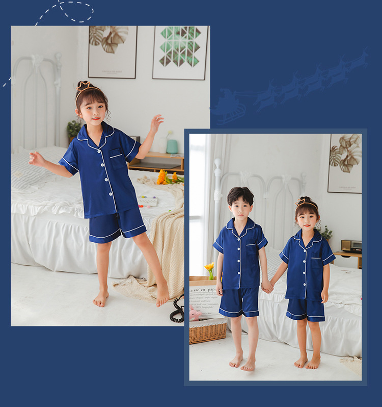 【萌娃休闲睡衣,面料舒适,可爱设计】高密仿真丝 秋季长袖长裤四季款 儿童夏季睡衣短袖短裤 小翻领纯色可爱 中小童家居服简约-QQ