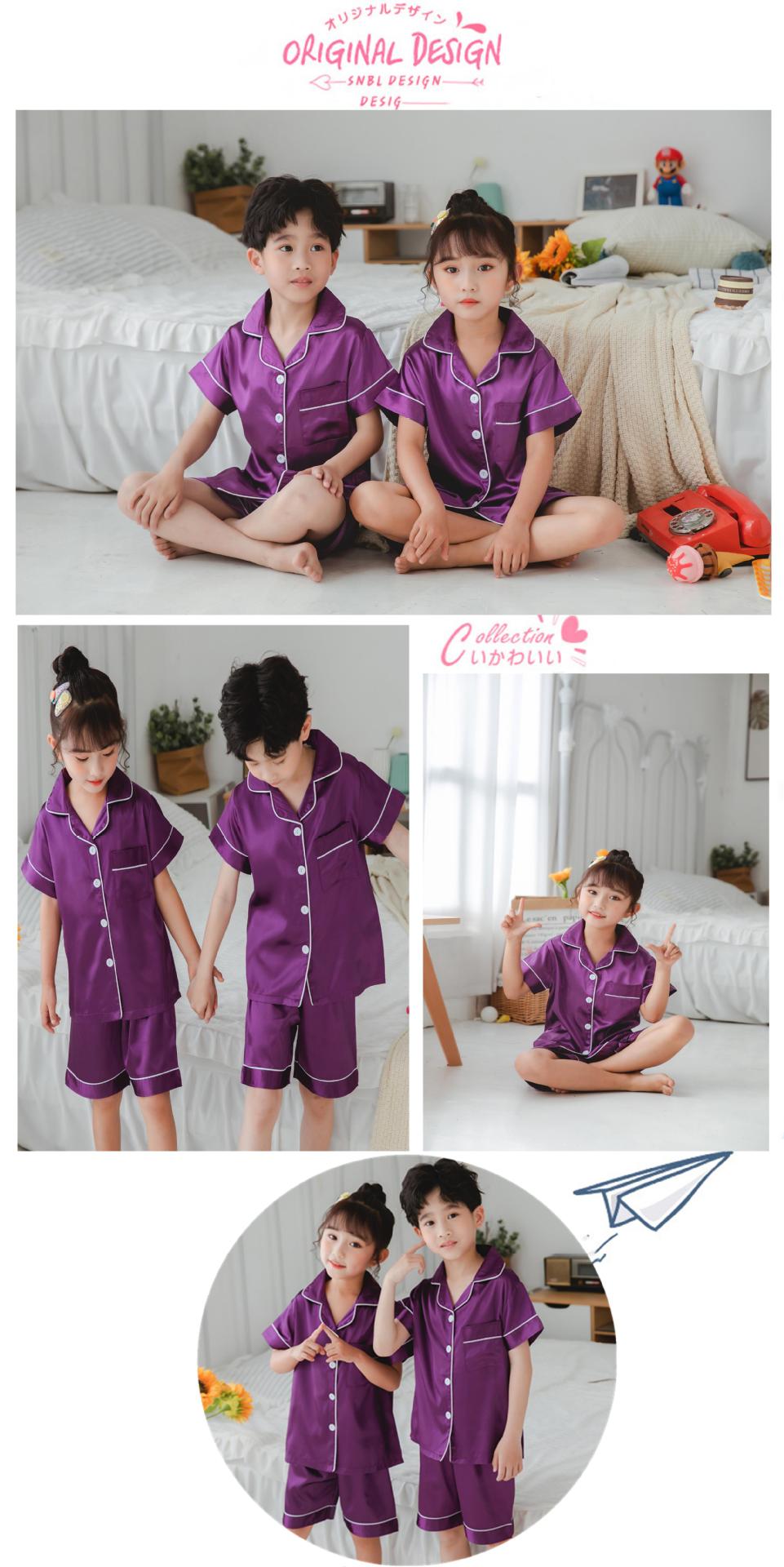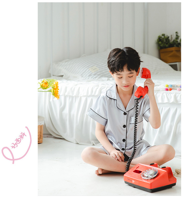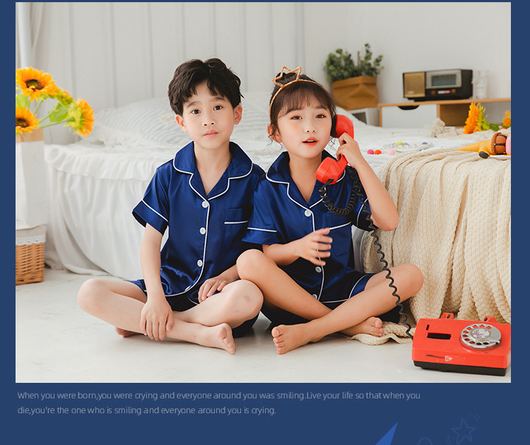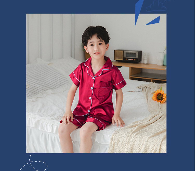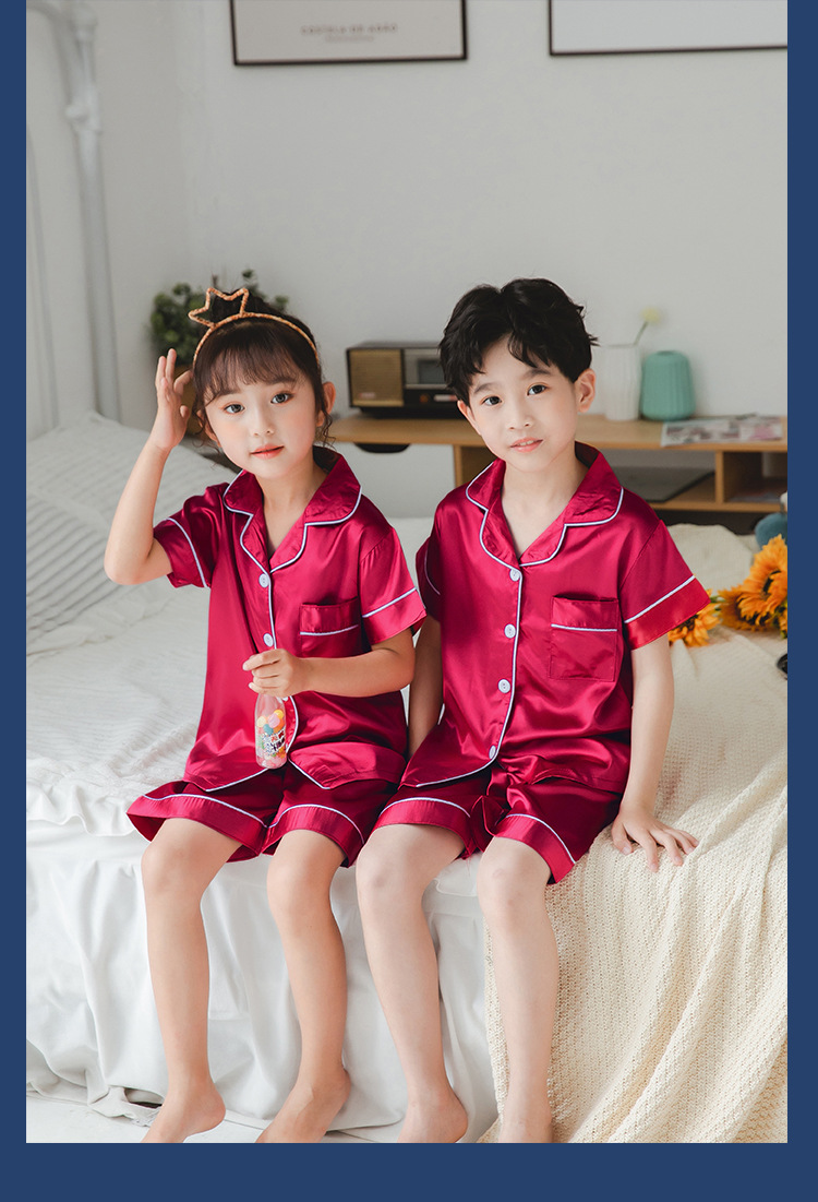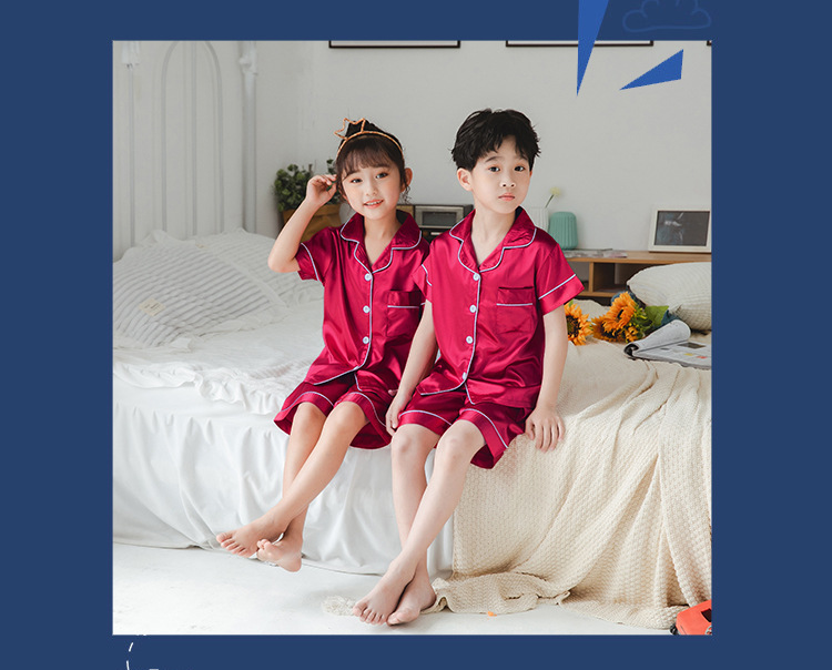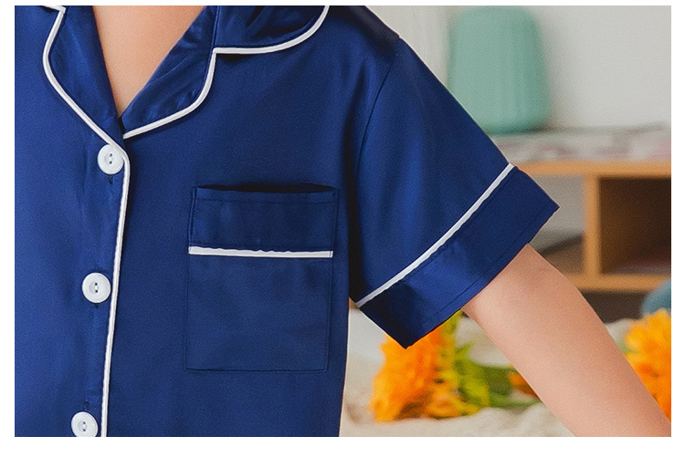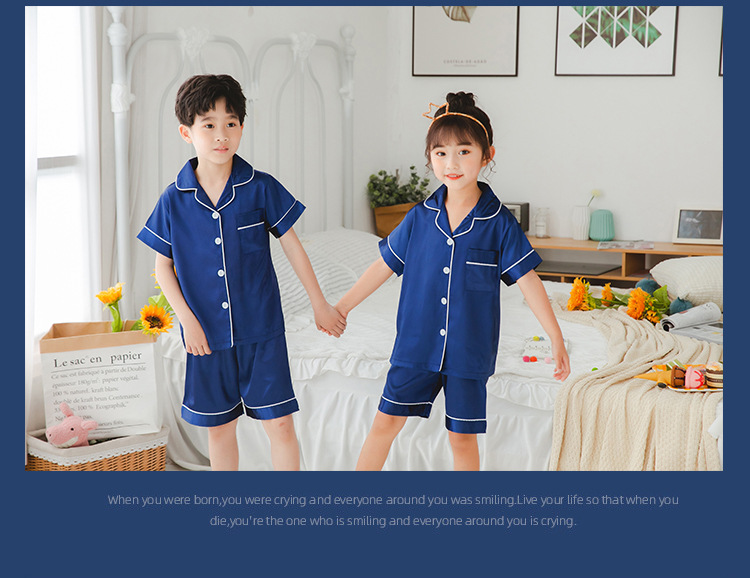 【萌娃休闲睡衣,面料舒适,可爱设计】高密仿真丝 秋季长袖长裤四季款 儿童夏季睡衣短袖短裤 小翻领纯色可爱 中小童家居服简约-QQ
