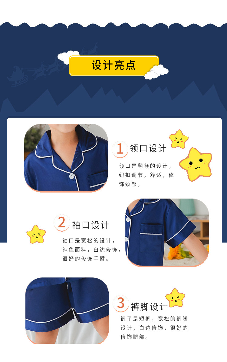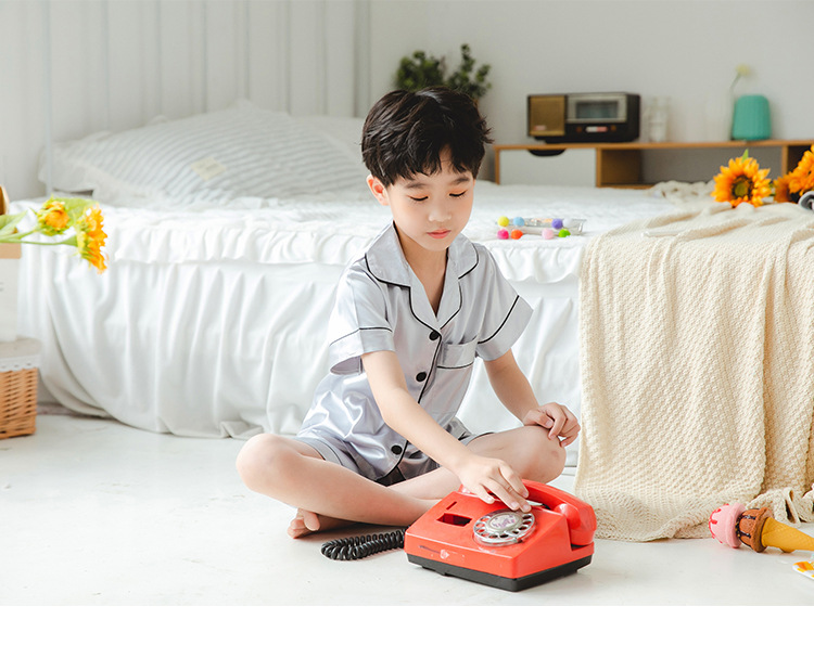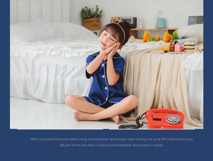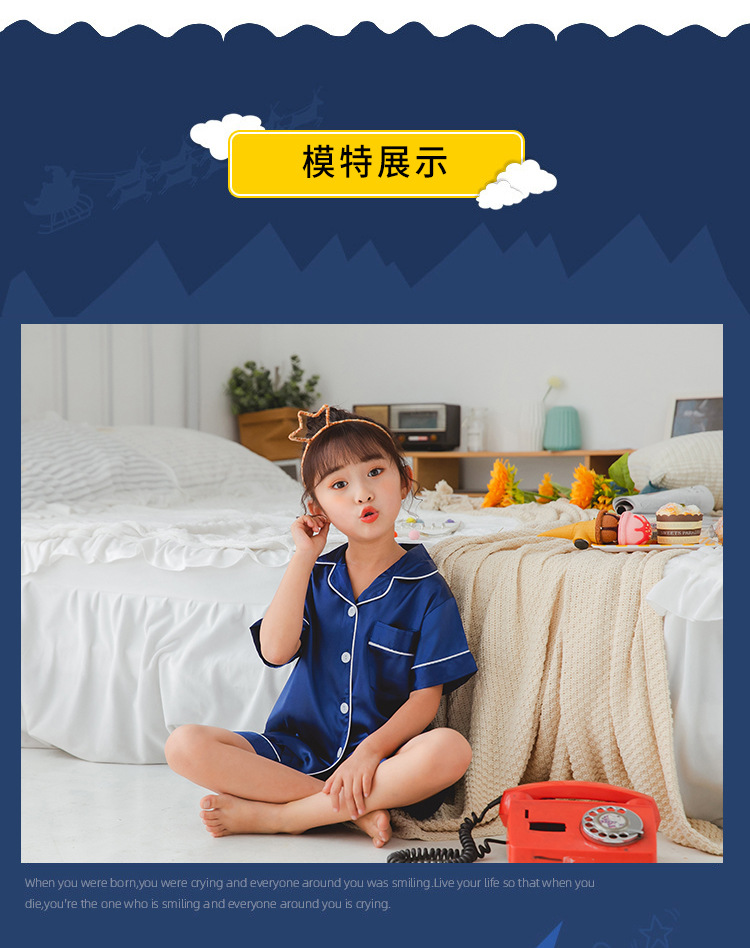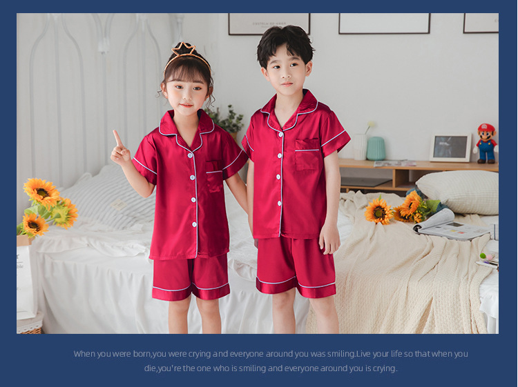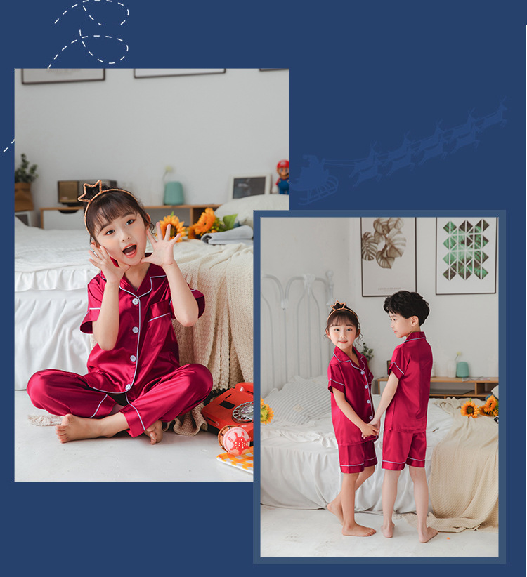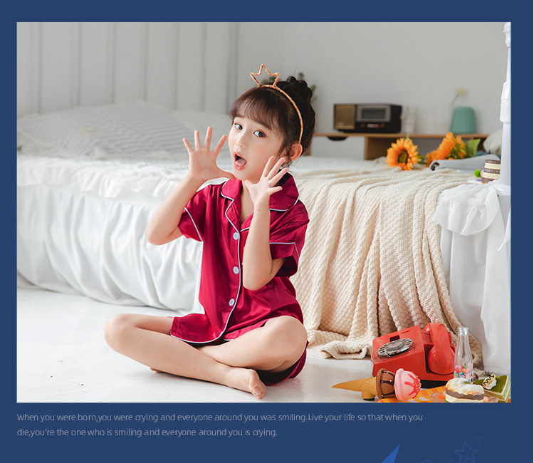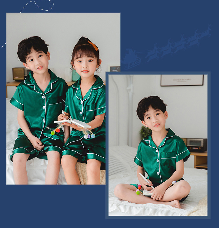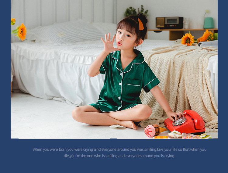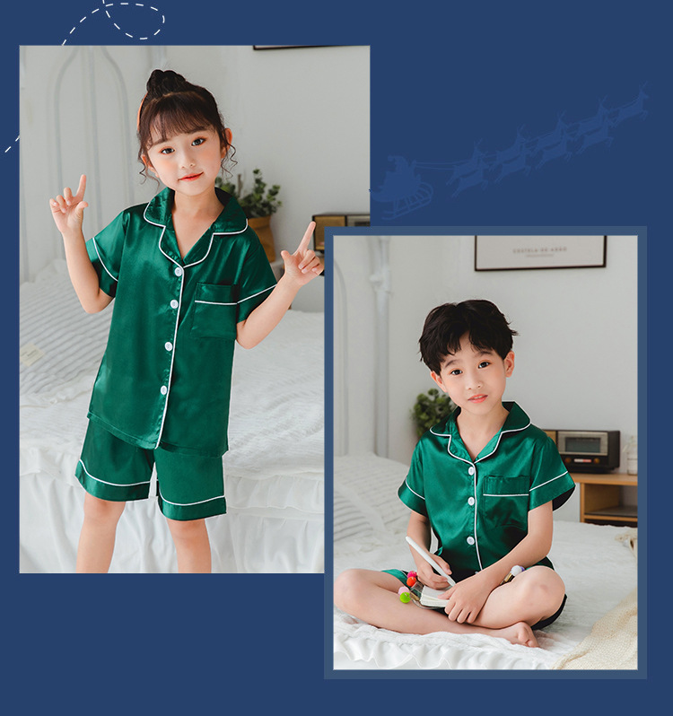 【萌娃休闲睡衣,面料舒适,可爱设计】高密仿真丝 秋季长袖长裤四季款 儿童夏季睡衣短袖短裤 小翻领纯色可爱 中小童家居服简约-QQ