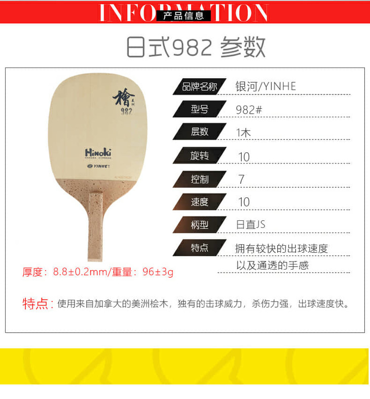 YINHE银河982单层桧木乒乓球底板快攻弧圈型日式直拍JS
