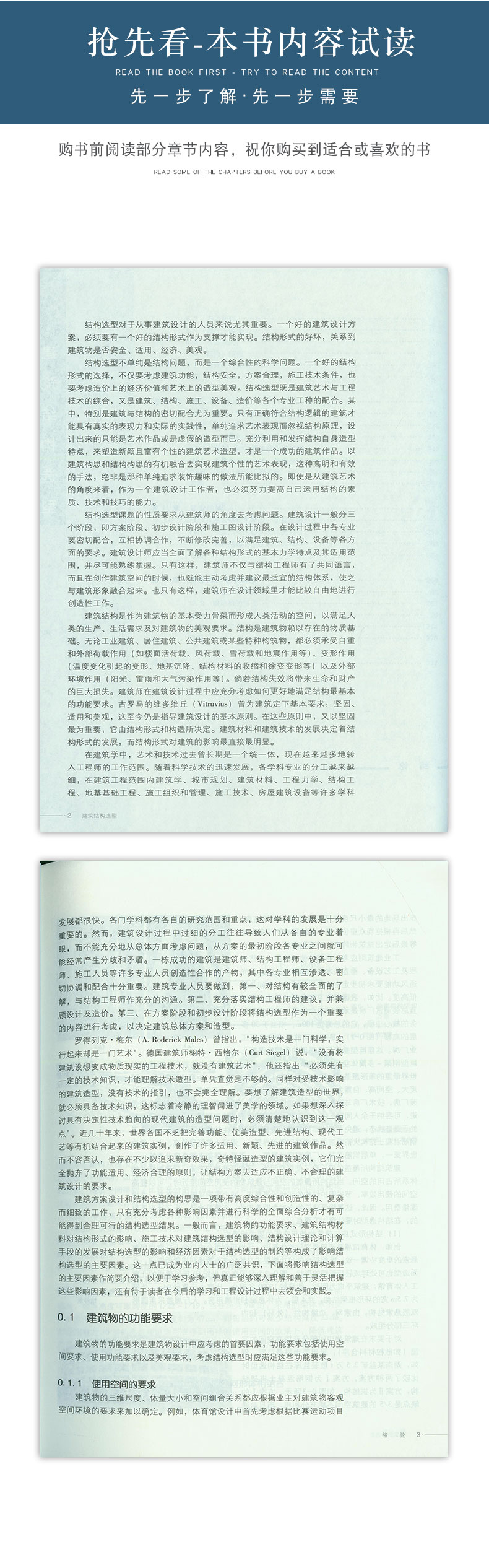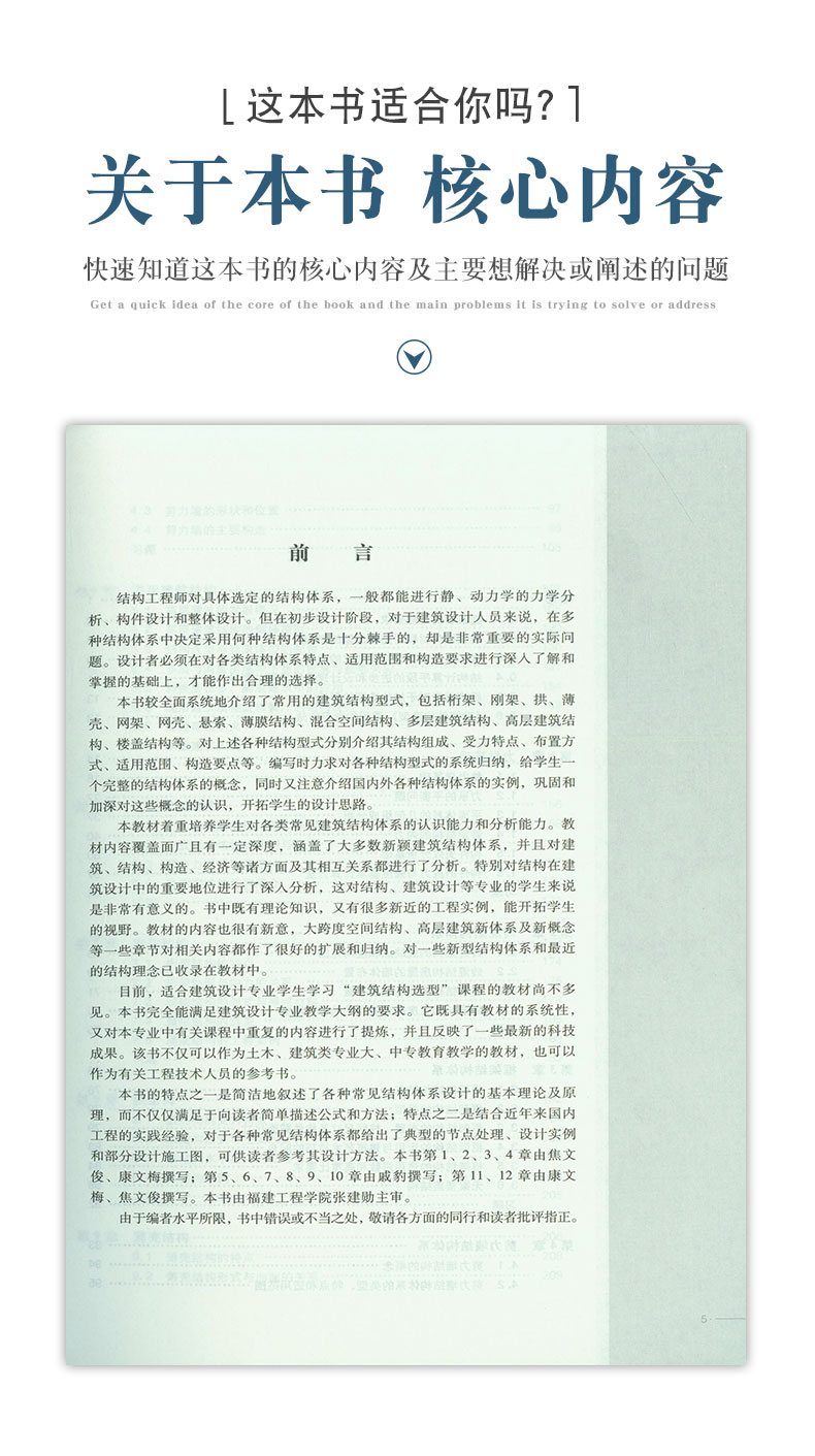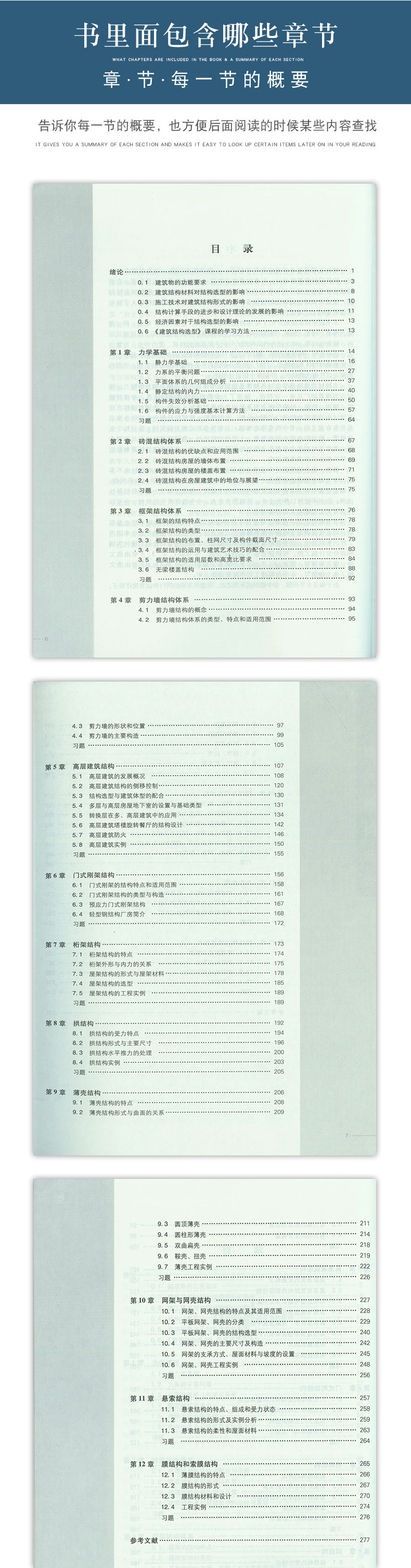 本书简洁的叙述了各种常见结构体系设计的基本理论以及原理,全面系统的介绍了建筑结构的形式,包括:桁架、刚架、拱、薄壳、网架、网壳、悬索、薄膜结构、混合空间结构、多层建筑结构、高层建筑结构、楼盖结构等,对上述结构选型分别介绍结构组成、受力特点、布置方式、适用范围、构造要点等。