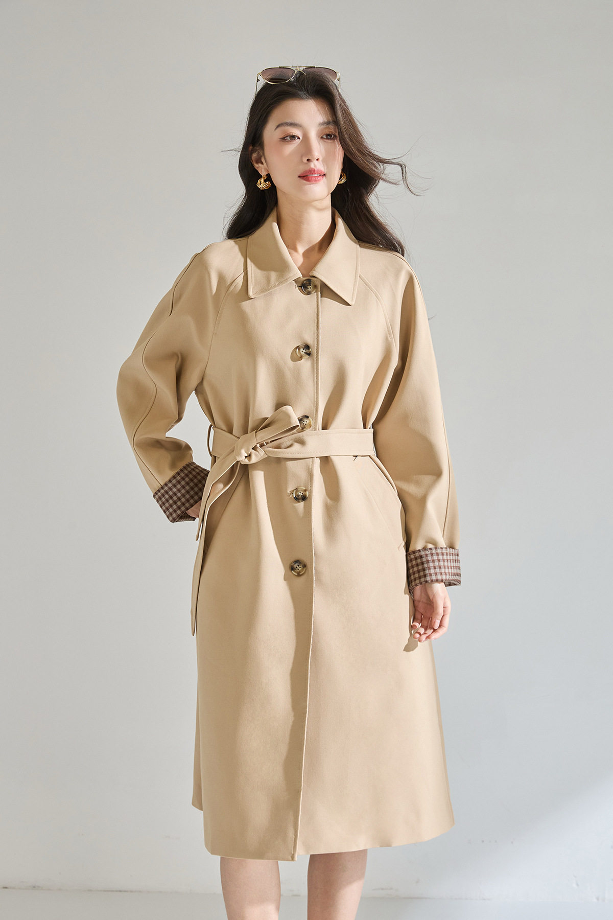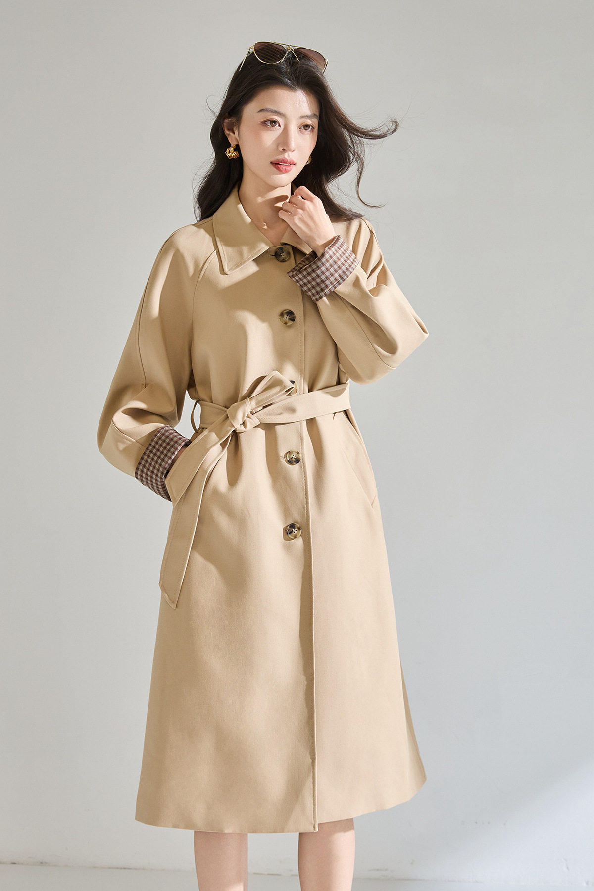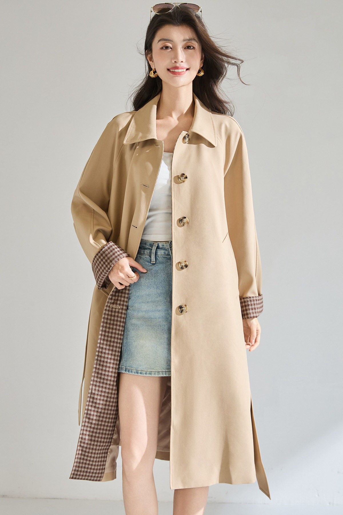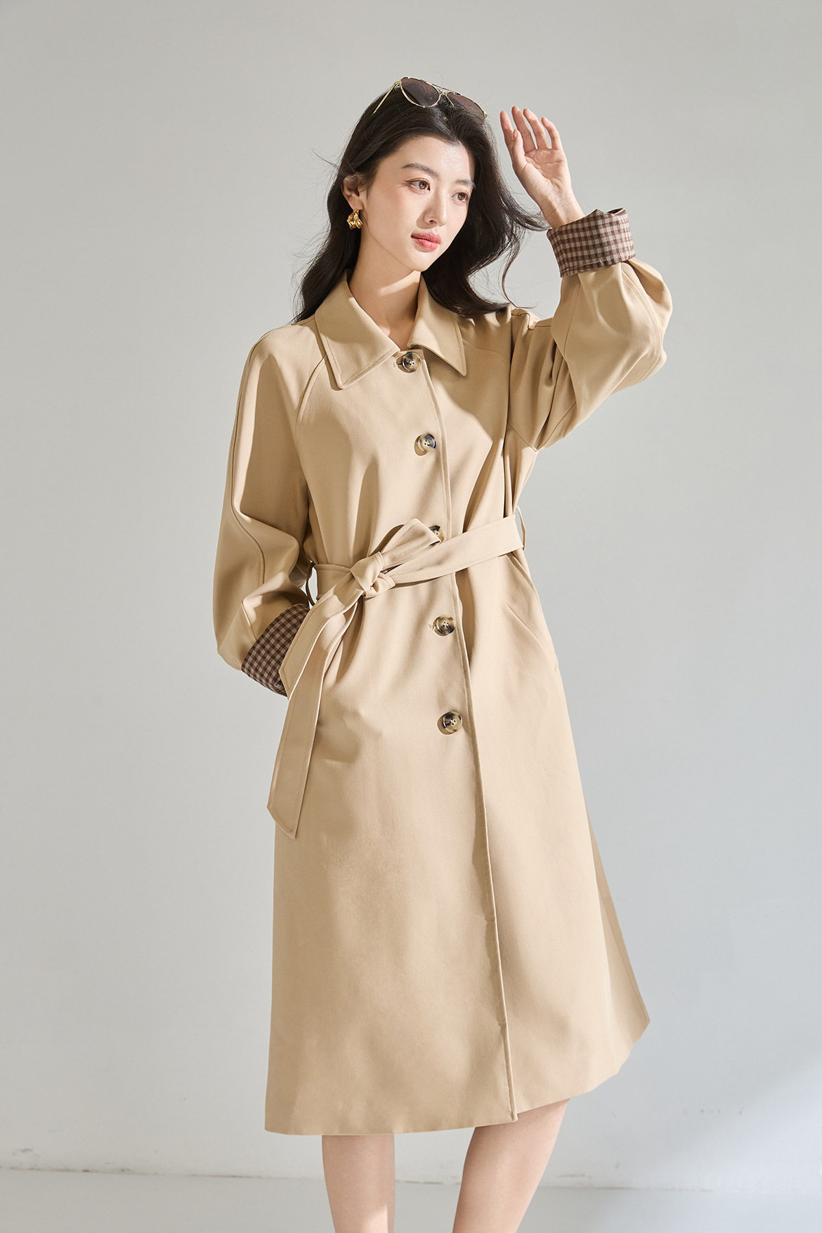 「高货sh」全新升级【铂金会员413/天猫559/差价146】(01024)洛诗琳经典翻领外套2026春季气质优雅格纹袖口拼接风衣