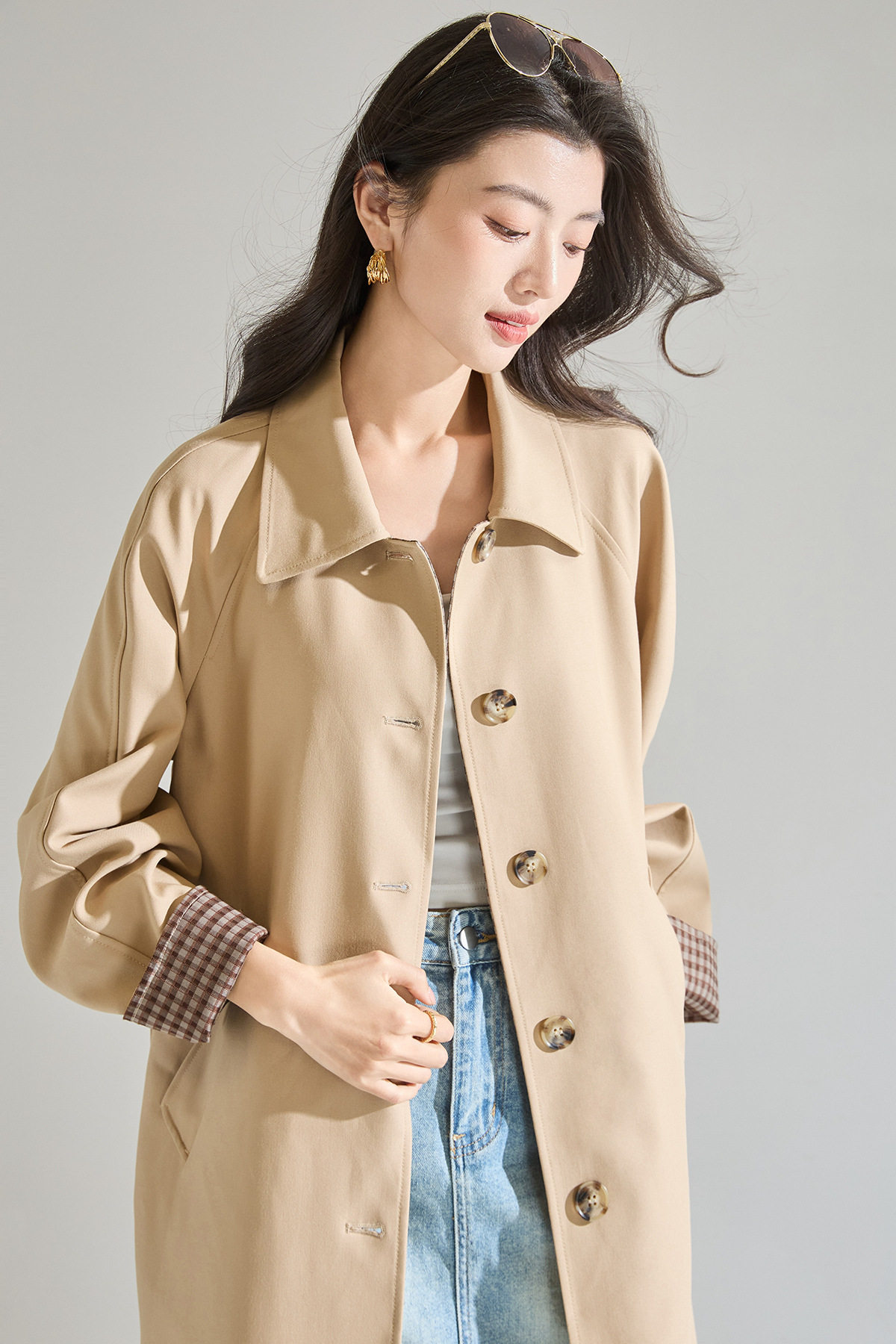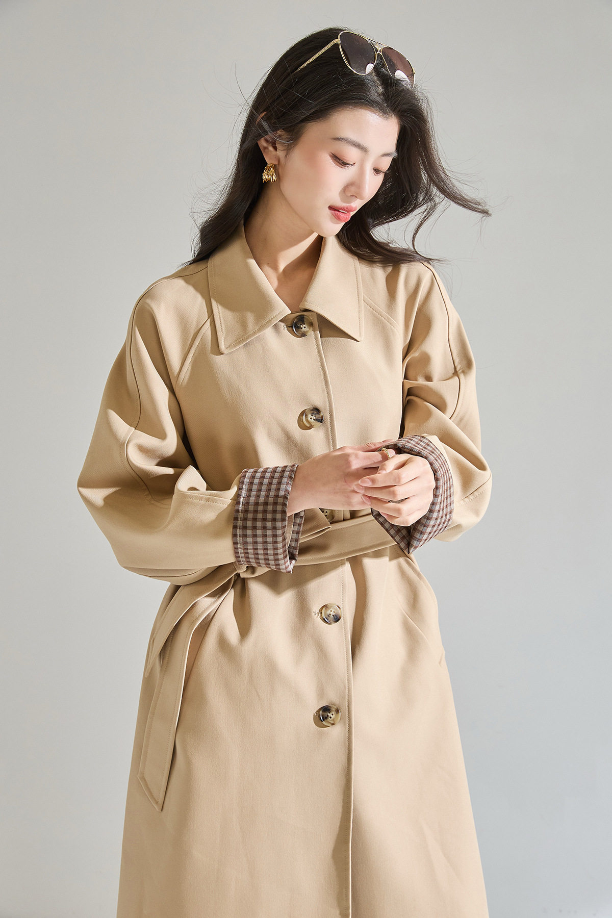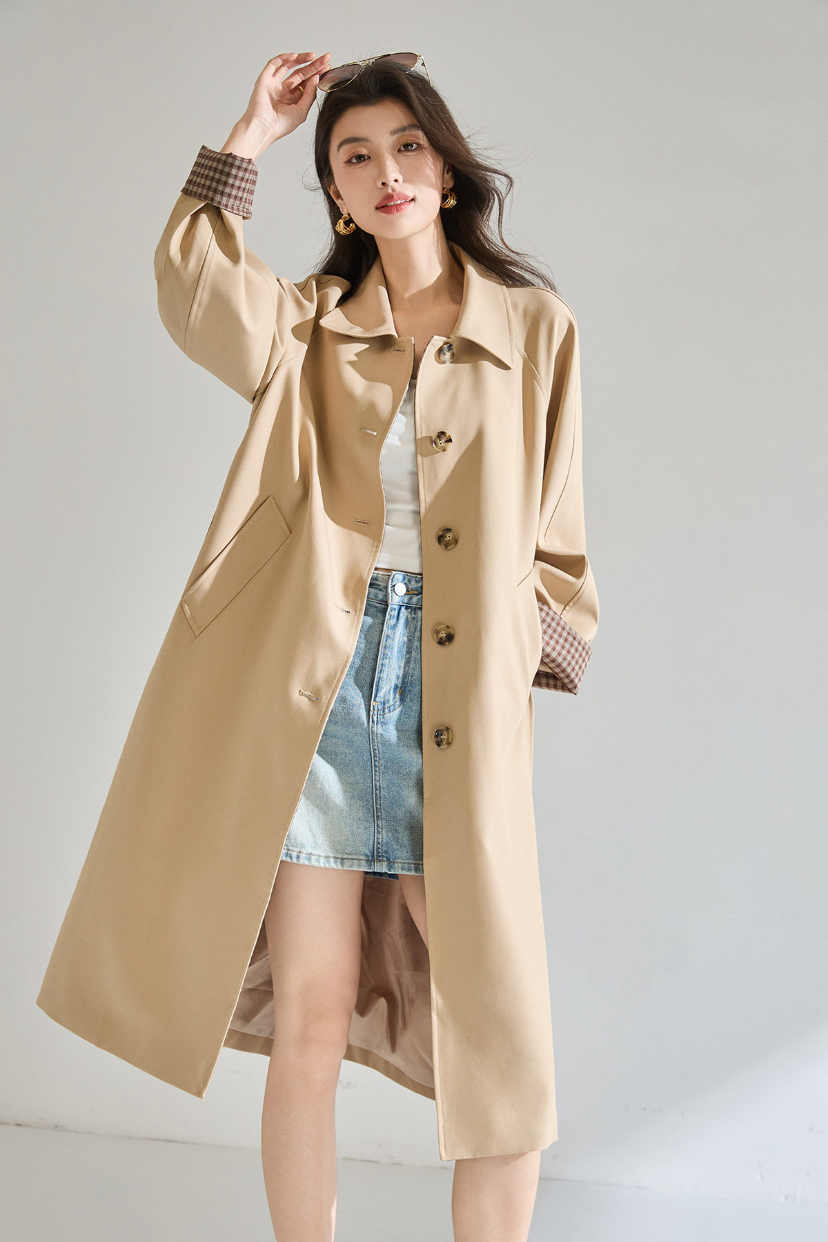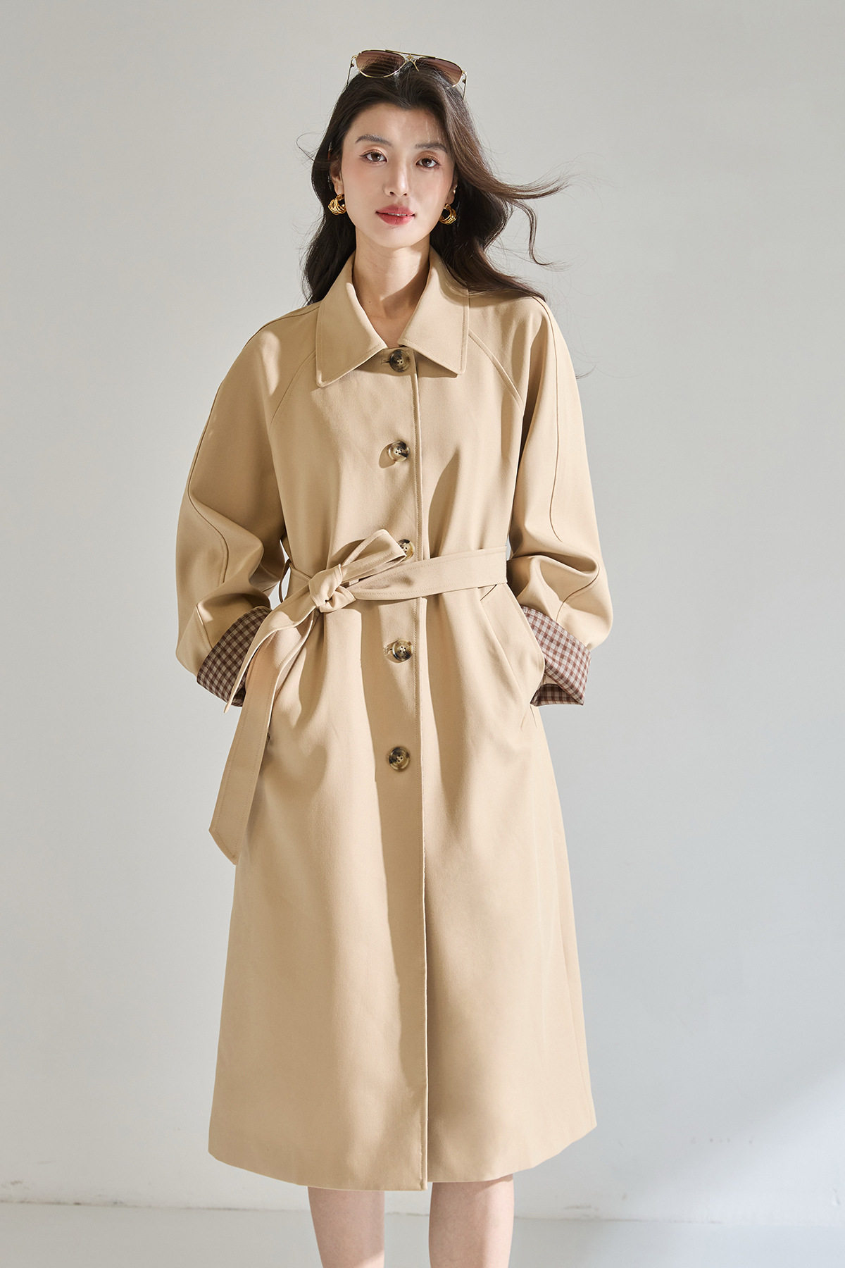 「高货sh」全新升级【铂金会员413/天猫559/差价146】(01024)洛诗琳经典翻领外套2026春季气质优雅格纹袖口拼接风衣