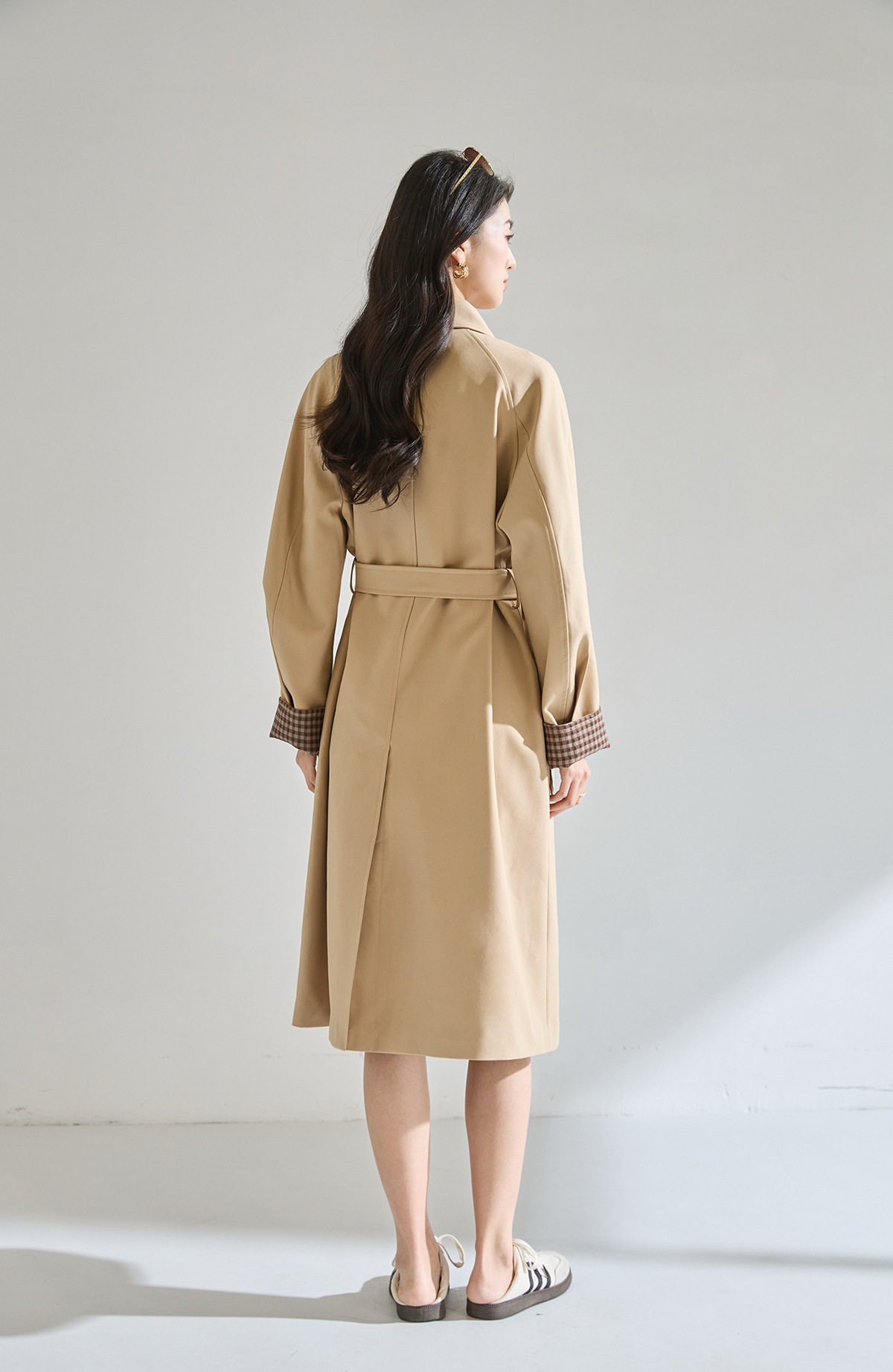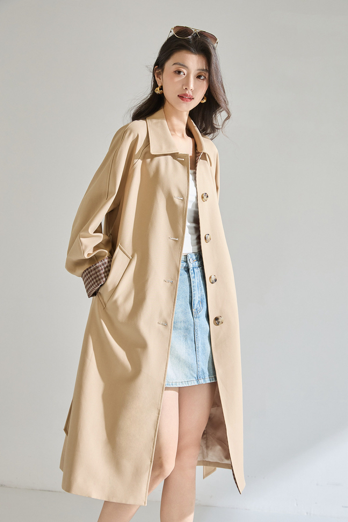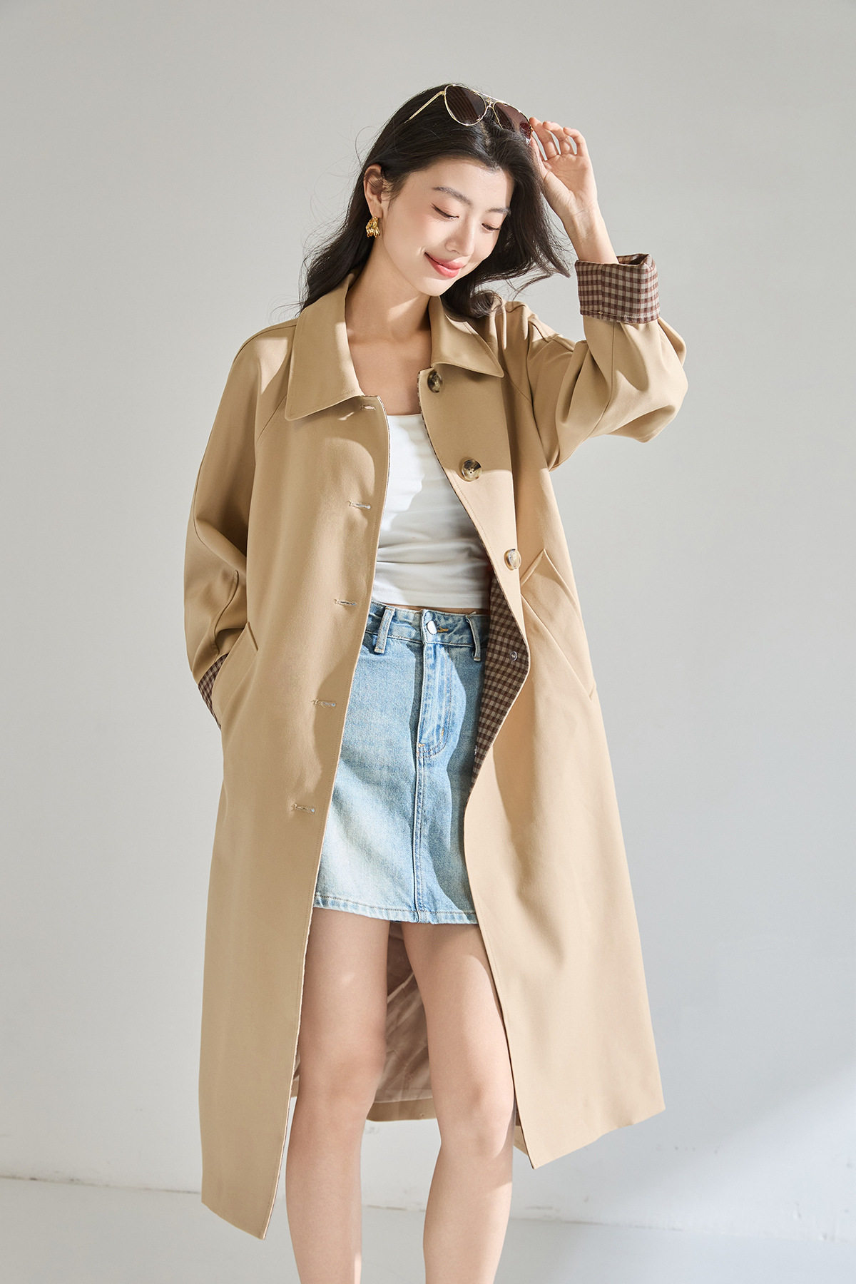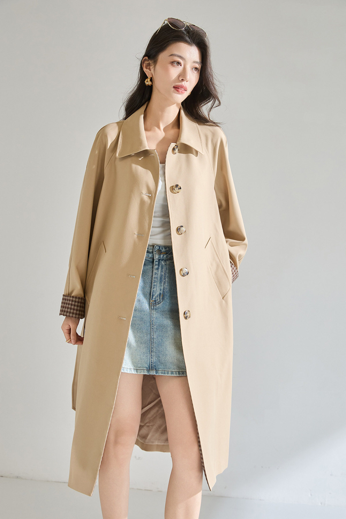 「高货sh」全新升级【铂金会员413/天猫559/差价146】(01024)洛诗琳经典翻领外套2026春季气质优雅格纹袖口拼接风衣