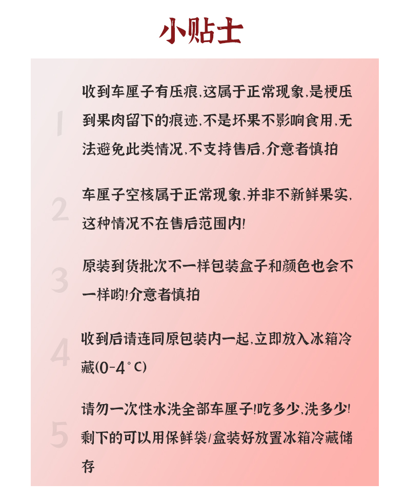 1.收到车厘子有压痕,这属于正常现象,是梗压到果肉留下的痕迹,不是坏果不影响食用,无法避免此类情况,不支持售后,介意者慎拍