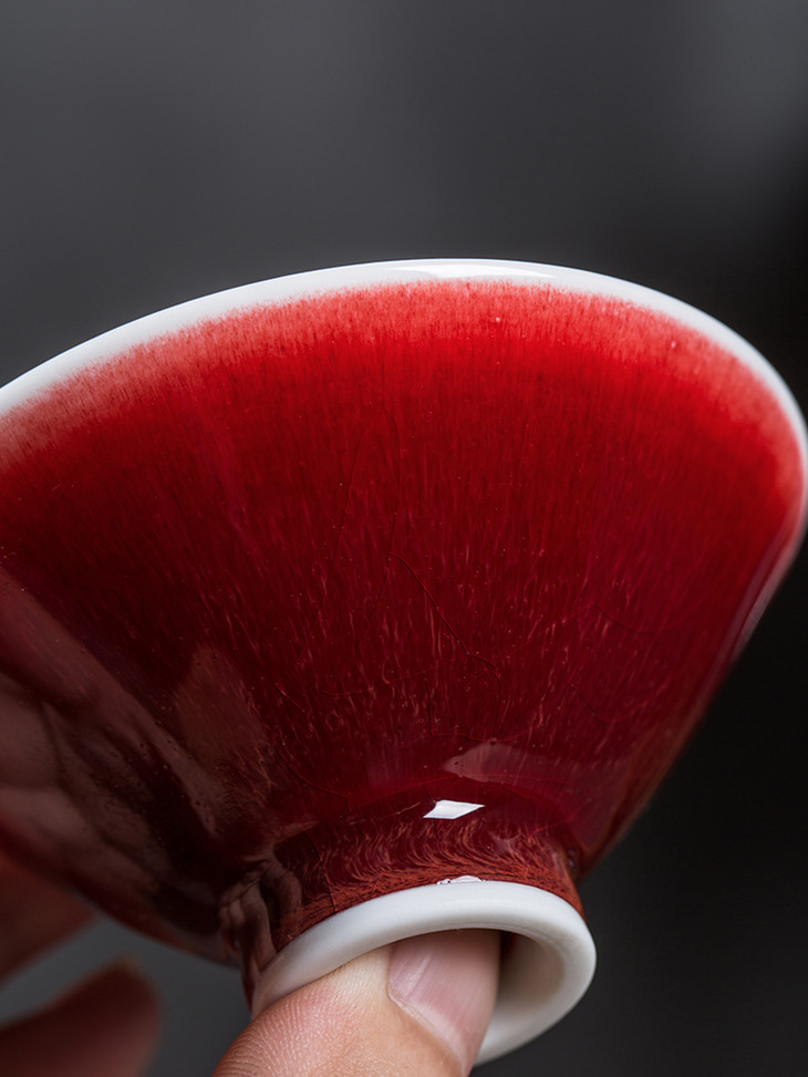 ▲约15%的精品:杯口脱口低于3mm;流釉形成牛毛丝;杯底流釉不过足,呈鸡翅纹;杯体有明显的不规则开片;颜色鲜艳如鸡血红;瓷质温润。