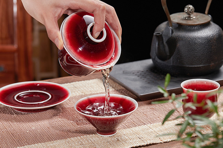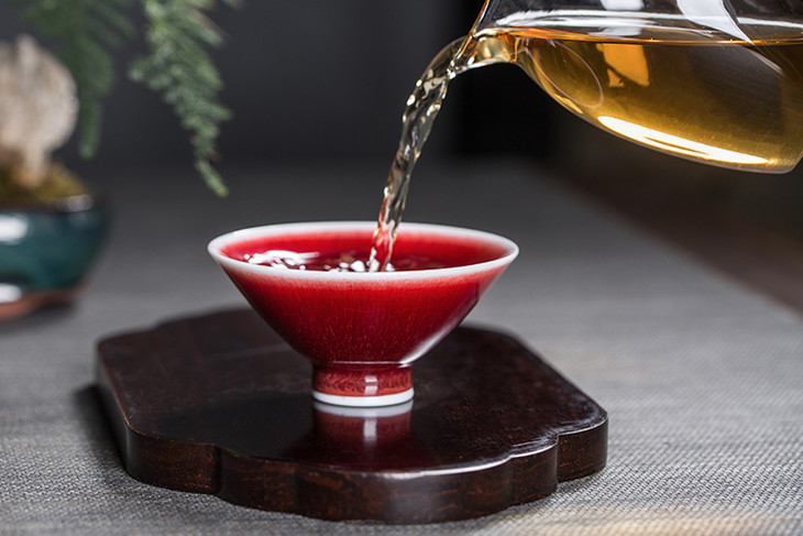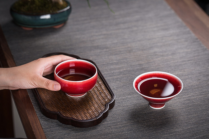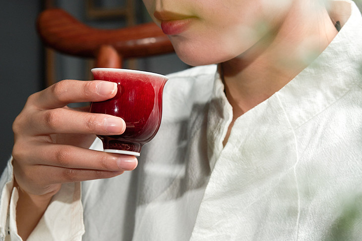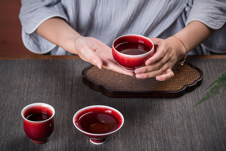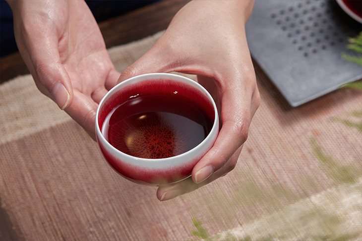 茶汤入盏,烟气升腾中如祥瑞红霞照临大地。一口饮尽,恍若穿越一代风华绝色,谈笑风生。