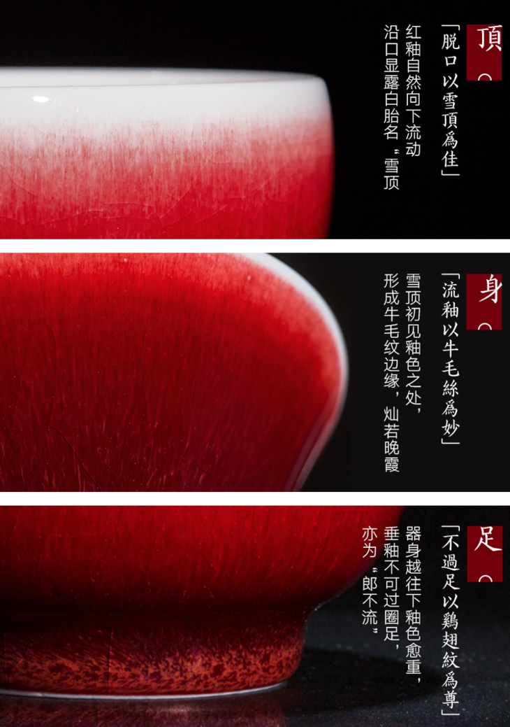 他们一直以清代贡品三大标准为要求,不断优化。注:清宫与景德镇御窑厂来往文书记载,贡品“郎红”:脱口以雪顶为佳,流釉以牛毛丝为妙,不过足以鸡翅纹为尊,三者缺一不可。