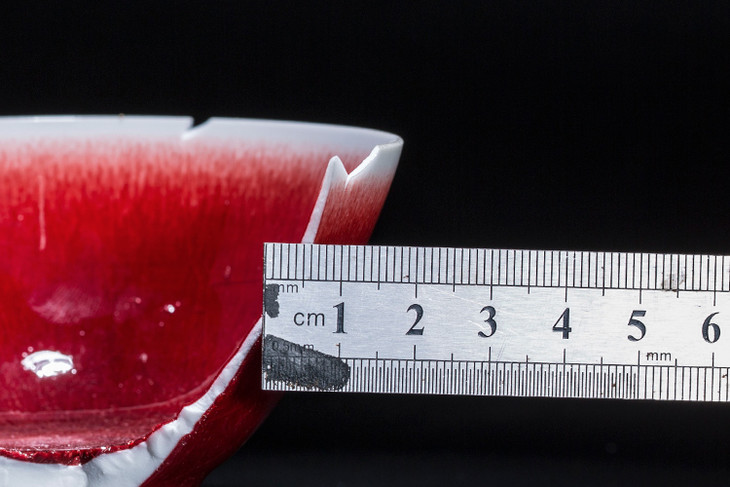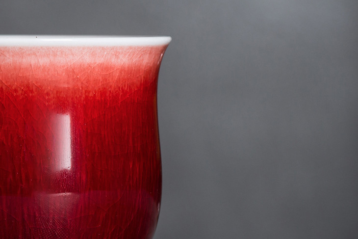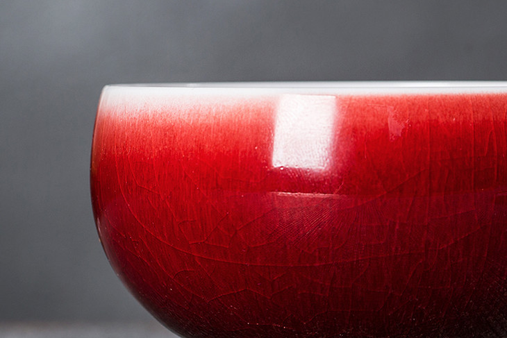 独一窑反复研究釉料膨胀系数与胎体匹配度,研制出郎红薄胎,至薄处仅1mm,器身薄可透光。