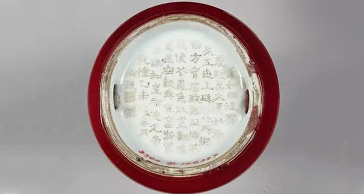 ▲乾隆提诗于一郎窑红穿带直口瓶底,盛赞其非朱砂、宝石所能媲美