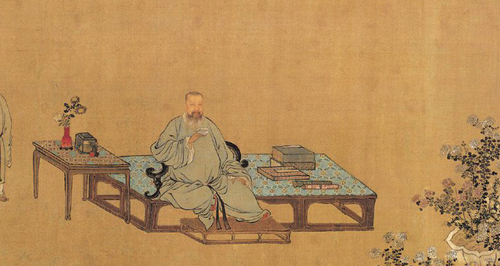 ▲禹之鼎《王原祁艺菊图》可见郎窑红釉器。