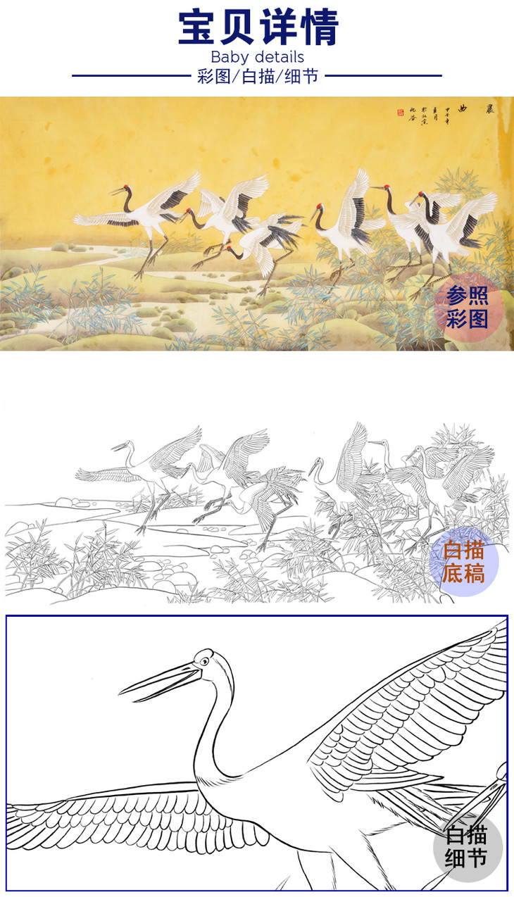 横幅四尺六尺工笔花鸟动物白描底稿-仇谷-仙鹤-晨曲-A076