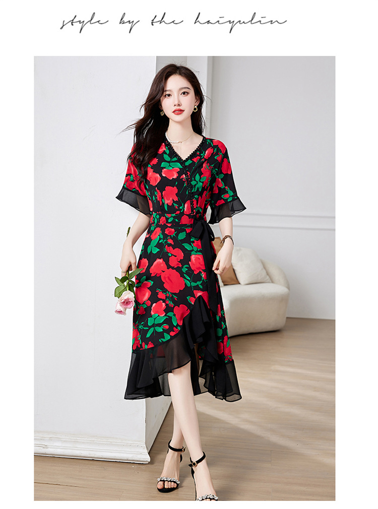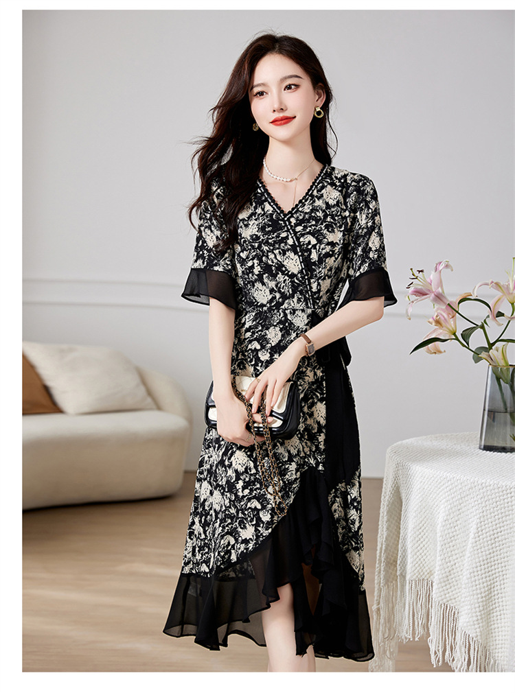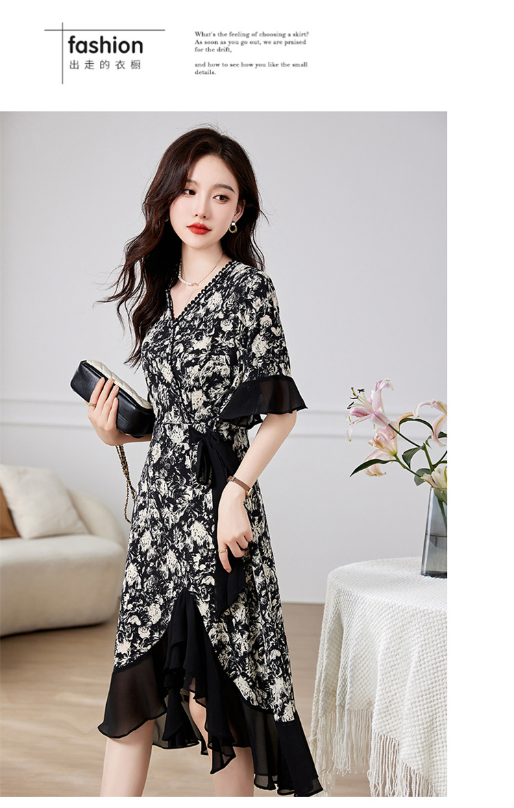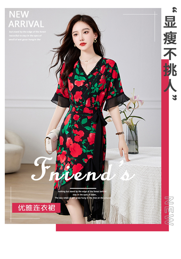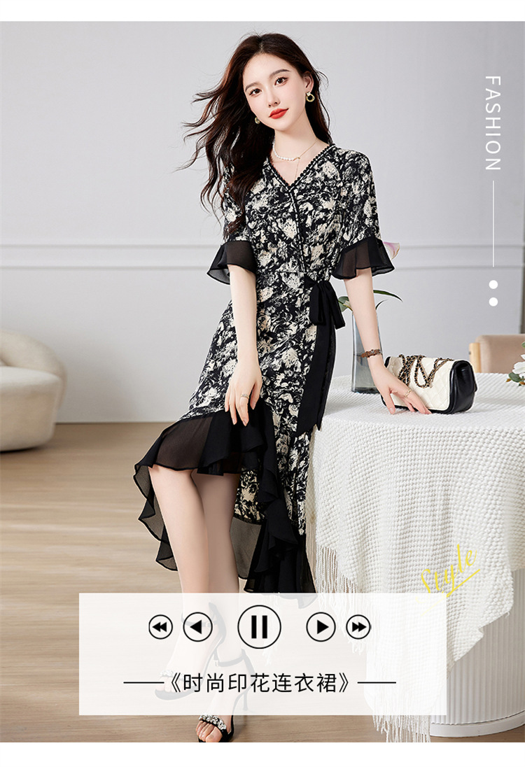 HR WZ25229气质V领优雅时尚拼接撞色印花修身显瘦裙
