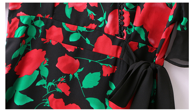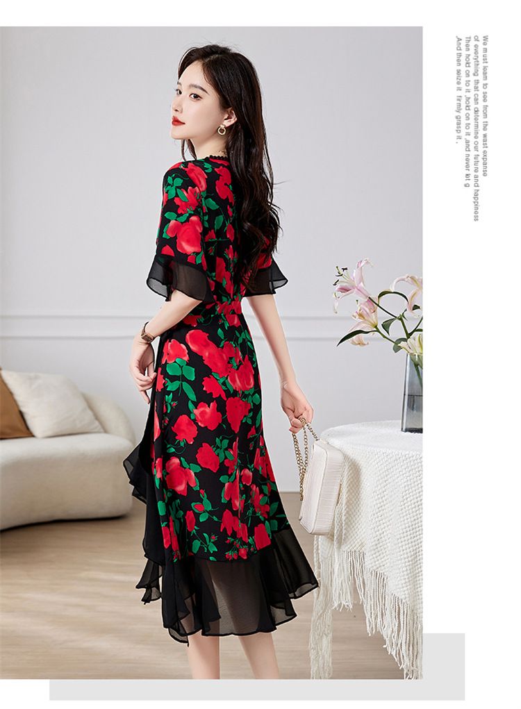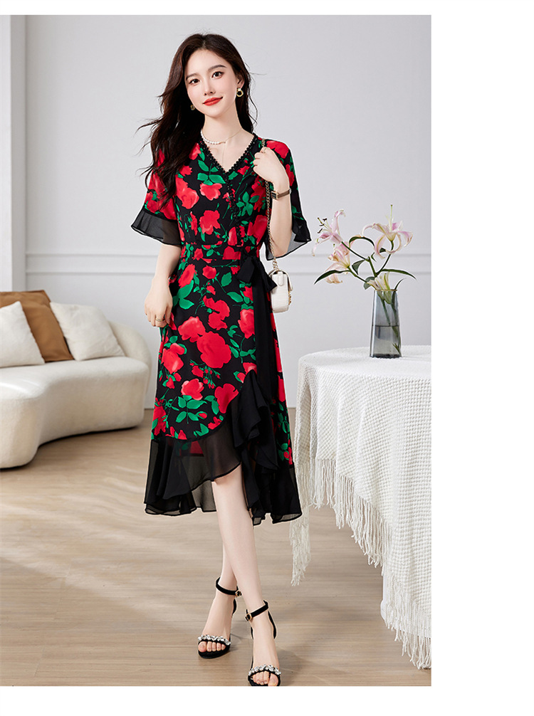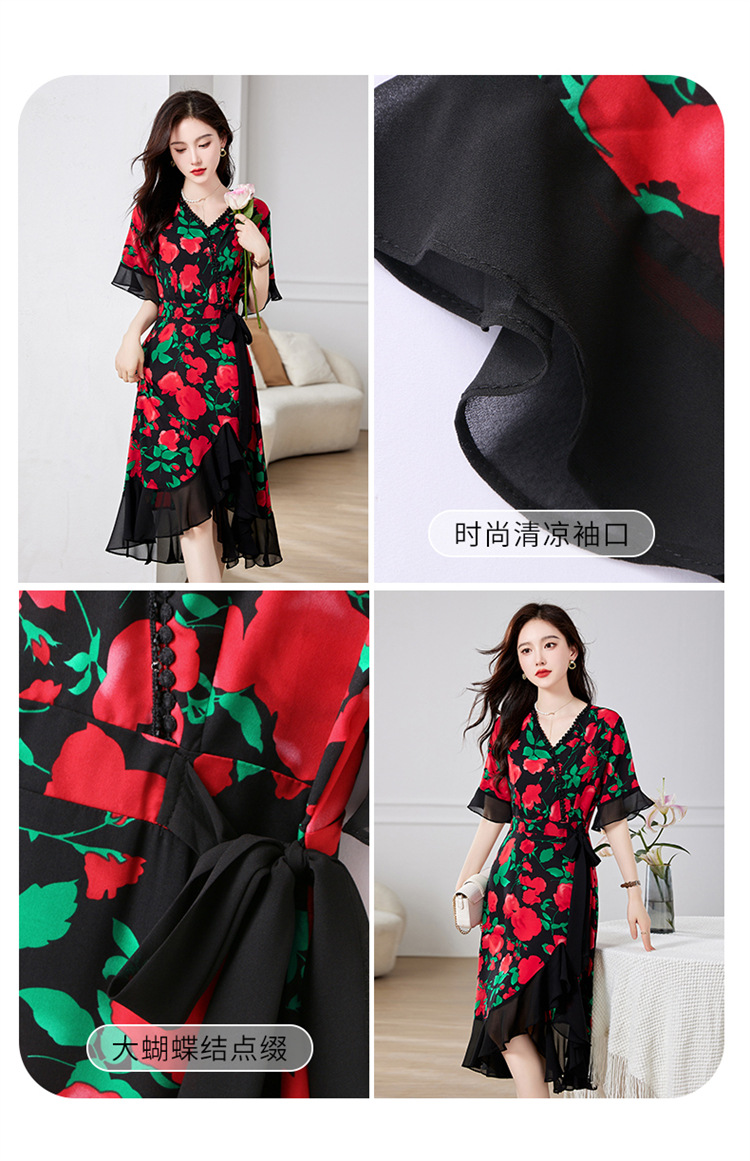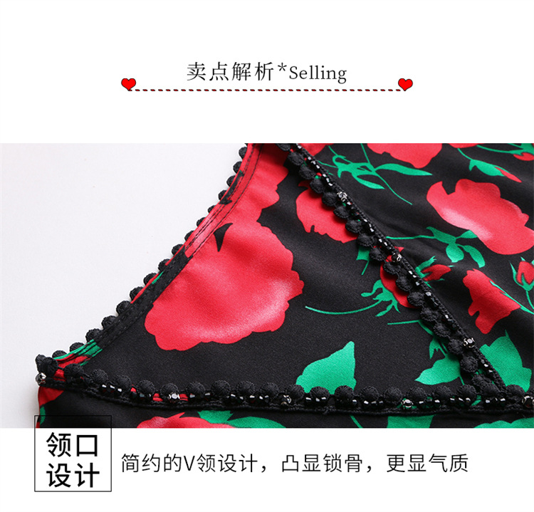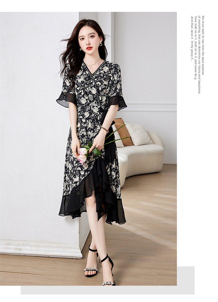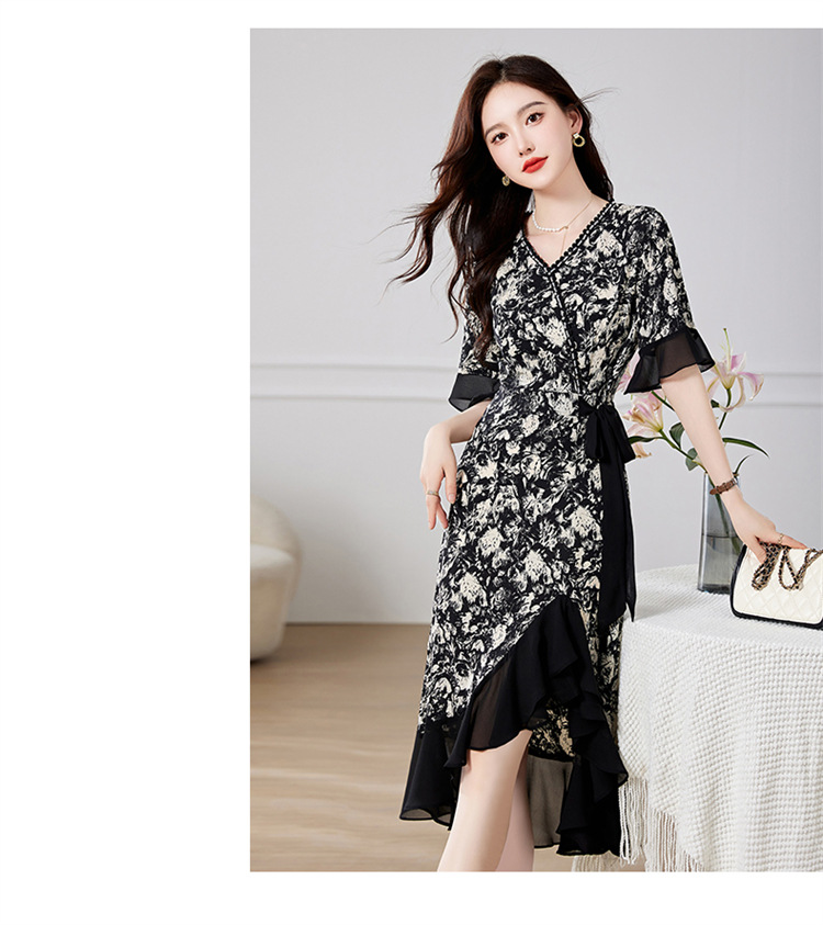HR WZ25229气质V领优雅时尚拼接撞色印花修身显瘦裙