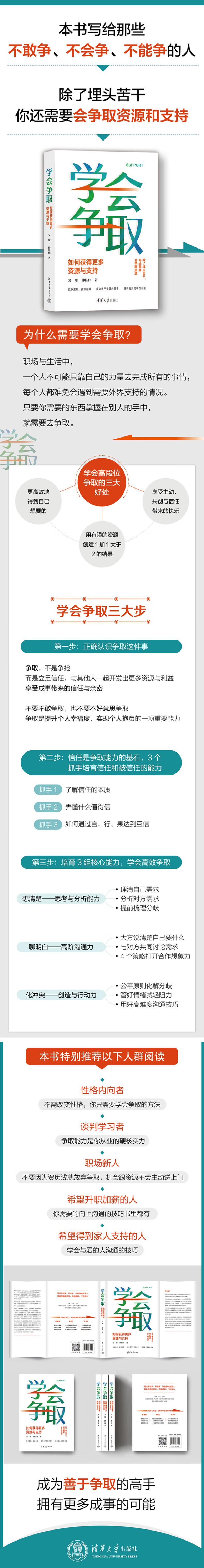 职场与生活中,每个人都难免会遇到需要外界支持的情况,一个人不可能只靠自己的力量去完成**的事情。但不是每个人都敢于去争取,敢的人也未*会。这跟一个人的的心态和性格有关,也跟一个人是否具备争取的技巧与方法有关。在资源有限、竞争越来越激烈的时代背景下,正确看待争取、善用争取的技巧与反法,是提升个人幸福度、实现个人抱负的重要能力。