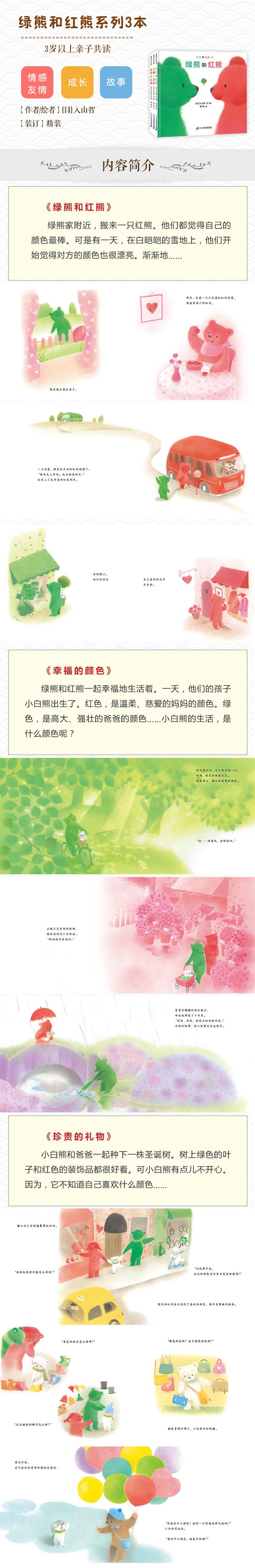 “绿熊和红熊”系列共三本:《绿熊和红熊》《幸福的颜色》和《珍贵的礼物》。柔美的画面辅以温馨的故事,讲述绿熊和红熊相遇后幸福的点点滴滴,讲述爱的邂逅、家的温暖、宝宝成长中的迷茫和欢……绿熊家附近,搬来一只红熊。他们都觉得自己的颜色最棒。可是有一天,在白皑皑的雪地上,他们开始觉得对方的颜色也很漂亮,他们相爱了,幸福地生活在一起。一天,他们的孩子小白熊出生了。红色,是温柔、慈爱的妈妈的颜色。绿色,是高大、强壮的爸爸的颜色……小白熊喜欢的,又是什么颜色呢?伴随着爸爸妈妈的爱,小白熊慢慢长大。圣诞节快要到了,小白熊和爸爸一起种下一株圣诞树。树上绿色的叶子和红色的装饰品都很好看。可小白熊有点儿不开心。因为,它不知道自己喜欢什么颜色……这时候,爸爸妈妈会怎样帮助小白熊呢?