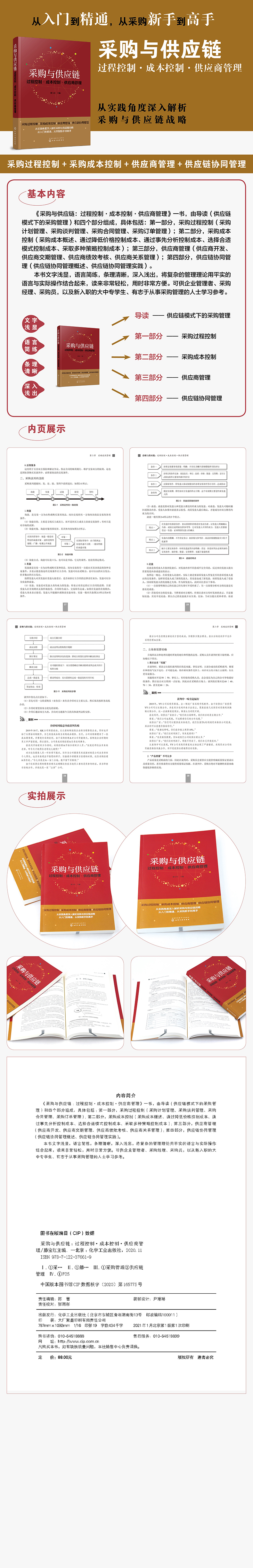 《采购与供应链:过程控制·成本控制·供应商管理》一书,由导读(供应链模式下的采购管理)和四个部分组成,具体包括:排名靠前部分,采购过程控制(采购计划管理、采购谈判管理、采购合同管理、采购订单管理);第二部分,采购成本控制(采购成本概述、通过降低价格控制成本、通过事先分析控制成本、选择合适模式控制成本、采取多种策略控制成本);第三部分,供应商管理(供应商开发、供应商交期管理、供应商绩效考核、供应商关系管理);第四部分,供应链协同管理(供应链协同管理概述、供应链协同管理实践)。