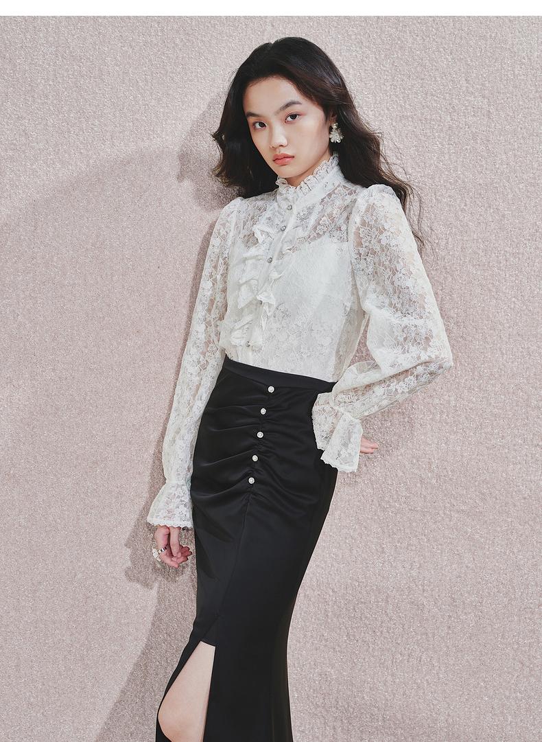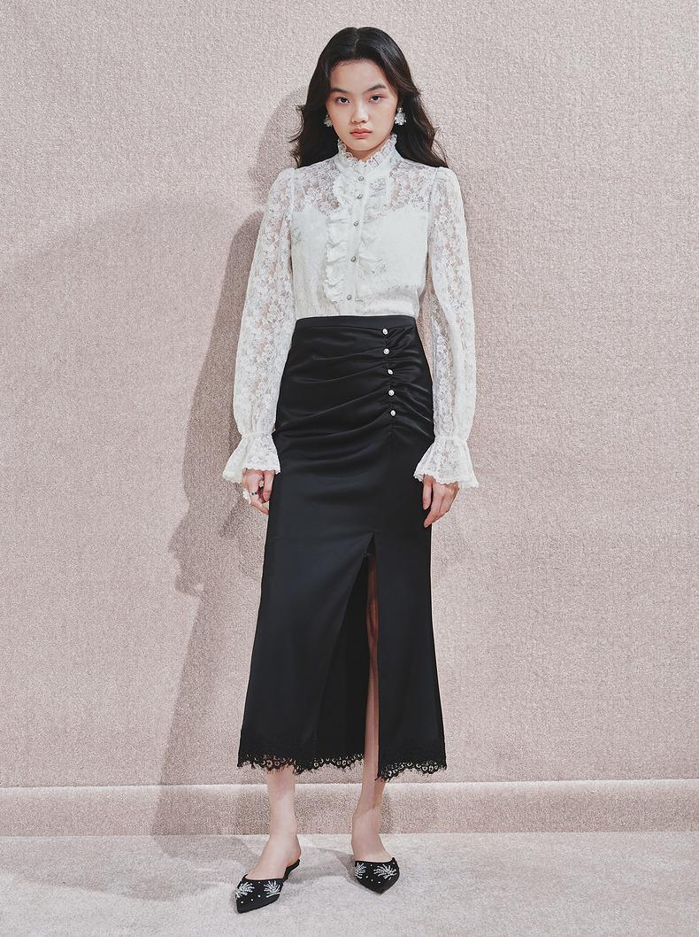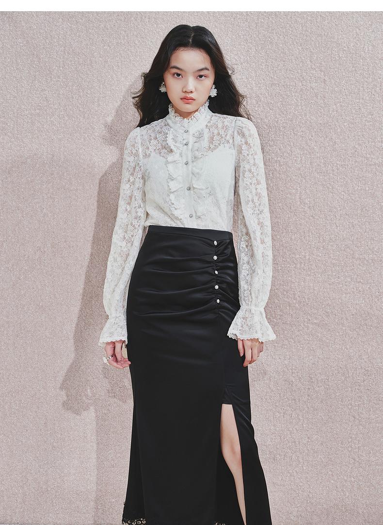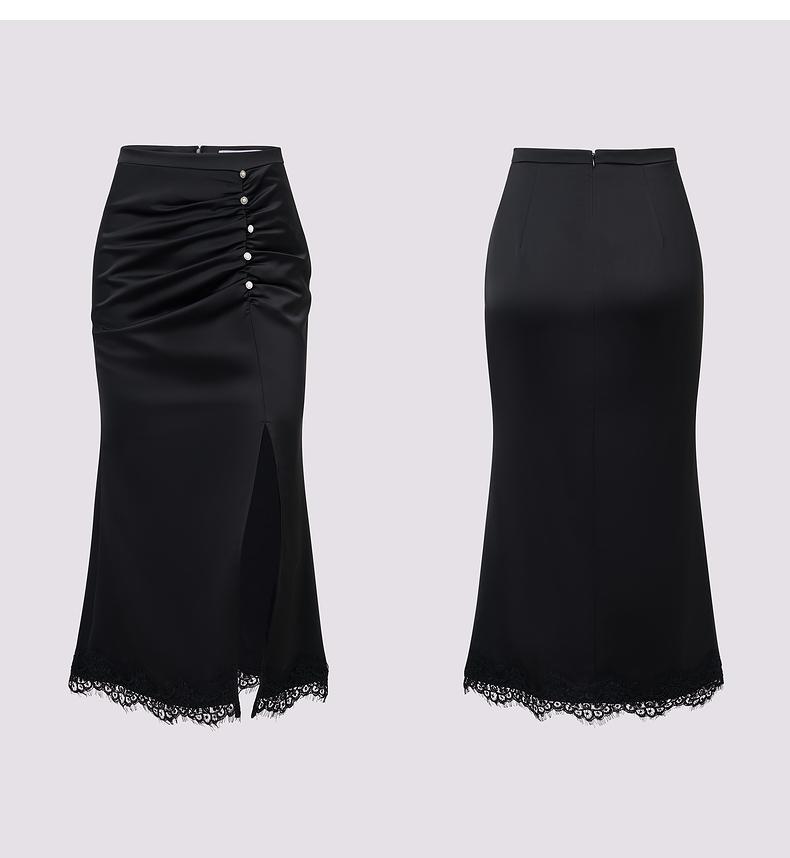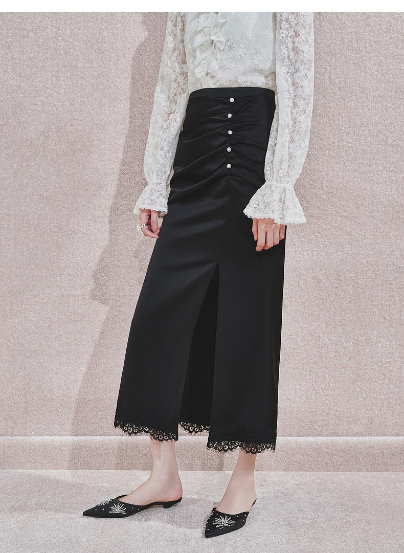 MAXRIENY2024复古浪漫感开叉蕾丝缎面半裙约会小裙子包臀半身裙(货号:MF85SK757)