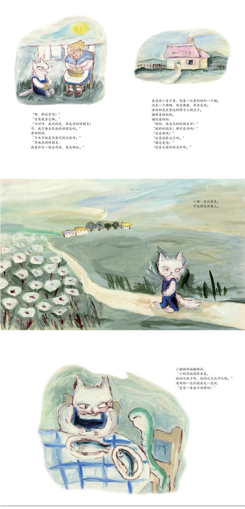 《一条生鱼》是一部充满生趣又十分动人的关于找朋友、真正的朋友和友谊的故事。故事中的小猫先是问了老奶奶:“奶奶,谁是你的好朋友呀?”老奶奶说有小猫、正在剥的豆子、天晴时的太阳……小猫哼了一声,就出远门找朋友了。这本身就是一个有趣又耐人寻味的开头。一个无意遇到的、奇怪的、好像又有些啰嗦的朋友和小猫心中的朋友差距好大啊!小猫在找寻真正的朋友,小朋友甚至大朋友也在找真正的朋友,友谊对于一个人一生都具有重要的意义,什么是真正的朋友呢?和小猫一路向前,你一定不虚此行!