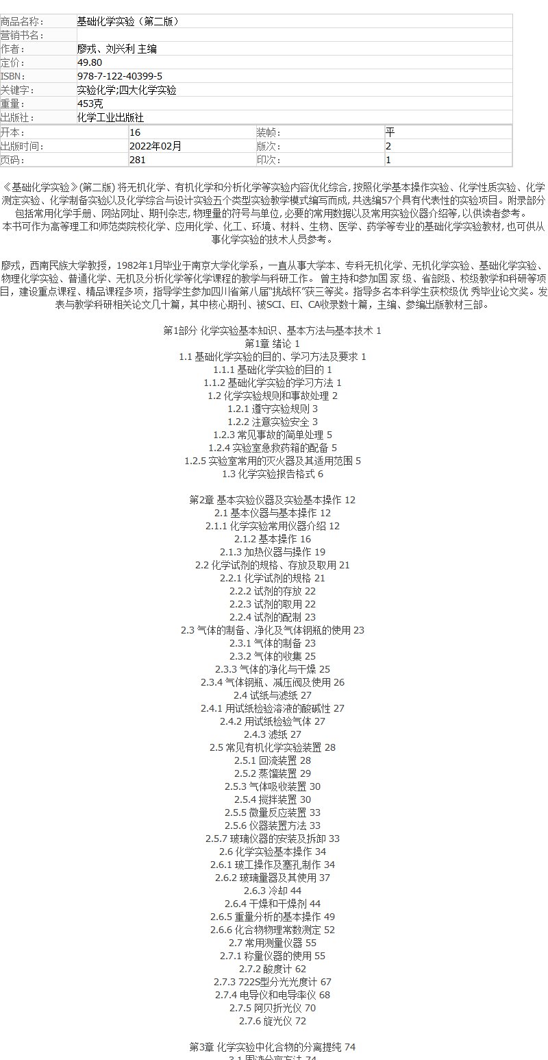 基础化学实验 廖戎 第二版 无机化学有机化学分析化学 化学基本操作实验化学性质实验化学测定实验 化学制备实验 化学综合设计实验
