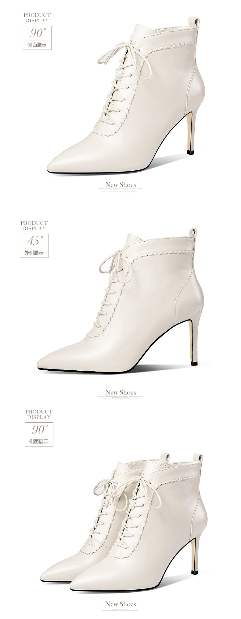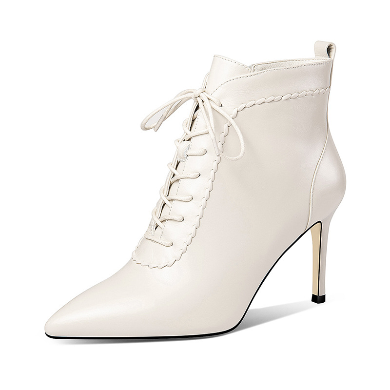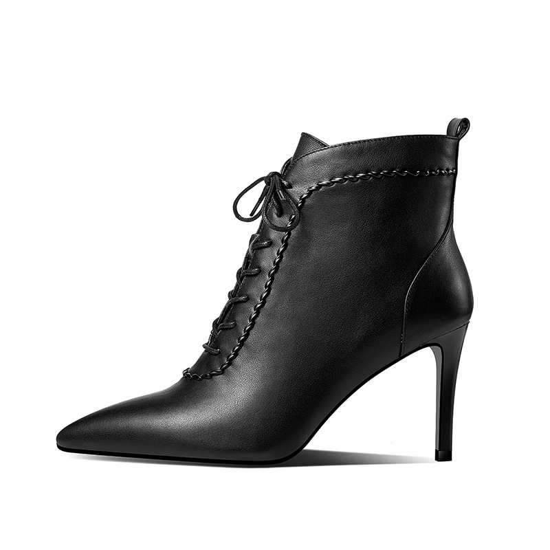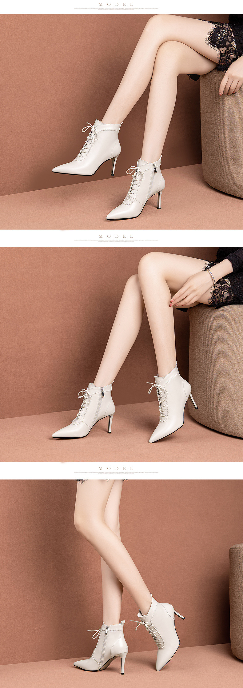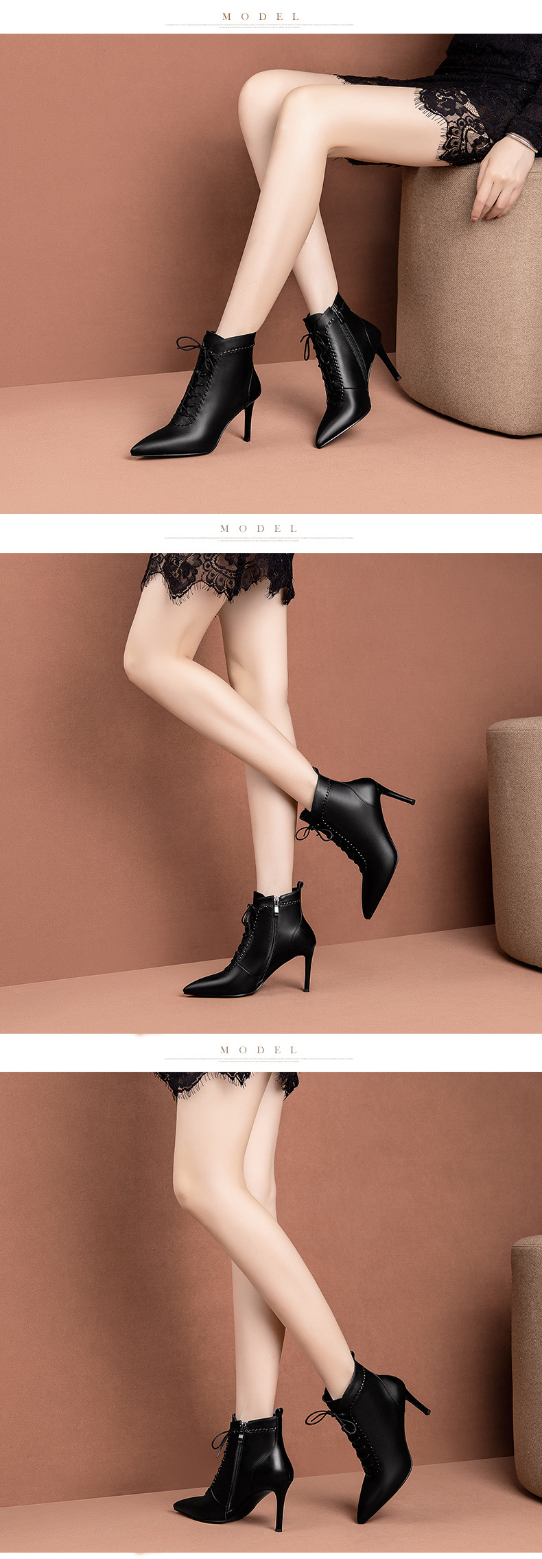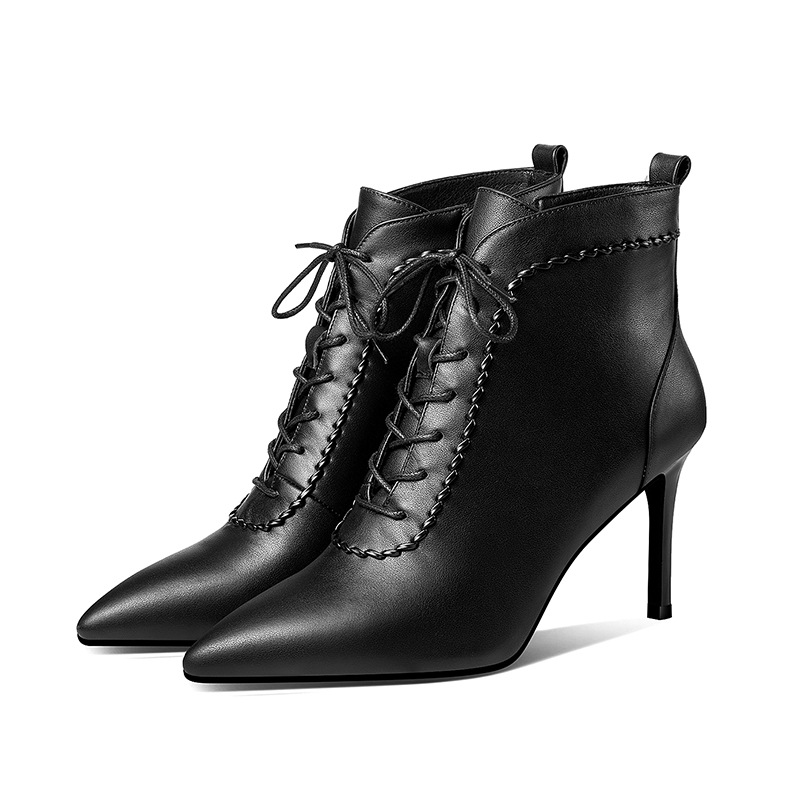 MDE-Q1951678新款真皮女靴子尖头细高跟皮靴系带时装短靴