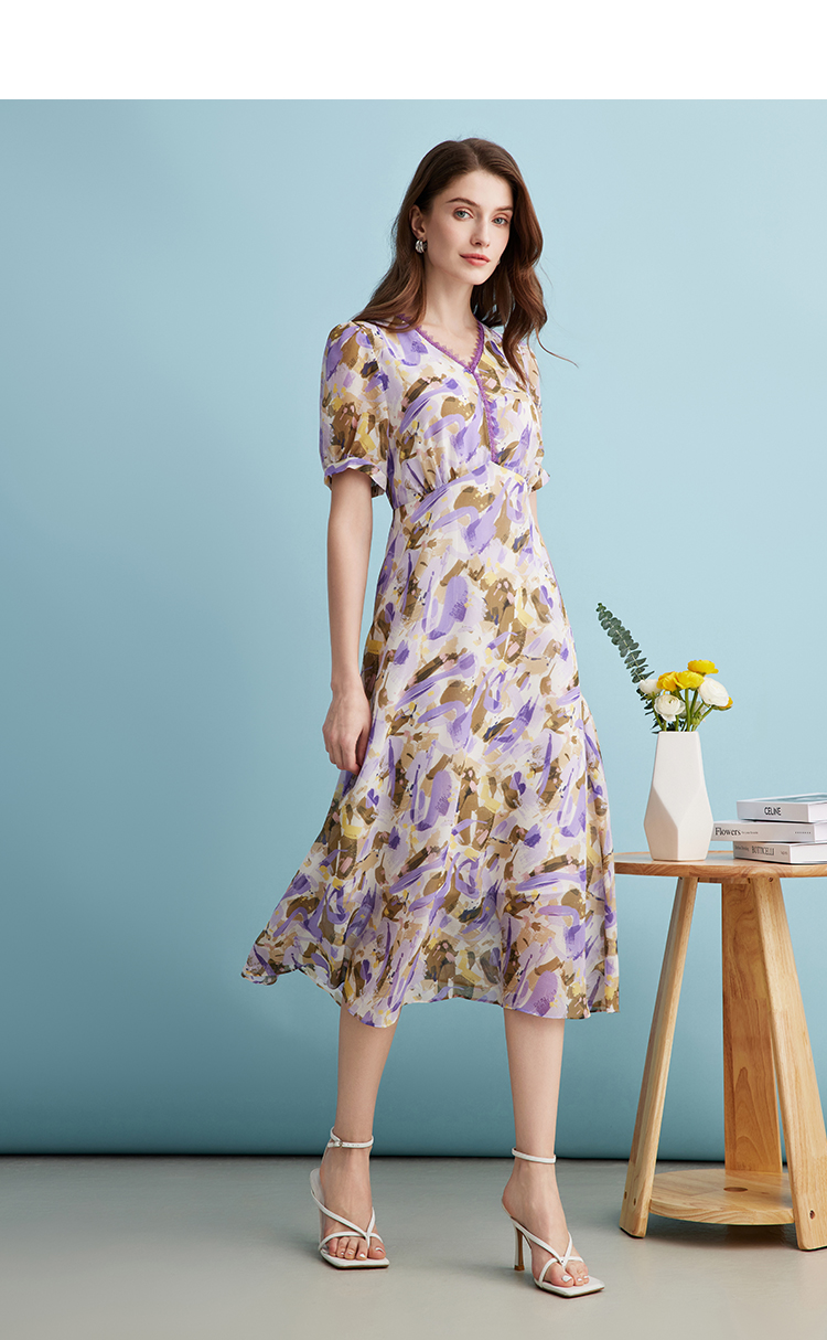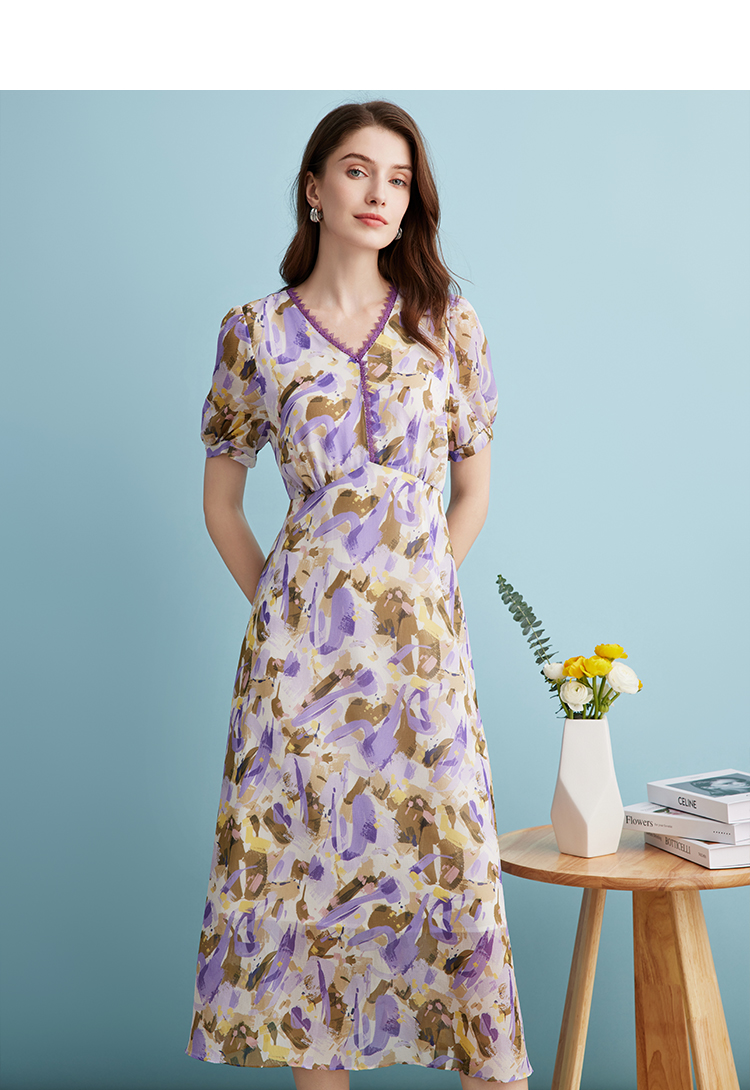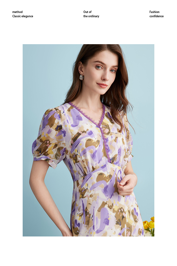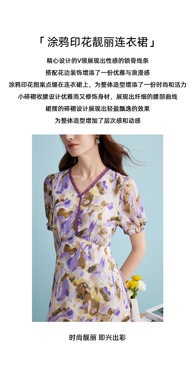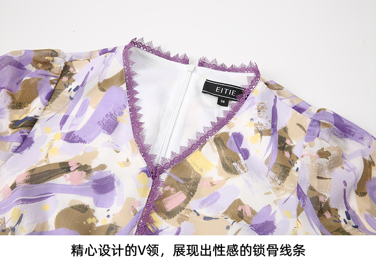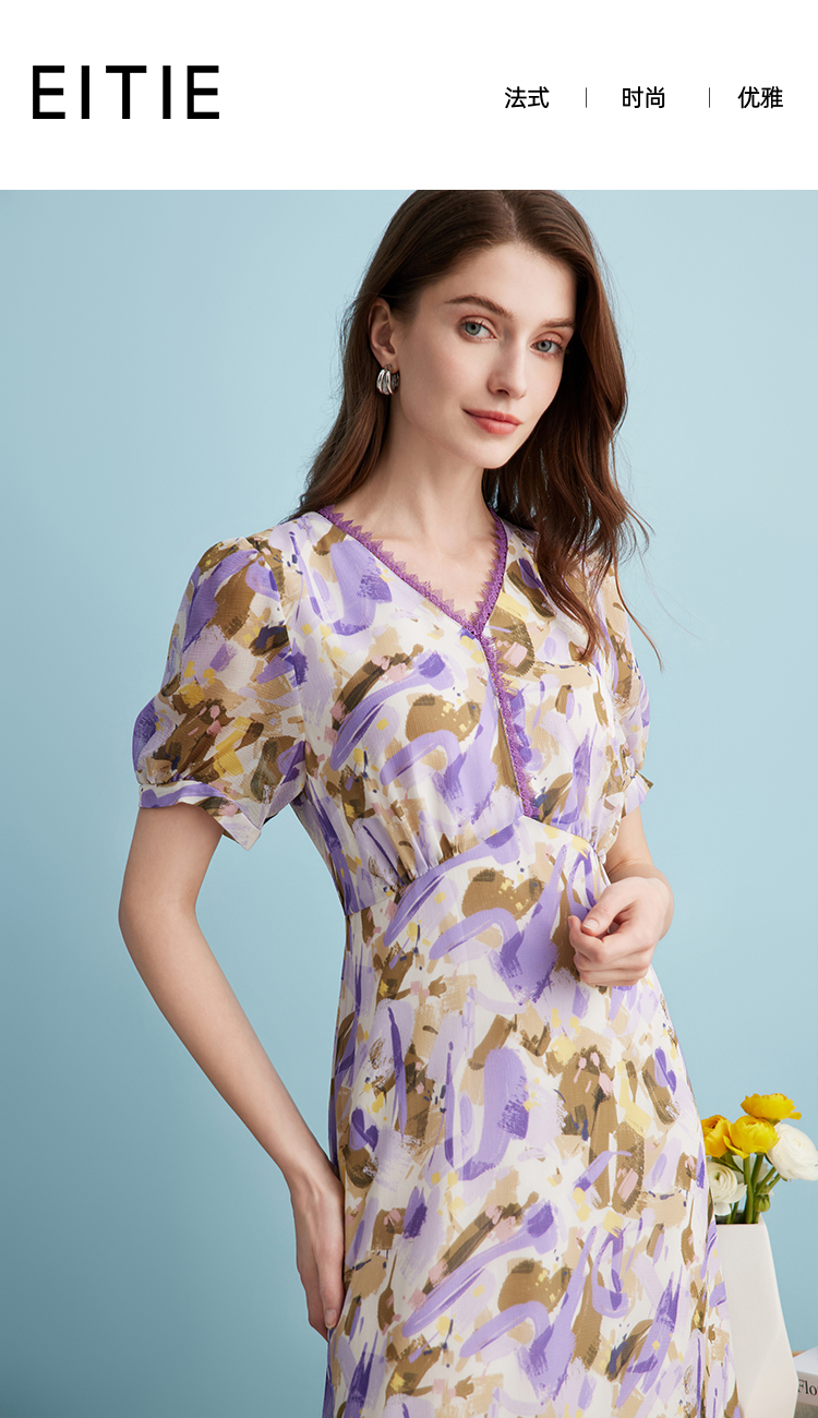 EITIE爱特爱油画印花紫色V领收腰优雅法式连衣裙夏季新款B2407316