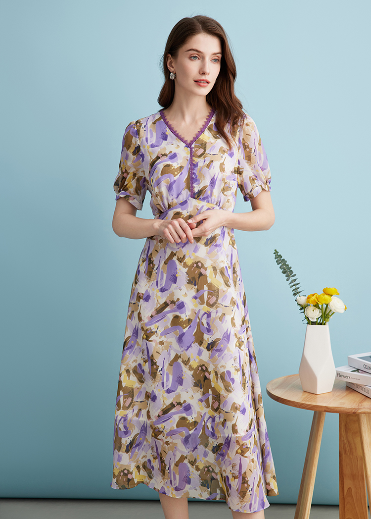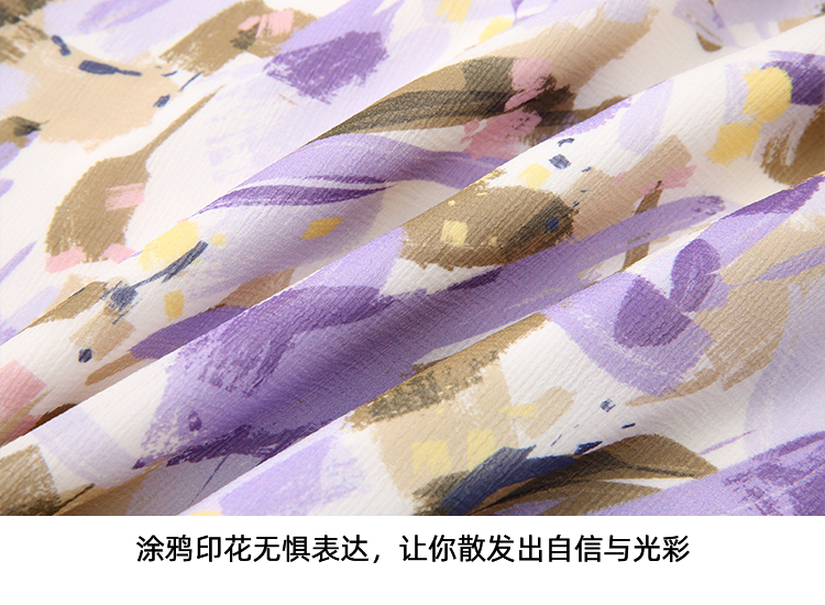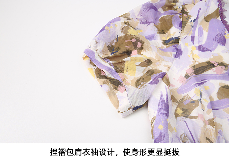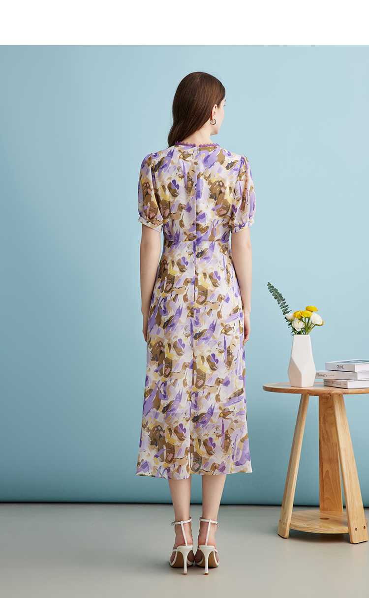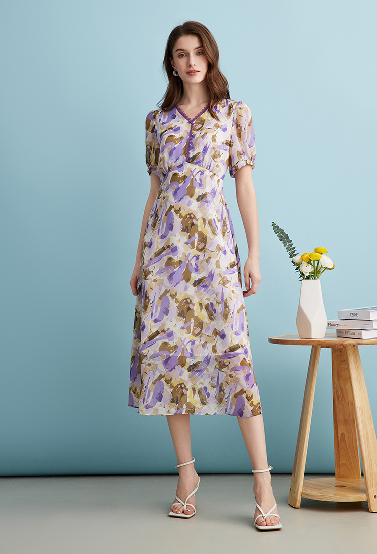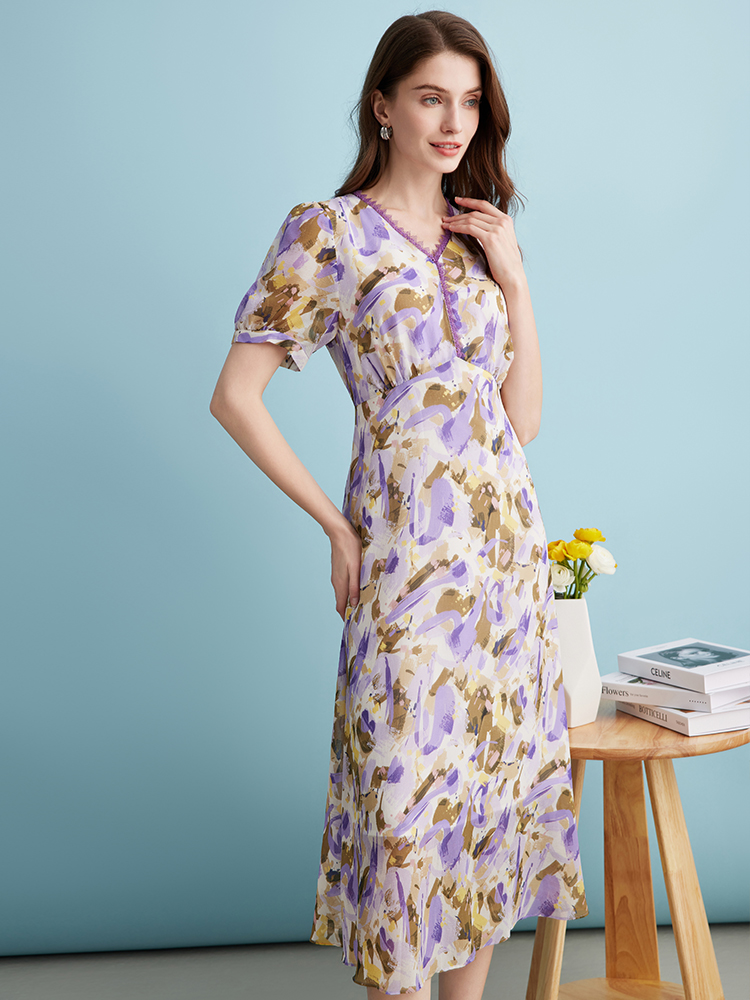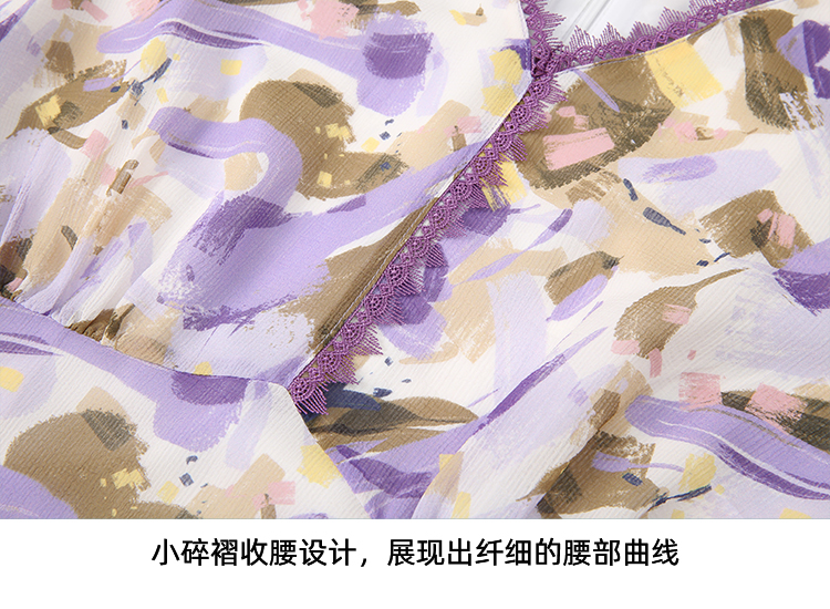 EITIE爱特爱油画印花紫色V领收腰优雅法式连衣裙夏季新款B2407316