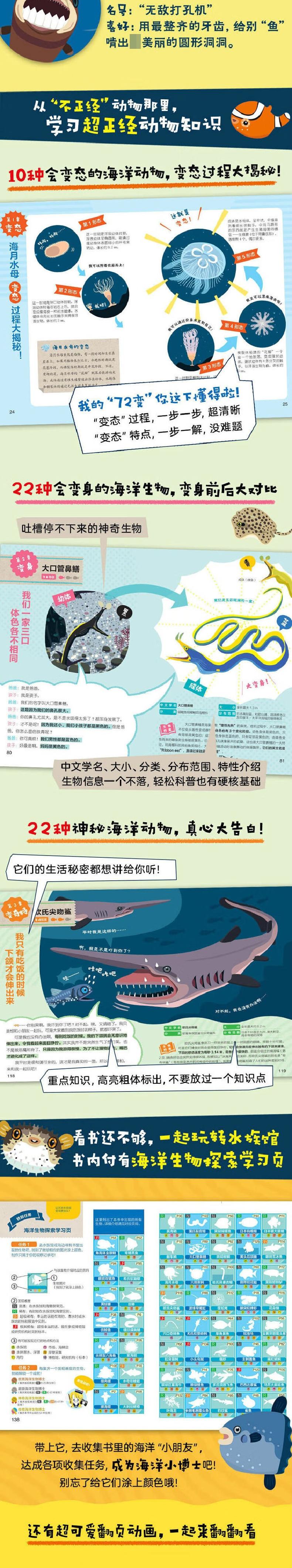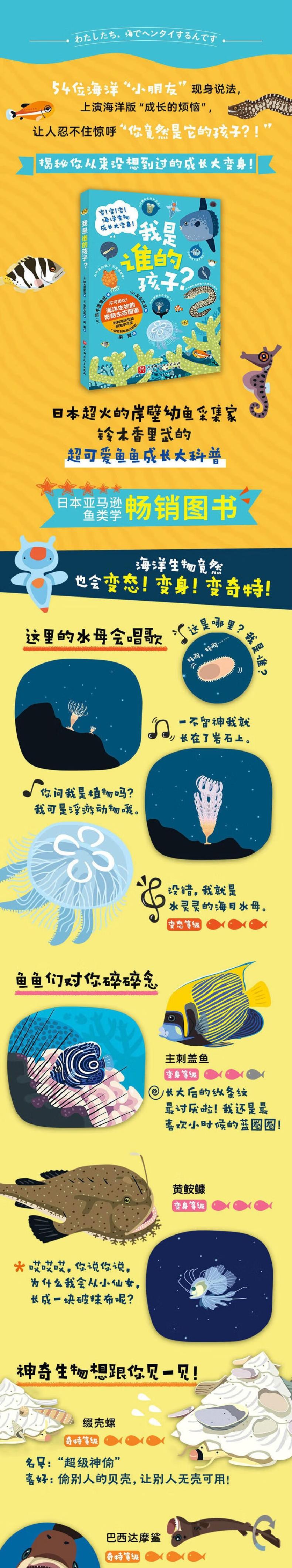 54位“海洋小朋友”们现身说法,讲述自己成长变身的大事记和各种一手“内幕”!搭配生动且让人秒懂的插画,内容与形式结合,把复杂的知识掰开揉碎讲给你!“变态”“变身”“变奇特”三大章节,让我们一窥海洋生物们为了在看似美丽、实则残酷的大海中生存下来,演化出的奇妙智慧!