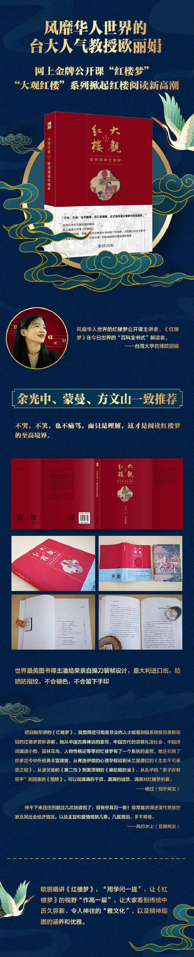 欧丽娟,台湾大学中国文学系教授,研究领域:唐诗、《红楼梦》、中国文学史。除了“大观红楼”系列之外,代表作还包括《杜诗意象论》《唐诗的乐园意识》《李商隐诗歌》《诗论红楼梦》《红楼梦人物立体论》《唐代诗歌与性别研究——以杜甫为中心》《唐诗的多维视野》《唐诗新思路》等,因台大“红楼梦”公开课获得“全球开放式课程联盟”2015年杰出教学者奖。