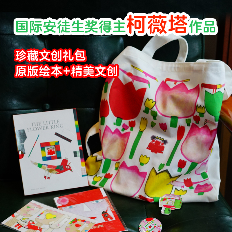 包含:英文原版绘本《 小花王》1册、彩色棉布托特包1个、亚克力冰箱贴1个、定制明信片2张、马口铁徽章1枚。