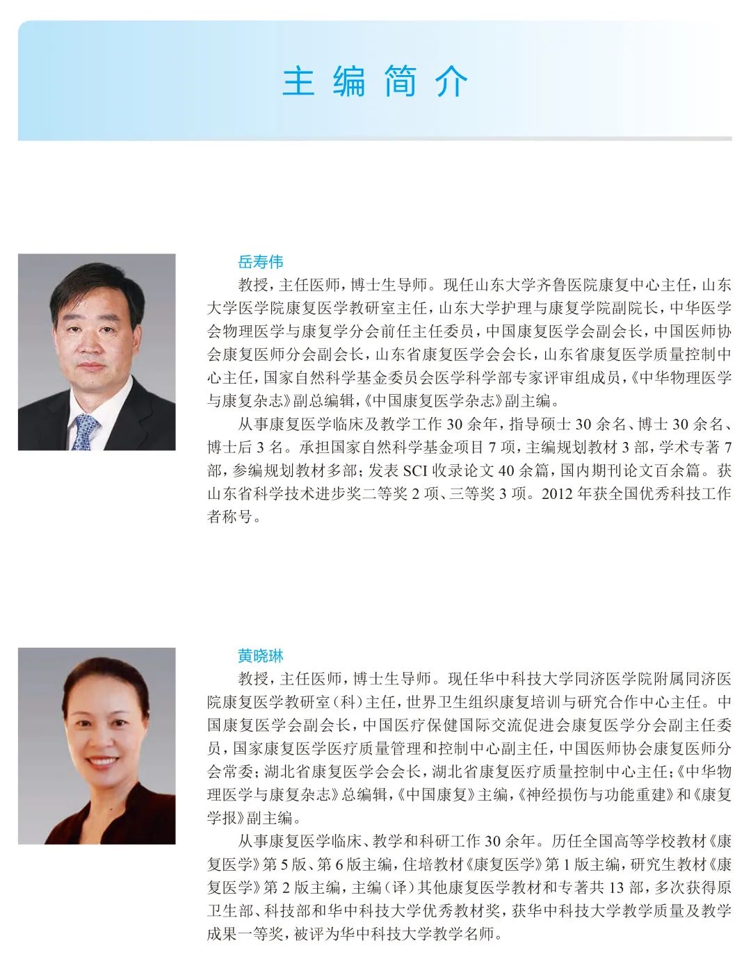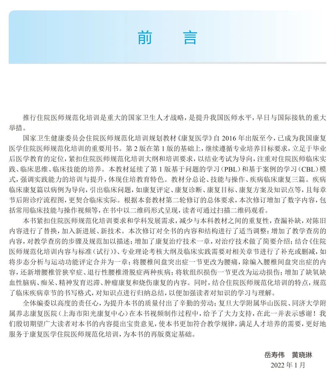 国家卫生健康委员会住院医师规范化培训规划教材《康复医学》自2016年出版至今,已成为我国康复医学住院医师规范化培训的重要用书。第2版在第1版的基础上,继续遵循专业培养目标要求,立足于毕业后医学教育的定位,紧扣住院医师规范化培训大纲和培训要求,以结业考试为导向,注重对住院医师临床实践、临床思维、临床技能的培养。本教材延续了基于问题的学习(PBL)和基于案例的学习(CBL)模式,强调实践能力的培训与提升,体现住培教育特色。教材分总论、技能与操作、疾病临床康复三篇。疾病临床康复篇以病例为导向,引出临床问题,如康复评定、康复诊断、康复目标、康复方案及知识点等,且每章节后附诊疗流程图,更契合临床实际。常用临床技能与操作视频等,在书中以二维码形式呈现,读者可通过扫描二维码观看。