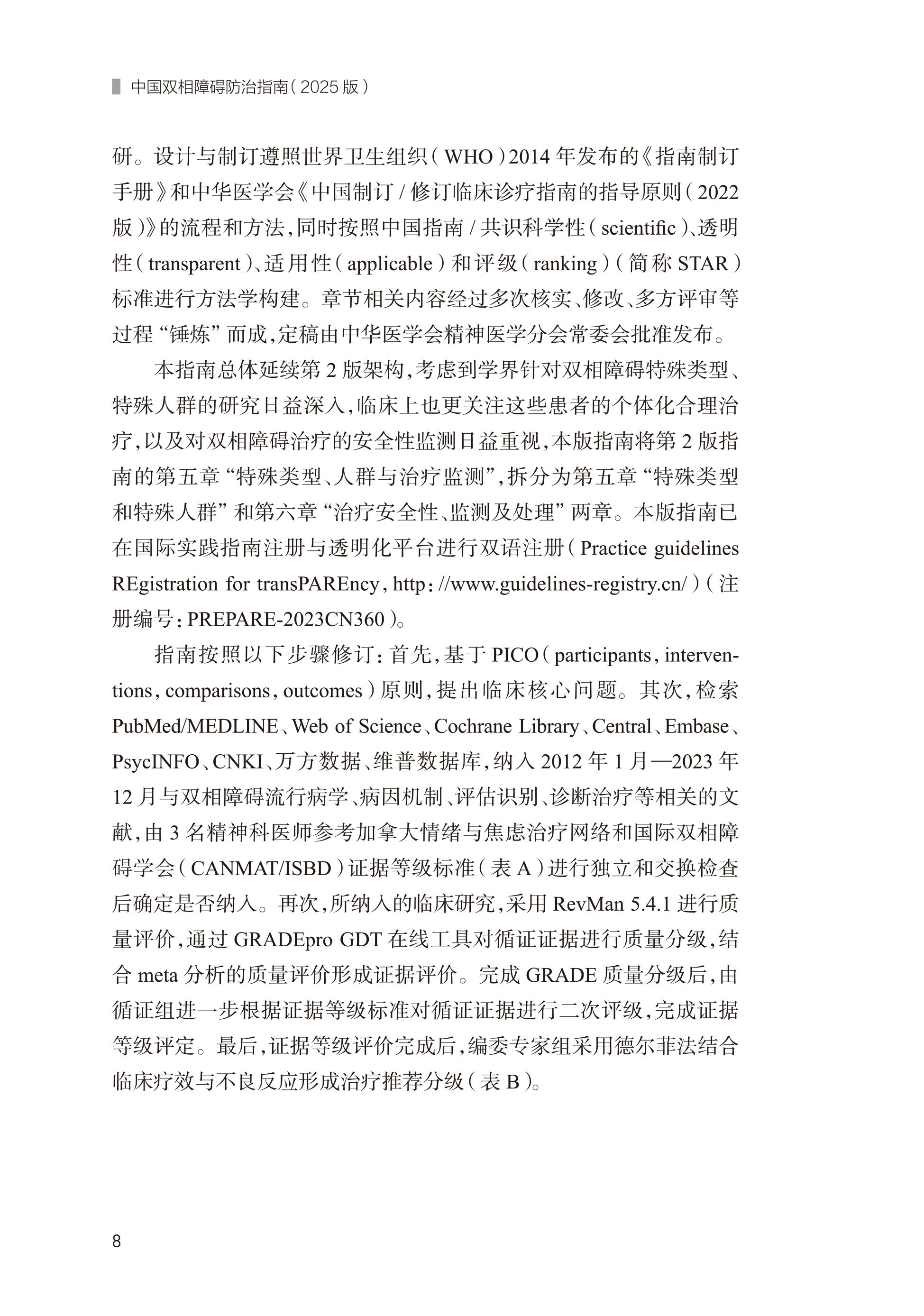 《中国双相障碍防治指南(2025版)》秉持传承与创新的理念,组建了由精神医学临床专家、循证医学专家构成的指南制订团队,严格遵照WHO《指南制订手册(2014年)》和中华医学会《中国制订/修订临床诊疗指南的指导原则(2022版)》构建方法学体系。全书紧扣双相障碍的临床诊疗流程,系统梳理临床评估、诊断与鉴别、治疗、特殊人群、治疗安全性检测及处理、疾病管理等方面关键问题,兼具实用性和严谨性,旨在为医务工作者制定双相障碍有效合理的临床决策提供重要参考依据,便于专业人员学习掌握并付诸实践。