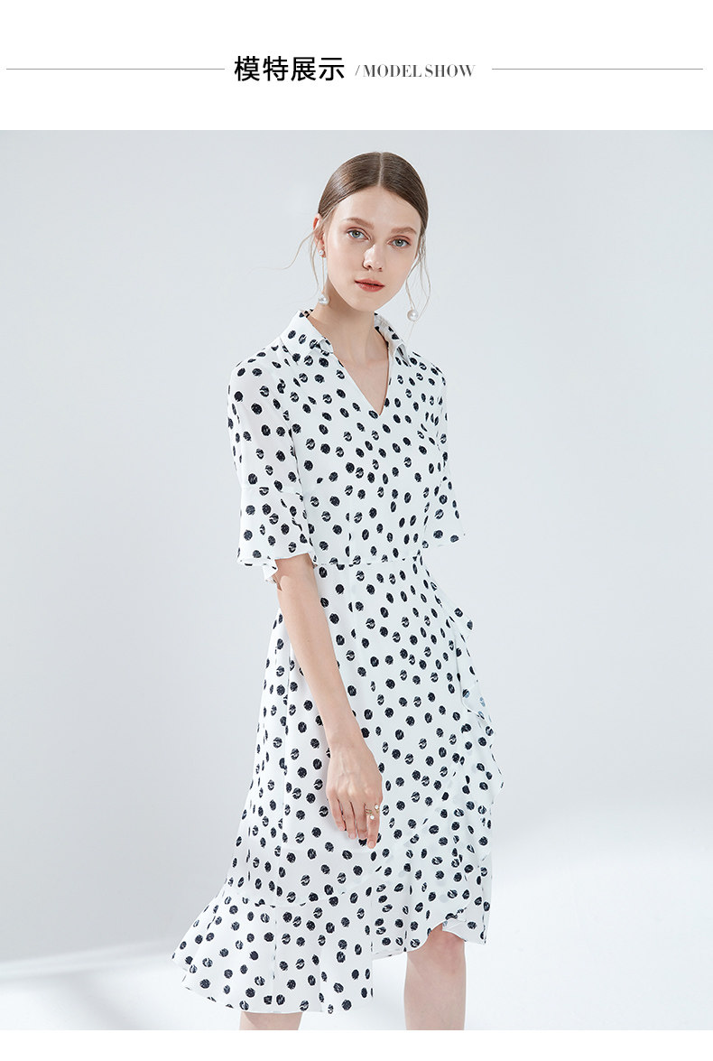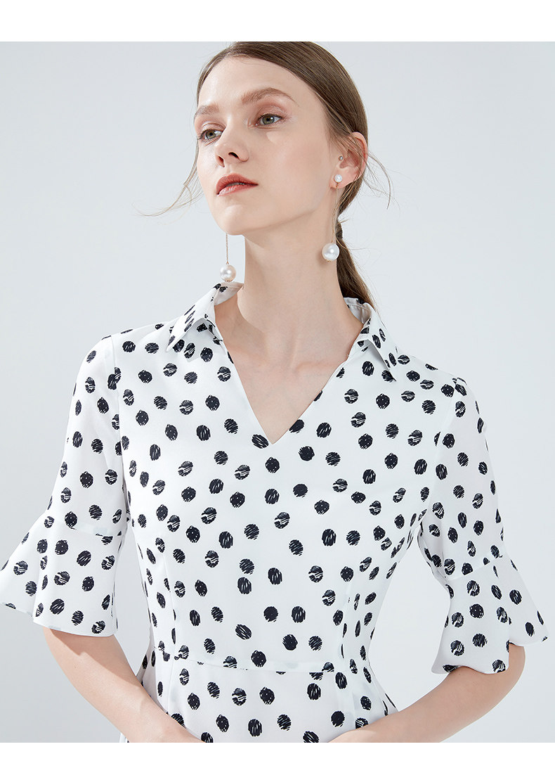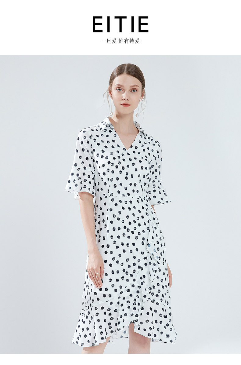EITIE爱特爱女装夏季新款V领喇叭袖收腰显瘦荷叶边波点连衣裙B1907304