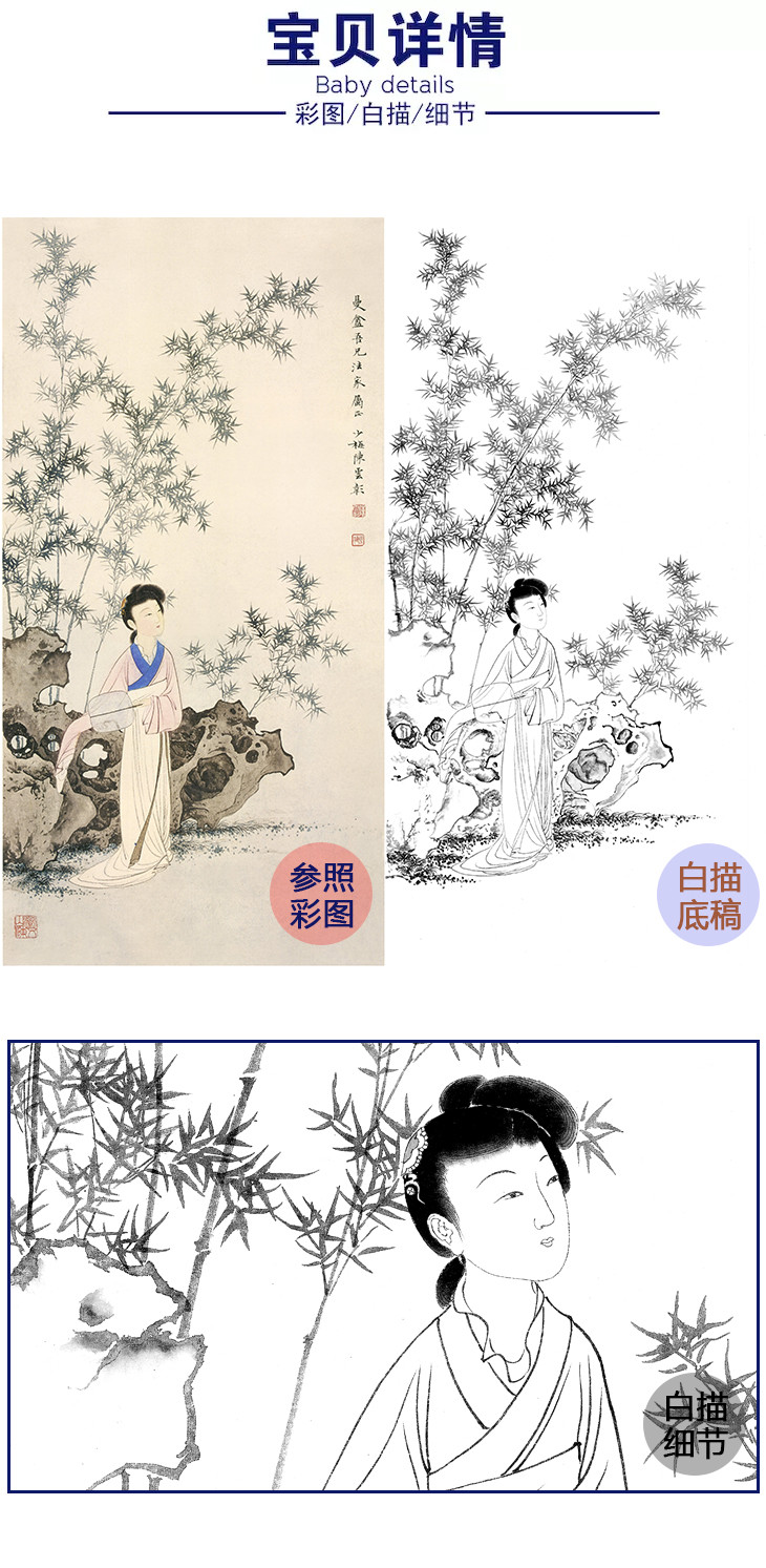 陈少梅竖幅工笔传统仕女人物白描底稿-《翠竹轻摇》-多种白描尺寸可选-CR03