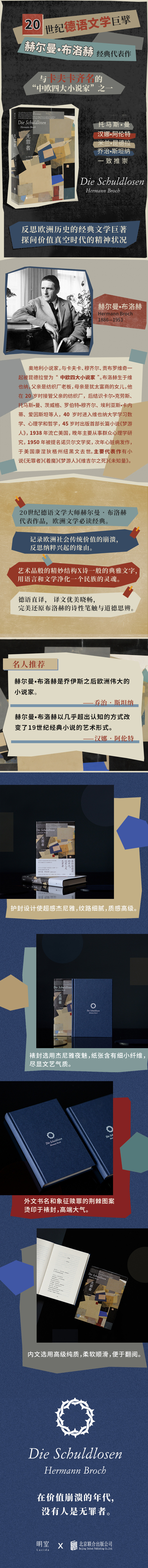 2.《无罪者》是布洛赫的代表作之一,以独特的诗体框架和诗性笔触,描写了“二战”前的德国小市民——一群有罪的无罪者——如何在传统价值崩溃的时代,陷入孤独、麻木与痛苦之中,从而导致了纳粹的崛起,是反思欧洲历史的重要文学作品。