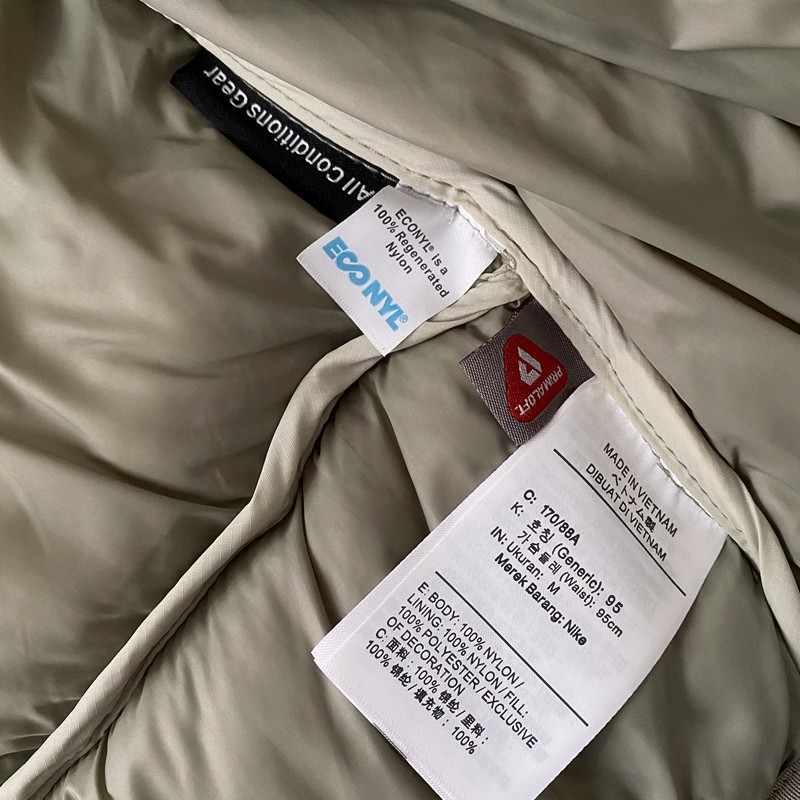 外层面料选用定制尼龙材质,叠加防泼水工艺,顺滑柔软的触感下暗藏防护力,轻松应对冬日零星雨雪;袖口与下摆的定染包边织带,不仅强化细节质感,更让版型保持利落。从胸口到侧边的精致刺绣字母,搭配立领松紧设计带来的360°包裹感,每一处裁剪、拼接与缝制都彰显复杂工艺,兼具机能属性与潮流美学。