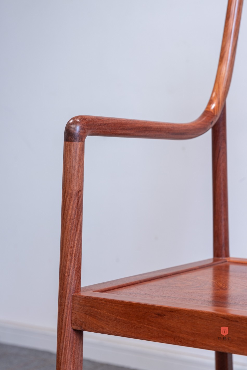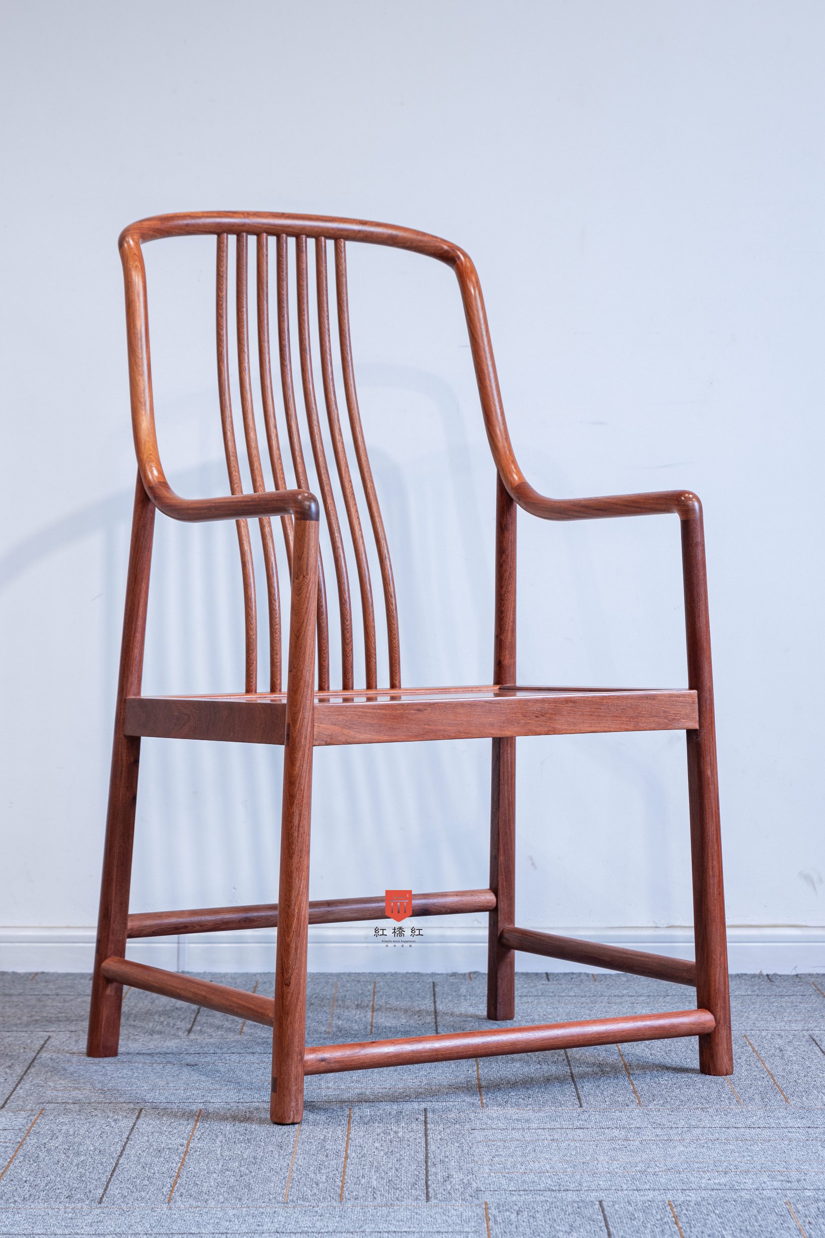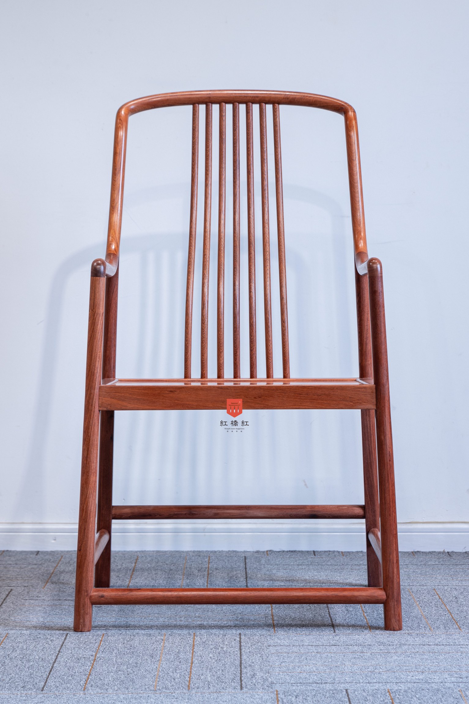 此扶手椅,风格疏朗通透,富现代气息。以缅甸花梨木制作,全器除座面为四面平的方材、腿足外圆里方外,通体框架采用圆材,整体方圆结合。三弯靠背采用曲棂式样,搭脑与扶手的线条柔婉,以烟袋锅榫结合。